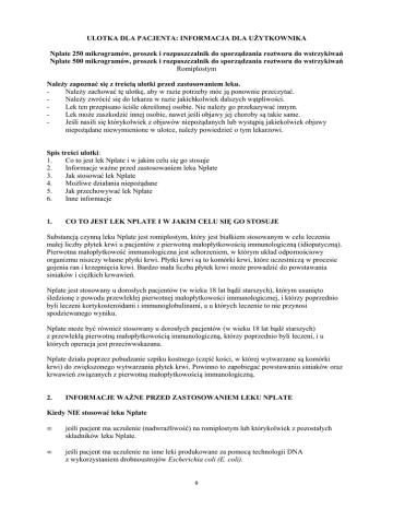 ULOTKA DLA PACJENTA: INFORMACJA DLA UŻYTKOWNIKA Nplate 250 mikrogramów, proszek i rozpuszczalnik do sporządzania roztworu do wstrzykiwań Nplate 500 mikrogramów, proszek i rozpuszczalnik do sporządzania roztworu do wstrzykiwań Romiplostym Należy zapoznać się z treścią ulotki przed zastosowaniem leku. Należy zachować tę ulotkę, aby w razie potrzeby móc ją ponownie przeczytać. Należy zwrócić się do lekarza w razie jakichkolwiek dalszych wątpliwości. Lek ten przepisano ściśle określonej osobie. Nie należy go przekazywać innym. Lek może zaszkodzić innej osobie, nawet jeśli objawy jej choroby są takie same. Jeśli nasili się którykolwiek z objawów niepożądanych lub wystąpią jakiekolwiek objawy niepożądane niewymienione w ulotce, należy powiedzieć o tym lekarzowi. Spis treści ulotki: 1. Co to jest lek Nplate i w jakim celu się go stosuje 2. Informacje ważne przed zastosowaniem leku Nplate 3. Jak stosować lek Nplate 4. Możliwe działania niepożądane 5. Jak przechowywać lek Nplate 6. Inne informacje 1. CO TO JEST LEK NPLATE I W JAKIM CELU SIĘ GO STOSUJE Substancją czynną leku Nplate jest romiplostym, który jest białkiem stosowanym w celu leczenia małej liczby płytek krwi u pacjentów z pierwotną małopłytkowością immunologiczną (idiopatyczną). Pierwotna małopłytkowość immunologiczna jest schorzeniem, w którym układ odpornościowy organizmu niszczy własne płytki krwi. Płytki krwi są to komórki krwi, które uczestniczą w procesie gojenia ran i krzepnięcia krwi. Bardzo mała liczba płytek krwi może prowadzić do powstawania siniaków i ciężkich krwawień. Nplate jest stosowany u dorosłych pacjentów (w wieku 18 lat bądź starszych), którym usunięto śledzionę z powodu przewlekłej pierwotnej małopłytkowości immunologicznej, i którzy poprzednio byli leczeni kortykosteroidami i immunoglobulinami, a u których leczenie to nie przynosi spodziewanego wyniku. Nplate może być również stosowany u dorosłych pacjentów (w wieku 18 lat bądź starszych) z przewlekłą pierwotną małopłytkowością immunologiczną, którzy poprzednio byli leczeni, i u których operacja jest przeciwwskazana. Nplate działa poprzez pobudzanie szpiku kostnego (część kości, w której wytwarzane są komórki krwi) do zwiększonego wytwarzania płytek krwi. Powinno to zapobiegać powstawaniu siniaków oraz krwawień związanych z pierwotną małopłytkowością immunologiczną. 2. INFORMACJE WAŻNE PRZED ZASTOSOWANIEM LEKU NPLATE Kiedy NIE stosować leku Nplate • jeśli pacjent ma uczulenie (nadwrażliwość) na romiplostym lub którykolwiek z pozostałych składników leku Nplate. • jeśli pacjent ma uczulenie na inne leki produkowane za pomocą technologii DNA z wykorzystaniem drobnoustrojów Escherichia coli (E. coli). 9 Kiedy zachować szczególną ostrożność stosując Nplate • Jeśli przyjmowanie leku Nplate zostanie przerwane, to istnieje prawdopodobieństwo, że nastąpi nawrót małopłytkowości (małej liczby płytek krwi). Jeśli przyjmowanie leku Nplate zostanie przerwane, to konieczne będzie kontrolowanie liczby płytek krwi u pacjenta. Lekarz prowadzący powinien omówić z pacjentem odpowiednie środki ostrożności. • Jeśli u pacjenta występuje ryzyko tworzenia się skrzepów krwi lub jeśli skrzepy krwi często występują w rodzinie pacjenta. Ryzyko tworzenia się skrzepów krwi może być również zwiększone, jeśli: pacjent ma zaburzenia czynności wątroby; pacjent jest osobą w podeszłym wieku; pacjent jest osobą leżącą; pacjent ma nowotwór złośliwy; pacjentka zażywa tabletki antykoncepcyjne lub stosuje hormonalną terapię zastępczą; pacjent w ostatnim czasie przeszedł operację lub doznał urazu; pacjent jest osobą otyłą (z nadwagą); pacjent jest osobą palącą. Jeśli którakolwiek z tych sytuacji ma miejsce, należy powiedzieć o tym lekarzowi przed przyjęciem leku Nplate. Jeśli pacjent ma bardzo dużą liczbę płytek krwi, może to zwiększyć ryzyko nadmiernego krzepnięcia krwi. Lekarz prowadzący dostosuje dawkę leku Nplate dla pacjenta, aby nie dopuścić do zbytniego zwiększenia liczby płytek krwi. Zmiany w szpiku kostnym (zwiększenie ilości włókien retykulinowych i możliwe zwłóknienie szpiku kostnego) Długoterminowe stosowanie leku Nplate może spowodować zmiany w szpiku kostnym. Zmiany te mogą prowadzić do powstawania nieprawidłowych komórek krwi lub zmniejszenia ich liczby. Łagodnym przejawem zmian w szpiku jest zwiększenie ilości włókien retykulinowych; zostało to zaobserwowane w badaniach klinicznych z lekiem Nplate. Nie wiadomo czy zmiany te mogą prowadzić do cięższej postaci, jaką jest zwłóknienie. Zmiany w szpiku kostnym mogą zostać zauważone jako nieprawidłowości w badaniach krwi. Lekarz zadecyduje, czy z powodu tych nieprawidłowości powinno się wykonać badania szpiku czy zaprzestać stosowania leku Nplate. Progresja nowotworów krwi Lekarz może zdecydować o wykonaniu biopsji szpiku kostnego, aby potwierdzić rozpoznanie pierwotnej małopłytkowości immunologicznej i wykluczyć występowanie innej choroby, np. MDS (zespołów mielodysplastycznych). Jeśli u pacjenta zdiagnozowano zespoły mielodysplastyczne oraz pacjent otrzymuje Nplate, może u niego wystąpić zwiększona liczba komórek blastycznych oraz nastąpić progresja zespołów mielodysplastycznych do ostrej białaczki szpikowej. Utrata odpowiedzi na romiplostym Jeśli wystąpi utrata odpowiedzi na romiplostym lub niepowodzenie utrzymania odpowiedzi płytkowej podczas leczenia romiplostymem, lekarz postara się znaleźć przyczyny, dlaczego tak się dzieje. Przyczyną może być zwiększenie ilości włókien retykulinowych lub powstanie przeciwciał neutralizujących działanie romiplostymu. Nplate nie jest zalecany do stosowania u pacjentów poniżej 18 lat. 10 Stosowanie innych leków Należy powiedzieć lekarzowi o wszystkich przyjmowanych aktualnie lu