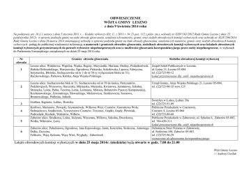 OBWIESZCZENIE WÓJTA GMINY LESZNO z dnia 9 kwietnia 2014 roku Na podstawie art. 16 § 1 ustawy z dnia 5 stycznia 2011 r. – Kodeks wyborczy (Dz. U. z 2011 r. Nr 21 poz. 112 z późn. zm.), uchwały nr XXIV/161/2012 Rady Gminy Leszno z dnia 25 października 2012r. w sprawie podziału gminy na stałe obwody głosowania, ustalenia ich numerów, granic oraz siedzib obwodowych komisji wyborczych oraz uchwały nr XLIV/296/2014 Rady Gminy Leszno z dnia 26 marca 2014 zmieniającej uchwałę w sprawie podziału gminy na stałe obwody głosowania, ustalenia ich numerów, granic oraz siedzib obwodowych komisji wyborczych podaję do publicznej wiadomości informację o numerach i granicach obwodów głosowania, siedzibach obwodowych komisji wyborczych oraz lokalach obwodowych komisji wyborczych przystosowanych do potrzeb wyborców niepełnosprawnych oraz o możliwości głosowania korespondencyjnego przez osoby niepełnosprawne, w wyborach do Parlamentu Europejskiego zarządzonych na dzień 25 maja 2014 roku. Nr obwodu 1 2 3 4 5 6 Granice obwodu głosowania Siedziba obwodowej komisji wyborczej Leszno ulice: Widokowa, Wspólna, Wąska, Reginy, Marysieńki, Mariana, Otuliny, Podzaborówek, Hubala-Dobrzańskiego, Warszawska, Ogrodowa, Piekarska, Sokołowska, Lipowa, Fabryczna, Inżynierska, Błońska, Sochaczewska od nr 1 do nr 58 (z wyłączeniem bloku nr 51), Raczkowskiego, Parkowa, Krótka, Aleja Wojska Polskiego. Zespół Szkół Publicznych w Lesznie, ul. Leśna 13, Leszno 05-084 tel. (22)725-80-12 Lokal przystosowany dla osób niepełnosprawnych Leszno ulice: Sochaczewska blok nr 51, Sochaczewska od nr 59 do końca, Partyzantów, Podchorążych, Wrzosowa, Harcerska, Młynarska, Murarska, Kwiatowa, Jaśminowa, Szkolna, Strażacka, Leśna, Polna, Tuwima, Lema, Leśmiana, Miłosza, Bohaterów Puszczy Kampinoskiej, Kochanowskiego, Żeromskiego, Słowackiego, Mickiewicza, Sienkiewicza, Sosnowa, Broniewskiego, Podleśna, Julinek. Urząd Gminy, Aleja Wojska Polskiego 21, Leszno 05-084, tel. (22)725-90-35 wew.125 Świetlica w Łubcu, Łubiec 29a tel. (22)725-91-09 Korfowe, Marianów, Powązki, Szymanówek, Wilkowa Wieś, Czarnów, Gawartowa Wola, Publiczne Przedszkole w Czarnowie, Stelmachowo, Szadkówek, Towarzystwo Czarnów, Trzciniec, Grądki, Grądy, Plewniak, Czarnów 8, Leszno 05-084 Podrochale, Rochale, Walentów, Wilków. tel. (22)725-80-68 Zaborów ulice: Środkowa, Leśna, Jesienna, Wiosenna, Willowa, Szkolna, Dworkowa, Publiczne Przedszkole w Zaborowie, ul. Szkolna 6, Zaborów 05-083, Wólka, Wiktorów, Ławy. tel. 784-650-311 Lokal przystosowany dla osób niepełnosprawnych Zaborów ulice: Południowa, Ogrodowa, Jana Kujawskiego, Janin, Kościelna, Stołeczna, Antoniego Ochotnicza Straż Pożarna w Zaborowie, Dałka, Zaciszna, ul. Stołeczna 180, Zaborów 05-083 Feliksów, Wąsy Kolonia, Wąsy Wieś, Wyględy, Zaborówek tel. (22)725-96-29 wyznaczony do głosowania korespondencyjnego Grabina, Kępiaste, Łubiec, Roztoka. Lokale obwodowych komisji wyborczych w dniu 25 maja 2014r. (niedziela) będą otwarte w godz. 7.00 do 21.00 Wójt Gminy Leszno /-/ Andrzej Cieślak