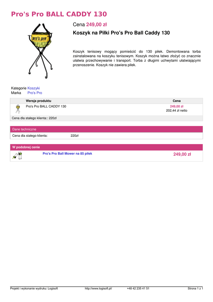 Pro's Pro BALL CADDY 130 Cena 249,00 zł Koszyk na Piłki Pro's Pro Ball Caddy 130 Koszyk tenisowy mogący pomieścić do 130 piłek. Demontowana torba zainstalowana na koszyku tenisowym. Koszyk można łatwo złożyć co znacznie ułatwia przechowywanie i transport. Torba z długimi uchwytami ułatwiającymi przenoszenie. Koszyk nie zawiera piłek. Kategorie Koszyki Marka Pro's Pro Wersja produktu Cena Pro's Pro BALL CADDY 130 249,00 zł 202,44 zł netto Cena dla stałego klienta:: 220zł Dane techniczne Cena dla stałego klienta: 220zł W podobnej cenie 249,00 zł Pro's Pro Ball Mower na 85 piłek Projekt i wykonanie wydruku: Logisoft Powered by TCPDF (www.tcpdf.org) http://www.logisoft.pl/ +48 42 235 41 51 Strona 1 z 1