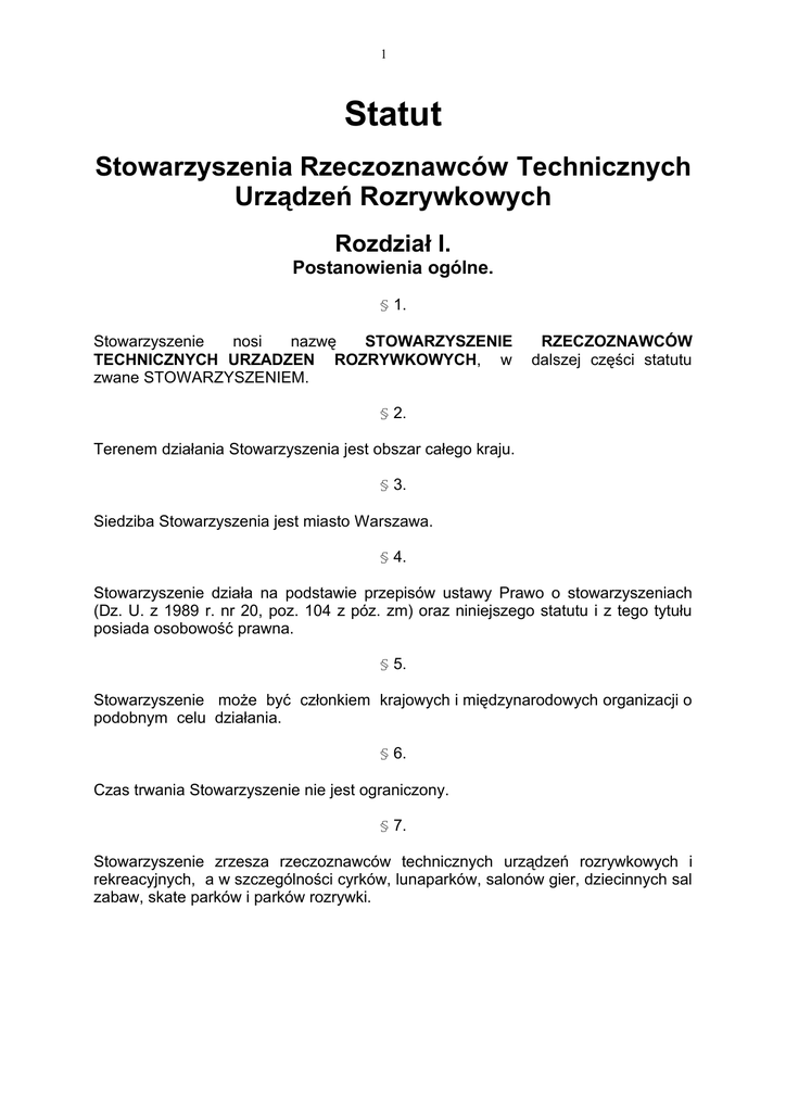 1 Statut Stowarzyszenia Rzeczoznawców Technicznych Urządzeń Rozrywkowych Rozdział I. Postanowienia ogólne. § 1. Stowarzyszenie nosi nazwę STOWARZYSZENIE TECHNICZNYCH URZADZEN ROZRYWKOWYCH, w zwane STOWARZYSZENIEM. RZECZOZNAWCÓW dalszej części statutu § 2. Terenem działania Stowarzyszenia jest obszar całego kraju. § 3. Siedziba Stowarzyszenia jest miasto Warszawa. § 4. Stowarzyszenie działa na podstawie przepisów ustawy Prawo o stowarzyszeniach (Dz. U. z 1989 r. nr 20, poz. 104 z póz. zm) oraz niniejszego statutu i z tego tytułu posiada osobowość prawna. § 5. Stowarzyszenie może być członkiem krajowych i międzynarodowych organizacji o podobnym celu działania. § 6. Czas trwania Stowarzyszenie nie jest ograniczony. § 7. Stowarzyszenie zrzesza rzeczoznawców technicznych urządzeń rozrywkowych i rekreacyjnych, a w szczególności cyrków, lunaparków, salonów gier, dziecinnych sal zabaw, skate parków i parków rozrywki. 2 § 8. Stowarzyszenie zatrudnionych. opiera swoja działalność na pracy członków § 9. 1. Stowarzyszenie używa pieczęci owalnej z napisem „Stowarzyszenie Rzeczoznawców Technicznych Urządzeń Rozrywkowych”. 2. Stowarzyszenie może ustalić godło i odznakę Stowarzyszenia. oraz osób 3 Rozdział II. Cele i formy działania. § 10. Celem Stowarzyszenia jest dążenie do profesjonalnej obsługi technicznych urządzeń rozrywkowych cyrków, lunaparków, salonów gier, dziecinnych sal zabaw, skate parków i parków rozrywki, doskonalenie zawodowe członków Stowarzyszenia, wyrażanie ich dążeń i interesów, czuwanie nad poziomem etycznym rzeczoznawców, krzewienie solidarności zawodowej oraz reprezentowanie potrzeb środowiska rzeczoznawców technicznych urządzeń rozrywkowych wobec władz państwowych, samorządowych, gospodarczych i organizacji społecznych. § 11. 1. Stowarzyszenie realizuje swoje cele w szczególności poprzez: a) przestrzeganie zasad etyki zawodowej i egzekwowanie ich przestrzegania, b) dbanie o wysoki poziom etyczny i kwalifikacje członków Stowarzyszenia, c) inicjowanie badań, rozwiązań i projektów służących polepszeniu bezpieczeństwa użytkowania urządzeń rozrywkowych, będących przedmiotem zainteresowania Stowarzyszenia, d) szkolenie operatorów i właścicieli lunaparków, sal zabaw, skate parków itp., w zakresie bezpieczeństwa eksploatacji technicznych urządzeń rozrywkowych, e) szkolenie i doszkalanie rzeczoznawców technicznych urządzeń rozrywkowych w zakresie obowiązującego prawa w Polsce i Unii Europejskiej, dotyczącego bezpieczeństwa eksploatacji technicznych urządzeń rozrywkowych, f) współprace z zakresie rozwiązań prawnych, technicznych i organizacyjnych dotyczących przedmiotowej działalności Stowarzyszenia z ośrodkami naukowo – technicznymi w kraju i za granica oraz z Urzędem Dozoru Technicznego g) wydawanie materiałów szkoleniowych. Pomoc w tworzeniu niezbędnej dokumentacji technicznej i techniczno-ruchowej oraz innej dokumentacji pomocnej w utrzymaniu wysokiego poziomu bezpieczeństwa użytkowania urządzeń rozrywkowych. h) udzielanie członkom pomocy prawnej i zawodowej, i) roztaczanie opieki merytorycznej nad kandydatami i początkującymi rzeczoznawcami technicznych urządzeń rozrywkowych. 4 Rozdział III. Członkowie, ich prawa i obowiązki. § 12. Członkowie Stowarzyszenia dzieła się na: 1. Członków zwyczajnych, 2. wspierających, 3. honorowych. § 13. Członkiem zwyczajnym – rzeczoznawca stowarzyszenia może być osoba z wyższym wykształceniem technicznym, posiadająca obywatelstwo Rzeczypospolitej Polskiej, posiadająca co najmniej 5 letnia praktykę w zakresie projektowania, odbiorów technicznych lub eksploatacji technicznych urządzeń rozrywkowych, która zadeklaruje chęć przystąpienia i zostanie przyjęta uchwala Zarządu Stowarzyszenia. Kandydat na członka zwyczajnego, uzyskać pisemna rekomendacje dwóch członków zwyczajnych. § 14. Członkiem wspierającym może być osoba fizyczna, popierająca cele i za-dania Stowarzyszenia. Członkiem wspierającym może zostać osoba posiadająca pisemna rekomendacje co najmniej dwóch członków Stowarzyszenia. Członkowie wspierający maja prawo brać udział w pracach Stowarzyszenia z głosem doradczym. Nie posiadają czynnego i biernego prawa wyborczego § 15. Godność członka honorowego nadaje Walne Zebranie Członków osobom wybitnie zasłużonym dla Stowarzyszenia lub za działalność w zakresie teorii lub praktyki dotyczącej bezpieczeństwa eksploatacji technicznych urządzeń rozrywkowych. Kandydat na członka honorowego Stowarzyszenia musi uzyskać pisemna aprobatę co najmniej 5 członków zwyczajnych Stowarzyszenia. Członkowie honorowi Stowarzyszenia maja prawo korzystania z urządzeń, świadczeń, usług i pomocy Stowarzyszenia. Maja prawo wybierać i być wybieranym do władz Stowarzyszenia. § 16. Członek zwyczajny Stowarzyszenia ma obowiązek: 1. Ścisłego przestrzegania statutu, stosowania się do uchwal władz Stowarzyszenia i wprowadzania ich w życie. 2. Brania czynnego udziału w działalności Stowarzyszenia, w tym obowiązkowe jest uczestnictwo w Walnym Zebraniu Członków. 5 3. Wykonywania działalności rzeczoznawcy technicznych urządzeń rozrywkowych na wysokim profesjonalnym poziomie, przestrzegania etyki zawodowej, godnego reprezentowania środowiska rzeczoznawców technicznych urządzeń rozrywkowych. 4. Brać udział w szkoleniach, oraz służyć pomocą fachowa kandydatom na rzeczoznawców technicznych urządzeń rozrywkowych. § 17. Utratę członkostwa zwyczajnego następuje poprzez: a) rezygnacje zgłoszona na piśmie zarządowi Stowarzyszenia, b) skreślenie z listy członków z powodu nie uiszczenia składek przez okres kolejnych 6 miesięcy, po uprzednim zawiadomieniu z ostrzeżeniem, c) skreślenie z listy członków z powodu nieusprawiedliwionej nieobecności na dwóch kolejnych Walnych Zebraniach Członków, d) wykluczenie orzeczeniem Sądu 