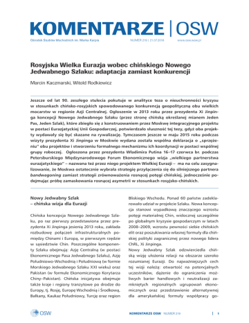 Ośrodek Studiów Wschodnich im. Marka Karpia NUMER 219 | 21.07.2016 www.osw.waw.pl Rosyjska Wielka Eurazja wobec chińskiego Nowego Jedwabnego Szlaku: adaptacja zamiast konkurencji Marcin Kaczmarski, Witold Rodkiewicz Jeszcze od lat 90. zeszłego stulecia pokutuje w analityce teza o nieuchronności kryzysu w stosunkach chińsko-rosyjskich spowodowanego konkurencją geopolityczną obu wielkich mocarstw w regionie Azji Centralnej. Ogłoszenie w 2013 roku przez prezydenta Xi Jinpinga koncepcji Nowego Jedwabnego Szlaku (przez stronę chińską określanej mianem Jeden Pas, Jeden Szlak), które zbiegło się z konstruowaniem przez Moskwę integracyjnego projektu w postaci Eurazjatyckiej Unii Gospodarczej, potwierdzało słuszność tej tezy, gdyż oba projekty wydawały się być skazane na rywalizację. Tymczasem jeszcze w maju 2015 roku podczas wizyty prezydenta Xi Jinpinga w Moskwie wydana została wspólna deklaracja o „sprzężeniu” obu projektów i stworzeniu formalnego mechanizmu ich koordynacji w postaci wspólnej grupy roboczej. Ogłoszona przez prezydenta Władimira Putina 16–17 czerwca br. podczas Petersburskiego Międzynarodowego Forum Ekonomicznego wizja „wielkiego partnerstwa eurazjatyckiego” – nazwana też przez niego projektem Wielkiej Eurazji – ma na celu zasygnalizowanie, że Moskwa ostatecznie wybrała strategię przyłączenia się do silniejszego partnera bandwagoning zamiast strategii zrównoważenia rosnącej potęgi chińskiej, jednocześnie podejmując próbę zamaskowania rosnącej asymetrii w stosunkach rosyjsko-chińskich. Nowy Jedwabny Szlak – chińska wizja dla Eurazji Chińska koncepcja Nowego Jedwabnego Szlaku, po raz pierwszy przedstawiona przez prezydenta Xi Jinpinga jesienią 2013 roku, zakłada rozbudowę połączeń infrastrukturalnych pomiędzy Chinami i Europą, w pierwszym rzędzie w sąsiedztwie Chin. Poszczególne komponenty Szlaku obejmują: Azję Centralną (w postaci Ekonomicznego Pasa Jedwabnego Szlaku), Azję Południowo-Wschodnią i Południową (w formie Morskiego Jedwabnego Szlaku XXI wieku) oraz Pakistan (w formule Ekonomicznego Korytarza Chiny–Pakistan). Chińska inicjatywa obejmuje także kraje i regiony tranzytowe po drodze do Europy, tj. Rosję, Europę Wschodnią i Środkową, Bałkany, Kaukaz Południowy, Turcję oraz region Bliskiego Wschodu. Ponad 60 państw zadeklarowało udział w projekcie Szlaku. Nowa koncepcja stanowi wypadkową znaczącego wzrostu potęgi materialnej Chin, widocznej szczególnie po globalnym kryzysie gospodarczym w latach 2008–2009, wzrostu pewności siebie chińskich elit oraz poszukiwania własnej formuły dla chińskiej polityki zagranicznej przez nowego lidera ChRL, Xi Jinpinga. Nowy Jedwabny Szlak odzwierciedla chińską wizję ułożenia relacji na obszarze szeroko rozumianej Eurazji. Do najważniejszych cech tej wizji należą: otwartość na potencjalnych uczestników, dążenie do ograniczenia możliwych barier handlowych i neutralizacji zamkniętych regionalnych ugrupowań ekonomicznych oraz przedstawienie alternatywnej dla amerykańskiej formuły współpracy go- KOMENTARZE OSW NUMER 219 1 spodarczej i rozwojowej z mniejszymi państwami. Jednocześnie, za pomocą inicjatywy Nowego Jedwabnego Szlaku, Chiny dążą do budowy trwałych wpływów w państwach swojego sąsiedztwa, które byłyby niezależne od potencjalnych zmian wewnętrznych. Celem chińskiego projektu Nowego Jedwabnego Szlaku jest ułatwienie chińskiej ekspansji gospodarczej i utrzymanie otwartości rynków zewnętrznych na chiński handel i inwestycje. Nowy Jedwabny Szlak pozostaje bardzo ogólnym projektem, zinstytucjonalizowanym w bardzo małym stopniu. Dotąd utworzono jedynie narzędzia finansowania projektów w ramach Szlaku. Powołano jednostronny (tj. chiński) Fundusz Nowego Jedwabnego Szlaku. Utworzono też wielostronny Azjatycki Bank Inwestycji Infrastrukturalnych (AIIB), który ma służyć jako dodatkowe narzędzie finansowania projektów w ramach Szlaku. W konsekwencji można oczekiwać, że Szlak będzie służył celom dyplomacji publicznej, nadając chińskiej polityce pozory wielostronności, zaś duża część chińskiej aktywności będzie dalej prowadzona w elastycznej formule stosunków dwustronnych. Pod hasłem budowy Nowego Jedwabnego Szlaku Chiny realizują szereg przedsięwzięć inwestycyjnych, w pierwszym rzędzie w infrastrukturę transportową (linie kolejowe w krajach Azji Centralnej, porty morskie w Azji Południowo-Wschodniej) i energetyczną (elektrownie w Pakistanie). Większość kredytów udzielonych przez chińskie banki państwowe w ciągu ostatnich trzech lat trafiła do uczestników projektu Nowego Jedwabnego Szlaku. Taka formuła Nowego Jedwabnego Szlaku odzwierciedla funkcjonalne rozumienie wpływów przez chińskie elity. Pekinowi Szlak ma umożliwić gospodarczą ekspansję i utrzymać zewnętrzne rynki otwartymi dla chińskiego handlu i inwestycji. Ma on także pomóc obejść inicjatywy regionalne, takie jak kontrolowana przez Rosję Eurazjatycka Unia Gospodarcza, które mogłyby stanowić barierę dla chińskiej gospodarki, np. poprzez tworzenie unii celnej. Takie podejście stanowi także sposób „maskowania” chińskiej ekspansji ekonomicznej pod płaszczykiem multilateralizmu oraz samoograniczania ambicji politycznych, które mogłyby być uznane przez potencjalnych partnerów za zbyt daleko idące. Zarazem Nowy Jedwabny Szlak pozostaje inicjatywą jednostronną i dotąd kreowaną, wbrew deklaracjom, wyłącznie przez stronę chińską. Pekin nie wykazuje przy tym większej gotowości do jednoznacznego określenia zasad, na jakich miałoby opierać się funkcjonowanie Szlaku, ograniczając się do ogólnikowych deklaracji typu „wzajemnie korzystna współpraca”. Ogólnikowość zasad, na jakich opiera się chińska koncepcja, wskazuje, że Pekin w małym stopniu jest zainteresowany formalnymi deklaracjami akceptacji chińskiego przywództwa ze strony państ