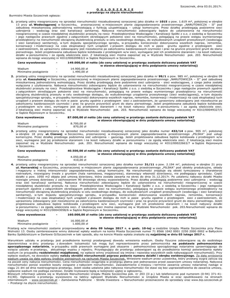 Szczecinek, dnia 03.01.2017r. O G Ł O S Z E N I E o przetargu na zbycie nieruchomości Burmistrz Miasta Szczecinek ogłasza: 1. przetarg ustny nieograniczony na sprzedaż nieruchomości niezabudowanej oznaczonej jako działka nr 1015 o pow. 1.619 m², położonej w obrębie 13 przy ul. Wodociągowej w Szczecinku, przeznaczonej w miejscowym planie zagospodarowania przestrzennego „NARUTOWICZA - II” pod zabudowę mieszkaniową jednorodzinną wolnostojącą z funkcją uzupełniającą – usługi komercyjne. Przez działkę przebiegają podziemne sieci uzbrojenia : wodociąg oraz sieć kanalizacji sanitarnej. Nabywca nieruchomości zobowiązany będzie do ustanowienia na nieruchomości nieograniczonej w czasie nieodpłatnej służebności przesyłu na rzecz Przedsiębiorstwa Wodociągów i Kanalizacji Spółki z o.o. z siedzibą w Szczecinku i jego następców prawnych zgodnie z załącznikiem określającym położenie sieci na nieruchomości, polegającą na prawie wstępu wymienionego przedsiębiorcy na nieruchomość obciążoną służebnością przesyłu w celu swobodnego dostępu, do wybudowanych urządzeń przesyłowych (wodociągu i sieci kanalizacji sanitarnej), w tym dojazdu specjalistycznego sprzętu, w przypadku konieczności dokonywania wszelkich napraw, remontów, konserwacji i modernizacji na czas eksploatacji tych urządzeń z prawem dostępu do nich w pasie gruntu zgodnie z przebiegiem sieci z zastrzeżeniem, że uprawniony zobowiązany jest niezwłocznie po zakończeniu każdorazowych czynności i prac na gruncie przywrócić grunt do stanu pierwotnego. Jeżeli projektowana zabudowa będzie kolidowała z przebiegiem w/w sieci, wymagane jest ich przełożenie staraniem i na koszt nabywcy działki w porozumieniu i za zgodą właściciela sieci. Z lokalizacją sieci można zapoznać się w Wydziale Nieruchomości pok. 203. Nieruchomość wpisana do księgi wieczystej nr KO1I/00020983/2 w Sądzie Rejonowym w Szczecinku. Cena wywoławcza - Wadium Minimalne postąpienie - 149.000,00 zł netto (do ceny ustalonej w przetargu zostanie doliczony podatek VAT w stawce obowiązującej w dniu podpisania umowy notarialnej) 14.900,00 zł 1.490,00 zł 2. przetarg ustny nieograniczony na sprzedaż nieruchomości niezabudowanej oznaczonej jako działka nr 99/1 o pow. 985 m2, położonej w obrębie 09 przy ul. Kaszubskiej w Szczecinku, przeznaczonej w miejscowym planie zagospodarowania przestrzennego „NARUTOWICZA – II” pod zabudowę mieszkaniową jednorodzinną wolnostojącą. Przez działkę przebiegają dwie podziemne sieci uzbrojenia - sieci wodociągowe, z czego jedna została wyłączona z użytkowania. Nabywca nieruchomości zobowiązany będzie do ustanowienia na nieruchomości nieograniczonej w czasie nieodpłatnej służebności przesyłu na rzecz Przedsiębiorstwa Wodociągów i Kanalizacji Spółki z o.o. z siedzibą w Szczecinku i jego następców prawnych zgodnie z załącznikiem określającym położenie sieci na nieruchomości, polegającą na prawie wstępu wymienionego przedsiębiorcy na nieruchomość obciążoną służebnością przesyłu w celu swobodnego dostępu, do wybudowanego urządzenia przesyłowego (sieci wodociągowej), w tym dojazdu specjalistycznego sprzętu, w przypadku konieczności dokonywania wszelkich napraw, remontów, konserwacji i modernizacji na czas eksploatacji tych urządzeń z prawem dostępu do nich w pasie gruntu zgodnie z przebiegiem sieci z zastrzeżeniem, że uprawniony zobowiązany jest niezwłocznie po zakończeniu każdorazowych czynności i prac na gruncie przywrócić grunt do stanu pierwotnego. Jeżeli projektowana zabudowa będzie kolidowała z przebiegiem w/w sieci, wymagane jest jej przełożenie staraniem i na koszt nabywcy działki w porozumieniu i za zgodą właściciela sieci. Z lokalizacją sieci można zapoznać się w Wydziale Nieruchomości pok. 203. Nieruchomość wpisana do księgi wieczystej nr KO1I/00049327/5 w Sądzie Rejonowym w Szczecinku. Cena wywoławcza Wadium Minimalne postąpienie - 87.000,00 zł netto (do ceny ustalonej w przetargu zostanie doliczony podatek VAT w stawce obowiązującej w dniu podpisania umowy notarialnej) 8.700,00 zł 870,00 zł 3. przetarg ustny nieograniczony na sprzedaż nieruchomości niezabudowanej oznaczonej jako działka numer 432/14 o pow. 905 m2, położonej w obrębie 18 przy ul. Cisowej w Szczecinku, przeznaczonej w miejscowym planie zagospodarowania przestrzennego „PILSKA” pod usługi komercyjne. Przez działkę przebiega podziemna sieć uzbrojenia – gazociąg. Jeżeli projektowana zabudowa będzie kolidowała z przebiegiem w/w sieci, wymagane jest jej przełożenie staraniem i na koszt nabywcy działki w porozumieniu i za zgodą właściciela sieci. Z lokalizacją sieci można zapoznać się w Wydziale Nieruchomości pok. 203. Nieruchomość wpisana do księgi wieczystej nr KO1I/00022663/7 w Sądzie Rejonowym w Szczecinku. Cena wywoławcza - Wadium Minimalne postąpienie - 40.500,00 zł netto (do ceny ustalonej w przetargu zostanie doliczony podatek VAT w stawce obowiązującej w dniu podpisania umowy notarialnej) 4.050,00 zł 410,00 zł 4. przetarg ustny nieograniczony na sprzedaż nieruchomości oznaczonej jako działka numer 31/11 o pow. 2.194 m2, położonej w obrębie 21 przy ul. Harcerskiej w Szczecinku, przeznaczonej w miejscowym planie zagospodarowania przestrzennego „PILSKA” pod obiekty produkcyjne, składy i magazyny o niskiej intensywności zagospodarowania, usługi komercyjne. Na nieruchomości znajduje się obiekt tymczasowy o charakterze nietrwałym, niezwiązany trwale z gruntem (hala namiotowa, magazynowa), stanowiący własność dzierżawcy, nie podlegający sprzedaży. Część działki o pow. 1050 m2 objęta jest umową dzierżawy, która została zawarta na okres do dnia 31.12.2017r. Po ustaleniu nabywcy działki Miasto rozwiąże umowę dzierżawy z zachowaniem 90 dniowego okresu wypowiedzenia. Przez działkę przebiegają podziemne sieci u
