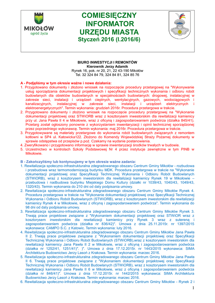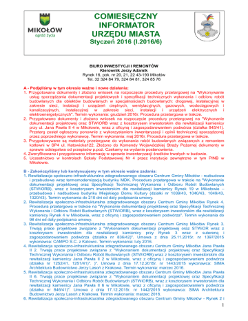 COMIESIĘCZNY INFORMATOR URZĘDU MIASTA Styczeń 2016 (I.2016/6) BIURO INWESTYCJI I REMONTÓW Kierownik Jerzy Adamik Rynek 16, pok. nr 20, 21, 22 43-190 Mikołów Tel. 32 324 84 79, 324 84 81, 324 85 76 A - Podjęliśmy w tym okresie ważne i nowe działania: 1. Przygotowano dokumenty i złożono wniosek na rozpoczęcie procedury przetargowej na "Wykonywanie usług sporządzania dokumentacji projektowych i specyfikacji technicznych wykonania i odbioru robót budowlanych dla obiektów budowlanych w specjalnościach budowlanych: drogowej, instalacyjnej w zakresie sieci, instalacji i urządzeń cieplnych, wentylacyjnych, gazowych, wodociągowych i kanalizacyjnych, instalacyjnej w zakresie sieci, instalacji i urządzeń elektrycznych i elektroenergetycznych". Termin wykonania: grudzień 2016r. Procedura przetargowa w trakcie. 2. Przygotowano dokumenty i złożono wniosek na rozpoczęcie procedury przetargowej na "Wykonanie dokumentacji projektowej oraz STWiORB wraz z kosztorysem inwestorskim dla rewitalizacji kamienicy przy ul. Jana Pawła II 4 w Mikołowie, wraz z oficyną i zagospodarowaniem podwórza (działka 845/41). Przetarg został ogłoszony ponownie z wykorzystaniem inwentaryzacji i opinii technicznej sporządzonej przez poprzedniego wykonawcę. Termin wykonania: maj 2016r. Procedura przetargowa w trakcie. 3. Przygotowywane są materiały przetargowe do wykonania robót budowlanych związanych z remontem kotłowni w SP4 ul. Katowicka122. Złożono do Komendy Wojewódzkiej Straży Pożarnej dokumenty w sprawie odstępstwa od przepisów p.poż. Czekamy na wydanie postanowienia. 4. Zweryfikowano i przygotowano informację w sprawie inwentaryzacji środków trwałych w budowie. 5. Uczestnictwo w kontrolach Szkoły Podstawowej Nr 4 przez instytucje zewnętrzne w tym PINB w Mikołowie. B - Zakończyliśmy lub kontynuujemy w tym okresie ważne zadania: 1. Rewitalizacja społeczno-infrastrukturalna zdegradowanego obszaru Centrum Gminy Mikołów - rozbudowa i przebudowa wraz termomodernizacją budynku MDK. Procedura przetargowa w trakcie na "Wykonanie dokumentacji projektowej oraz Specyfikacji Technicznej Wykonania i Odbioru Robót Budowlanych (STWiORB), wraz z kosztorysem inwestorskim dla rewitalizacji kamienicy Rynek 19 w Mikołowie – przebudowa i nadbudowa budynku Miejskiego Domu Kultury (działki nr 1039/43, 1040/43, 1049/43, 1320/43). Termin wykonania do 210 dni od daty podpisania umowy. 2. Rewitalizacja społeczno-infrastrukturalna zdegradowanego obszaru Centrum Gminy Mikołów Rynek 4. Procedura przetargowa w trakcie na "Wykonanie dokumentacji projektowej oraz Specyfikacji Technicznej Wykonania i Odbioru Robót Budowlanych (STWiORB), wraz z kosztorysem inwestorskim dla rewitalizacji kamienicy Rynek 4 w Mikołowie, wraz z oficyną i zagospodarowaniem podwórza". Termin wykonania do 98 dni od daty podpisania umowy. 3. Rewitalizacja społeczno-infrastrukturalna zdegradowanego obszaru Centrum Gminy Mikołów Rynek 3. Trwają prace projektowe związane z "Wykonaniem dokumentacji projektowej oraz STWiOR wraz z kosztorysem inwestorskim dla rewitalizacji kamienicy przy Rynek 3 wraz z sutereną i zagospodarowaniem podwórza (działka nr 836/42)". Umowa z dnia 25.11.2015r. nr 1397/2015 wykonawca: CAMPO S.C. z Katowic. Termin wykonania: luty 2016. 4. Rewitalizacja społeczno-infrastrukturalna zdegradowanego obszaru Centrum Gminy Mikołów Jana Pawła II 2. Trwają prace projektowe związane z "Wykonaniem dokumentacji projektowej oraz Specyfikacji Technicznej Wykonania i Odbioru Robót Budowlanych (STWiORB),wraz z kosztorysem inwestorskim dla rewitalizacji kamienicy Jana Pawła II 2 w Mikołowie, wraz z oficyną i zagospodarowaniem podwórza (działka nr 1252/41, 1251/41)". )". Umowa z dnia 17.12.2015r. nr 1443/2015 wykonawca: SIMA Architektura Budownictwo Jerzy Lasoń z Krakowa. Termin wykonania: marzec 2016. 5. Rewitalizacja społeczno-infrastrukturalna zdegradowanego obszaru Centrum Gminy Mikołów Jana Pawła II 6. Trwają prace projektowe związane z "Wykonaniem dokumentacji projektowej oraz Specyfikacji Technicznej Wykonania i Odbioru Robót Budowlanych (STWiORB), wraz z kosztorysem inwestorskim dla rewitalizacji kamienicy Jana Pawła II 6 w Mikołowie, wraz z oficyną i zagospodarowaniem podwórza (działka nr 846/41)". Umowa z dnia 17.12.2015r. nr 1442/2015 wykonawca: SIMA Architektura Budownictwo Jerzy Lasoń z Krakowa. Termin wykonania: marzec 2016. 6. Rewitalizacja społeczno-infrastrukturalna zdegradowanego obszaru Centrum Gminy Mikołów - Rynek 2 i 1 Wojciecha 14. Prace projektowe w trakcie na "Wykonanie dokumentacji projektowej oraz Specyfikacji Technicznej Wykonania i Odbioru Robót Budowlanych (STWiORB), wraz z kosztorysem inwestorskim, rewitalizacji kamienic Rynek 2 i Wojciecha 14 w Mikołowie, łącznie z oficynami i zagospodarowaniem podwórza". Umowa z dnia 8.09.2015r. nr 1126/2015 wykonawca: Szafron Szendzielorz Projekt Tomasz Szendzielorz ze Studzienic. Gmina Mikołów odstąpiła od umowy. Firma przekazała inwentaryzację i ekspertyzę techniczną. Przetarg został ogłoszony ponownie z wykorzystaniem ekspertyzy i inwentaryzacji sporządzonej przez Firmę Szafron-Szyndzielorz. 7. Rewitalizacja społeczno-infrastrukturalna zdegradowanego obszaru Centrum Gminy Mikołów - Jana Pawła II 4. Prace projektowe w trakcie na "Wykonanie dokumentacji projektowej oraz Specyfikacji Technicznej Wykonania i Odbioru Robót Budowlanych (STWiORB), wraz z kosztorysem inwestorskim dla rewitalizacji kamienicy przy ul. Jana Pawła II 4 wraz z oficyną i zagospodarowaniem podwórza (działka nr 845/41)". Umowa z dnia 28.10.2015r. nr 1276/2015 wykonawca: Szafron Szendzielorz Projekt Tomasz Szendzielorz ze Studzienic. Gmina Mikołów odstąpiła od umowy. Firma przekazała inwentaryzację i opinię techniczną. 8. Trwają prace związane z "Wykonaniem dokumentacji projektowych termomodernizacji budynków gminnych w Mikołowie: Rynek 11, Rynek 14, Krakowska 6, Krakowska 5, Jana Pawła II 7, Lom