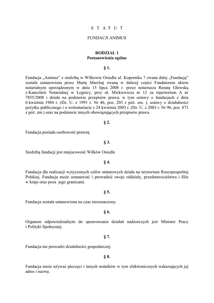 S T A T U T FUNDACJI ANIMUS RODZIAŁ 1 Postanowienia ogólne § 1. Fundacja „Animus” z siedzibą w Wilkowie Osiedlu ul. Kopernika 7 zwana dalej „Fundacją” została ustanowiona przez Martę Marchaj zwaną w dalszej części Fundatorem aktem notarialnym sporządzonym w dniu 15 lipca 2008 r. przez notariusza Renatę Głowską z Kancelarii Notarialnej w Legnicy, przy ul. Mickiewicza nr 12 za repertorium A nr 7855/2008 i działa na podstawie przepisów prawa, w tym ustawy o fundacjach z dnia 6 kwietnia 1984 r. (Dz. U. z 1991 r. Nr 46, poz. 203 z póź. zm. ), ustawy o działalności pożytku publicznego i o wolontariacie z 24 kwietnia 2003 r. (Dz. U. z 2003 r. Nr 96, poz. 873 z póź. zm.) oraz na podstawie innych obowiązujących przepisów prawa. § 2. Fundacja posiada osobowość prawną § 3. Siedzibą fundacji jest miejscowość Wilków Osiedle § 4. Fundacja dla realizacji wytyczonych celów statutowych działa na terytorium Rzeczpospolitej Polskiej. Fundacja może ustanawiać i prowadzić swoje oddziały, przedstawicielstwa i filie w kraju oraz poza jego granicami. § 5. Fundacja została ustanowiona na czas nieoznaczony. § 6. Organem odpowiedzialnym do sprawowania działań nadzorczych jest Minister Pracy i Polityki Społecznej. § 7. Fundacja nie prowadzi działalności gospodarczej. § 8. Fundacja może używać pieczęci i innych nośników w tym elektronicznych wskazujących jej adres i nazwę. § 9. Fundacja może ustanawiać odznaki, medale honorowe i przyznawać je wraz z innymi wyróżnieniami, osobom fizycznym oraz prawnym zasłużonych dla Fundacji. § 10. Działalność Fundacji jest zgodna z podstawowymi interesami RP. ROZDZIAŁ 2 Cele, środki i zasady działania Fundacji § 11. Fundacja jako organizacja pożytku publicznego wykonuje zadania w zakresie: 1) pomocy społecznej, w tym pomocy rodzinom i osobom w trudnej sytuacji życiowej oraz wyrównywania szans tych rodzin i osób; 2) działalności charytatywnej; 3) ochrony i promocji zdrowia; 4) działania na rzecz osób niepełnosprawnych; 5) działalności wspomagającej rozwój wspólnot i społeczności lokalnych; 6) nauki, edukacji, oświaty i wychowania; 7) krajoznawstwa i wypoczynku dzieci i młodzieży; 8) kultury, sztuki, ochrony dóbr kultury i tradycji; 9) upowszechniania kultury fizycznej i sportu; 10) porządku i bezpieczeństwa publicznego oraz przeciwdziałania patologiom społecznym; 11) działań na rzecz integracji europejskiej oraz rozwijania kontaktów i współpracy między społeczeństwami; 12) promocji i organizacji wolontariatu; 13) działalności wspomagającej technicznie, szkoleniowo, informacyjnie lub finansowo organizacje pozarządowe oraz inne podmioty; 14) pomocy ofiarom katastrof, klęsk żywiołowych, konfliktów zbrojnych i wojen w kraju i za granicą. § 12. Fundacja realizuje cele statutowe poprzez: 1) pozyskiwanie środków finansowych przeznaczonych na działalność Fundacji; 2) udzielanie wsparcia finansowego na realizację działań istotnych ze względu na cele Fundacji oraz pozafinansowego (w szczególności rzeczowe, organizacyjne i techniczne) na wspieranie działań zgodnych z celami Fundacji; 3) wspieranie finansowe i pozafinansowe podmiotów i organizacji powołanych do celów zgodnych z celami Fundacji oraz osób fizycznych w kraju i za granicą; 4) udzielanie stypendiów i ustanawianie nagród; 5) organizowanie i finansowanie akcji społecznych , szkoleń, konferencji i prezentacji, wydawanie publikacji; 6) inicjowanie , przeprowadzanie, promowanie i wspieranie programów edukacyjnoinformacyjnych służących krzewieniu wiedzy istotnej ze względu na cele Fundacji; 7) inicjowanie, przeprowadzanie i wspieranie programów badawczych mających dostarczyć wiedzę istotną ze względu na cele Fundacji; 8) współpracę z władzami samorządowymi, rządowymi i organizacjami pozarządowymi w zakresie określonym w § 11. § 13. Fundacja prowadzi działalność społecznie użyteczną w zakresie zadań publicznych określonych w ustawie o działalności organizacji pożytku publicznego. ROZDZIAŁ 3 Majątek i dochody fundacji § 14. 1. Majątkiem fundacji są: 1) środki finansowe w kwocie 1.000,00 zwane dalej funduszem założycielskim, o którym mowa w akcie notarialnym; 2) środki finansowe, ruchomości, nieruchomości nabyte przez Fundację w toku jej działania; 3) środki majątkowe z tytułu: a) dotacji osób fizycznych i prawnych; b) dochodów z majątku ruchomego i nieruchomego oraz praw majątkowych; c) darowizn, spadków i zapisów; d) innych źródeł dozwolonych prawem. 2. Zabrania się: 1) udzielania pożyczek lub zabezpieczenia zobowiązań majątkiem organizacji w stosunku do jej członków, członków organów lub pracowników oraz osób, z którymi pracownicy pozostają w związku małżeńskim albo w stosunku pokrewieństwa lub powinowactwa w linii prostej, pokrewieństwa lub powinowactwa w linii bocznej do drugiego stopnia albo są związani z tytułu przysposobienia, kurateli lub opieki; 2) przekazywania jej majątku na rzecz członków, członków organów lub pracowników oraz ich osób bliskich, na zasadach innych niż w stosunku do osób trzecich, w szczególności jeżeli przekazanie to następuje bezpłatnie lub na preferencyjnych warunkach; 3) wykorzystywania majątku na rzecz członków, członków organów lub pracowników oraz ich osób bliskich na zasadach innych niż w stosunku do osób trzecich, chyba że to wykorzystanie bezpośrednio wynika ze statutowego celu organizacji albo podmiotu; 4) zakupu na szczególnych zasadach towarów lub usług od podmiotów , w którym uczestniczą członkowie organizacji , członkowie jej organów lub pracownicy oraz ich osoby bliskie. § 15. Dochody Fundacji pochodzą z: 1) darowizn i środków publicznych w rozumieniu ustawy o finansach publicznych, w tym kwot przekazanych przez podatników podatku dochodowego zgodnie z art. 27 ustawy o działalności pożytku publicznego; 2) spadków i zapisów; 3)
