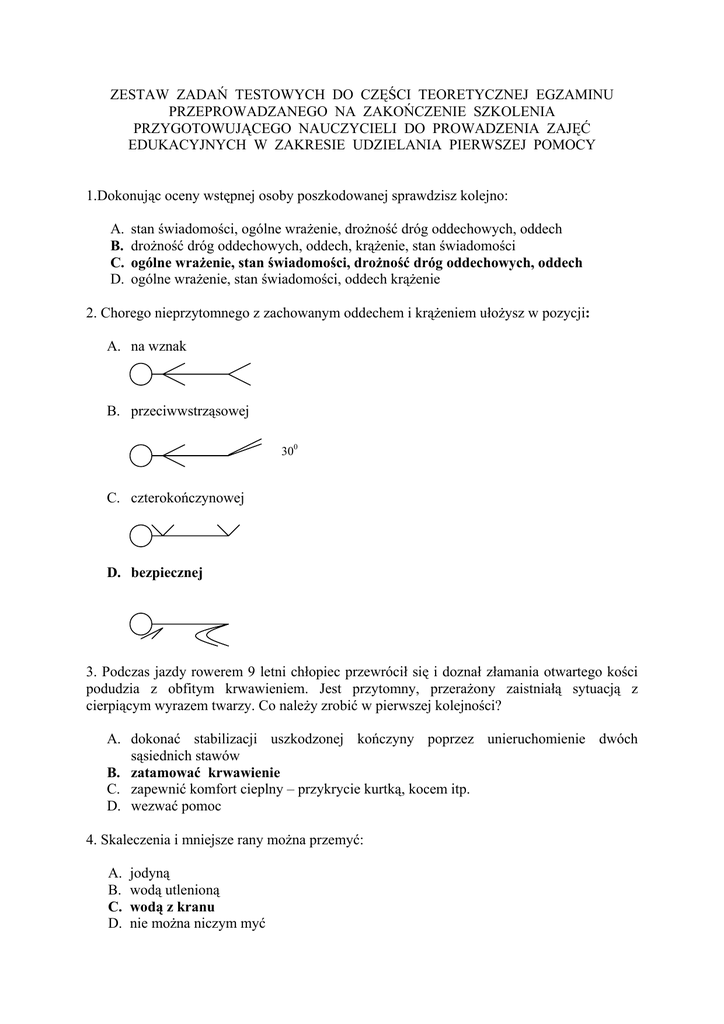 ZESTAW ZADAŃ TESTOWYCH DO CZĘŚCI TEORETYCZNEJ EGZAMINU PRZEPROWADZANEGO NA ZAKOŃCZENIE SZKOLENIA PRZYGOTOWUJĄCEGO NAUCZYCIELI DO PROWADZENIA ZAJĘĆ EDUKACYJNYCH W ZAKRESIE UDZIELANIA PIERWSZEJ POMOCY 1.Dokonując oceny wstępnej osoby poszkodowanej sprawdzisz kolejno: A. B. C. D. stan świadomości, ogólne wrażenie, drożność dróg oddechowych, oddech drożność dróg oddechowych, oddech, krążenie, stan świadomości ogólne wrażenie, stan świadomości, drożność dróg oddechowych, oddech ogólne wrażenie, stan świadomości, oddech krążenie 2. Chorego nieprzytomnego z zachowanym oddechem i krążeniem ułożysz w pozycji: A. na wznak B. przeciwwstrząsowej 300 C. czterokończynowej D. bezpiecznej 3. Podczas jazdy rowerem 9 letni chłopiec przewrócił się i doznał złamania otwartego kości podudzia z obfitym krwawieniem. Jest przytomny, przerażony zaistniałą sytuacją z cierpiącym wyrazem twarzy. Co należy zrobić w pierwszej kolejności? A. dokonać stabilizacji uszkodzonej kończyny poprzez unieruchomienie dwóch sąsiednich stawów B. zatamować krwawienie C. zapewnić komfort cieplny – przykrycie kurtką, kocem itp. D. wezwać pomoc 4. Skaleczenia i mniejsze rany można przemyć: A. B. C. D. jodyną wodą utlenioną wodą z kranu nie można niczym myć 5. Jak długo powinna trwać ocena oddychania u osoby nieprzytomnej? A B. C. D. około 5sek około 10sek około 15sek około 20sek 6. Zaznacz prawidłową odpowiedź. Podczas 1 cyklu resuscytacji u osoby dorosłej należy wykonać: liczba uciśnięć klatki piersiowej A. B. C. D. 20 20 30 30 liczba oddechów : : : : 1 2 2 5 7. Dla osób bez wykształcenia medycznego zalecany stosunek oddechów do uciśnięć klatki piersiowej u dziecka wynosi: A B C D 2 : 15 5 :15 2 : 30 1:3 8. Podczas przerwy 12 – letni chłopiec zakrztusił się kęsem jabłka. Jest przytomny, nie może mówić, ma trudności w oddychaniu. Jakie czynności należy u niego wykonać: A. 5 uderzeń między łopatkami, naprzemiennie z 5 uciśnięciami nadbrzusza do momentu usunięcia ciała obcego lub utraty przytomności B. 5 uderzeń między łopatkami, do momentu usunięcia ciała obcego, lub utraty przytomności C. 5 uciśnięć nadbrzusza do momentu usunięcia ciała obcego lub utraty przytomności D. zachęcać do kaszlu do momentu usunięcia ciała obcego lub utraty przytomności 9. Udzielając pomocy 4 letniemu dziecku, u którego przed chwilą doszło do oparzenia gorącą wodą kończyn dolnych należy w pierwszej kolejności: A. B. C. D. posmarować oparzone miejsce maścią zastosować na oparzone miejsce środek odkażający ( np. Panthenol, spirytus) schłodzić miejsce oparzenia zimną wodą założyć jałowy opatrunek 10. W zatłoczonym sklepiku szkolnym jedna z uczennic osunęła się nagle na ziemię, prawdopodobnie zemdlała. Jakie będzie postępowanie w tym przypadku? A wezwanie pomocy B zapewnienie dostępu świeżego powietrza C zastosowanie pozycji czterokończynowej D prawidłowe b i c 11. Poszkodowany w czasie wypadku doznał wielu obrażeń. Które z podanych objawów, bądź obrażeń świadczą o zagrożeniu życia? A B C D złamanie kończyny górnej ból w okolicy lędźwiowej blada, chłodna i spocona skóra zwichnięcie barku z jego stłuczeniem 12. Chłopiec po upadku z drabiny z wysokości 3 m leży na ziemi i jęczy. Co należy zrobić w pierwszej kolejności: A. B. C. D. odciągnąć go w bezpieczne miejsce próbować postawić na nogi podać środek p/bólowy w tabletce nie ruszać do czasu przybycia zespołu ratownictwa medycznego 13. Doraźne działanie w przypadku silnego krwawienia ze zranionej kończyny górnej obejmuje: A. B. C. D. zaciśnięcie paska powyżej krwawienia uniesienie kończyny i bezpośrednie uciśnięcie miejsca krwawienia opuszczenie kończyny poniżej poziomu serca uniesienie kończyny i założenie opaski uciskowej 14. W przypadku obrażeń mięsni, kości i stawów możemy zmniejszyć obrzęk w następujący sposób: A. B. C. D. bandażując opatrunkiem elastycznym stosując ciepły kompres stosując zimny okład polewając wodą przez 10 minut 15. Kto ma prawo i obowiązek udzielania pierwszej pomocy w ramach posiadanych kompetencji: A. B. C. D. tylko osoby z odpowiednimi kwalifikacjami personel medyczny, bo za popełnione błędy grozi odpowiedzialność karna każdy członek społeczeństwa przeszkoleni wolontariusze PCK 16. W przypadku krwawienia z nosa należy: A. B. C. D. położyć poszkodowanego na plecach pochylić głowę krwawiącego mocno do przodu, ucisnąć skrzydełka nosa, położyć zimny kompres na czoło odchylić głowę do tyłu i położyć zimny kompres na kark 17. Zaczerwienienie i świąd skóry, szybko narastające obrzęki, utrudnione oddychanie to objawy wstrząsu: A. B. C. D. septycznego kardiogennego krwotocznego anafilaktycznego 18. Nieprzytomną kobietę w widocznej ciąży z zachowanym oddechem układamy w pozycji bezpiecznej na: A. B. C. D. na prawym boku na lewym boku na plecach z głową powyżej poziomu serca na plecach z nogami ugiętymi w stawach kolanowych 19. Obserwując objawy takie jak: zaczerwienienie i silny ból skóry, pęcherze z płynem surowiczym, znaczny obrzęk tkanek - oparzenie zakwalifikujesz jako: A. B. C. D. oparzenie stopnia I oparzenie stopnia II oparzenie stopnia III oparzenie stopnia IV 20. Głównym mięśniem oddechowym jest: A. B. C. D. przepona m. piersiowy większy m. prosty brzucha m. międzyżebrowy 21. Chorego przytomnego, z podejrzeniem zawału mięśnia sercowego, należy w oczekiwaniu na pomoc i transport ułożyć: A. B. C. D. w pozycji leżącej na plecach w pozycji siedzącej w pozycji wygodnej dla chorego w pozycji na lewym boku 22. Kierowca samochodu osobowego po zderzeniu z drzewem pozostaje w pozycji siedzącej w aucie. Co może usprawiedliwiać szybkie wydobycie mężczyzny, zanim przybędą służby ratunkowe? A. B. C. D. złamanie kości udowej i ramienia nielogiczne odpowiedzi na pytania konie