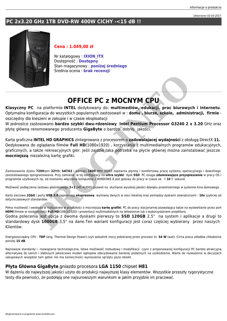 Informacje o produkcie Utworzono 02-03-2017 PC 2x3.20 GHz 1TB DVD-RW 400W CICHY -<15 dB !! Cena : 1.049,00 zł FO Nr katalogowy : IXION_ITX Dostępność : Dostępny Stan magazynowy : poniżej średniego Średnia ocena : brak recenzji OFFICE PC z MOCNYM CPU -I N Klasyczny PC na platformie INTEL dedykowany do: multimediów, edukacji, prac biurowych i internetu. Optymalna konfiguracja do wszystkich popularnych zastosowań w : domu , biurze, szkole, administracji, firmie oszczędny dla kieszeni w zakupie i w czasie eksploatacji W jednostce zastosowano bardzo szybki dwu-rdzeniowy Intel Pentium Processor G3240 2 x 3.20 GHz oraz płytę główną renomowanego producenta GigaByte o bardzo dobrej jakości. O G Karta graficzna INTEL HD GRAPHICS zintegrowana z procesorem o zadowalajacej wydajności z obsługą DirectX 11. Dedykowana do oglądania filmów Full HD(1080x1920) , korzystania z multimedialnych programów edukacyjnych, graficznych, a także rekreacyjnych gier. Jeśli zajdzie taka potrzeba na płycie głównej można zainstalować jeszcze mocniejszą niezależną kartę grafiki. Zastosowanie dysku 7200rpm 32MBc SATA3 i pamięci 1600 MHz DDR3 zapewnia płynną i komfortową pracę systemu operacyjnego i dowolnego zainstalowanego oprogramowania. Przy zamianie w tej konfiguracji na ultra szybki dysk SSD PC osiąga zdumiewające przyspieszenie w pracy OS i programów użytkowych np. od momentu włączenia komputera z WINDOWS 8 jest gotowy do pracy w czasie ok. ! 10 ! sekund. Możliwość podłączenia zestawu głośnikowego 5+1 (HD AUDIO) pozwoli na słuchanie wysokiej jakości dźwięku przestrzennego w systemie kina domowego. PR Karta sieciowa 1Gbit i porty USB 3.0 zapewniają ekspresową wymianę danych w sieci lokalnej oraz pomiędzy dyskami zewnętrznymi - 10x szybciej od dotychczasowych standardów. Pełna możliwość i swoboda w rozbudowie w przyszłości o mocniejszą kartę grafiki. PC do pracy stacjonarnej pozwalający także na wyświetlanie przez port HDMI filmów w rozdzielczości Full HD(1080x1920) i prezentacji multimedialnych na telewizorze lub z wykorzystaniem projektora. Godna polecenia jest opcja z dwoma dyskami pierwszy to SSD 120GB 2,5" na system i aplikacje a drugi to standardowy dysk 1000GB 3,5" na dane.Ten wariant konfiguracji jest coraz częściej wybierany przez naszych Klientów. Energooszczędny CPU - TDP (ang. Thermal Design Power) czyli wskaźnik mocy pobieranej przez procesor to 54 W (wat). Cicha praca układów chłodzenia poniżej 15 dB. Najnowsze standardy i rozwiązania technologiczne, łatwa możliwość rozbudowy i modyfikacji czyni z proponowanej konfiguracji PC bardzo atrakcyjną alternatywę do tanich i słabszych jakościowo modeli laptopów zdecydowanie bardziej podatnych na uszkodzenia. Warte do rozważenia w decyzjach zakupowych wszędzie tam gdzie nie ma konieczności wynoszenia sprzętu poza obiekt. Płyta Główna GigaByte.gniazdo procesora LGA 1150 chipset H81 W dążeniu do najwyższej jakości użyto do produkcji najwyższej klasy elementów. Wszystkie przeszły rygorystyczne testy dla pewności, że podołają one najsurowszym warunkom w jakim przyjdzie im pracować. Wygenerowano w programie www.oscGold.com FO -I N O G PR Dokładny opis na stronie producenta: sprawdź Informacje o produkcie Zamiennie oferujemy p³ytê g³own± : ASROCK H81M-HDS SZEGÓŁOWA SPECYFIKACJA KONFIGURACJI PC Ostatnia aktualizacja konfiguracji: 27.02.2016 r. Intel Pentium G3250 "Haswell Refresh" 2 x 3.20 GHz dwa rdzenie dwa w±tki Intel Smart Cache 3MB Intel HD Graphics Thermal Design Power (wskaźnik mocy pobieranej przez procesor) 53W Intel Virtualization (VT-x) PROCESOR gratka dla miłośników testowania innych systemów operacyjnych i oprogramowania użytkowego z wykorzystaniem HYPER-V GigaByte GA-H81M-S2H (1xPCX/DZW/GLAN/SATA3/USB3/DDR3) - DVI, HDMI,D-SUB - 6 x USB 3.0 port (4 tył 2x front) - 4 x USB 2.0 port (2 tył 2x front) - 2 x SATA 3 port - 2 x SATA 2 port - 1 x PCIE 16x - karta sieciowa do 1Gbit - karta muzyczna HD audio 5+1 szczegółowe parametry na stronie FO GigaByte:sprawd¼ PŁYTA GŁÓWNA 4GB PAMIĘĆ 1600 MHz CL11 DDR3 CORSAIR 1 TB TOSHIBA 7200 obr. SATAIII 32MBc dopłata do 128GB SSD 0 zł !! PROMOCJA !! w cenie 229 zł dysk DYSK częstą praktyką jest zamawianie obydwu dysków w tej konfiguracji SATA DVD+/-R24x,DVD+RW6x, DVD+R DL 8x NAPĘD OPTYCZNY Intel HD Graphics Karta wbudowana w procesor Maks. częstotliwość dynamiczna układu graficznego 1.1 GHZ Maks. pamięć wideo układu graficznego 1.7 GHz WE Black Line 400W PFC standardowe zabezpieczenia OVP (zabezpieczenie przed zbyt wysokim napiêciem) OLP (zabezpieczenie przeci±¿eniowe) SCP (zabezpieczenie przeciwzwarciowe) ZASILACZ O G KARTA GRAFICZNA regulowany cichy wentylator 12cm zależnie od temp. Tacens MARS GAMING PR wymiary Sz:178mm; D:336mm; W:345mm . Mała zgrabna i szykowna obudowa z portem USB 3.0 od frontu polecamy dodatkowo montaż czytnika kart pamięci OBUDOWA OPCJONALNIE za dop³at± Obs³uguje wszystkie typy karta 88w1 + port USB 3.0 CZYTNIK KART plus USB 3.0 OPCJONALNIE za dopłatą klawiatura i mysz AKCESORIA Porównaj z miniPC na platformie INTEL Wypróbuj Windows 10 Enterprise 90-dniową wersję testową HIT cenowy przy zakupie na 0% VAT dla szkoły lub innej placówki oświatowej , a także dla firmy jako koszt z odliczeniem VAT. - 812 zł z LINUX UBUTU PL - 1185 zł z WINDOWS 10 Szczególnie atrakcyjna propozycja dla placówek oświatowych, które mogą korzystać z 0 stawki VAT na zakup komputerów lub zestawów PC - co niestety nie dotyczy laptopów. Polecamy licencję na OS WINDOWS 10 Home za systemu i sterowników. 459 zł -I N SSD 128GB z instalacją oraz aktualizacją Na życzenie ! - Instalacja użytecznego softu do pracy biurowej, multimediów i komunikacji, - Kopia zapasowa skonfigurowanego systemu wraz z zainstalowanym oprogramowaniem, szybkie przywracanie ok. 15 min. W PREZENCIE - PRZEGLĄD i KONSERWACJA układów chłodzenia po 1 i 2 ROKU użytkowania Pr