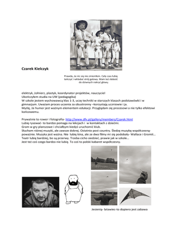 Czarek Kielczyk Prawda, że nic się nie zmieniłem. Cały czas lubię taoczyd i wkładad strój galowy. Mam też słabośd do dziwnych nakryd głowy. elektryk, żołnierz, plastyk, koordynator projektów, nauczyciel Ukooczyłem studia na UW (pedagogika) W szkole jestem wychowawcą klas 1-3, uczę techniki w starszych klasach podstawówki i w gimnazjum. Uważam proces uczenia za obustronny –korzystają uczniowie i ja. Myślę, że humor jest ważnym elementem edukacji. Przyglądam się procesowi a nie tylko efektowi koocowemu. Prywatnie to rower i fotografia- http://www.dfv.pl/gallery/members/Czarek.html Lubię rysowad- to bardzo pomaga na lekcjach i w kontaktach z dziedmi. Gram w gry planszowe i chciałbym kiedyś uruchomid klub. Słucham różnej muzyki, ale zawsze dobrej. Ostatnio post country. Śledzę muzykę współczesnąpoważnie. Muzyka jest ważna. Nie lubię kina, ale ze dwa filmy mi się podobały- Wallace i Gromit… Teatr lubię bardziej, bo są przerwy. Trzeba cicho siedzied, prawie jak w szkole… Jest też coś czego bardzo nie lubię. To coś to polski kabaret współczesny. Jesienią- latawiec-to dopiero jest zabawa