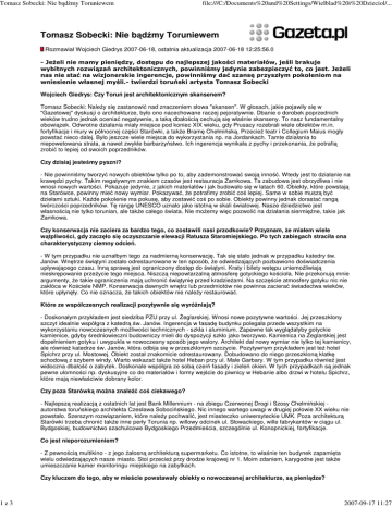 Tomasz Sobecki: Nie bądźmy Toruniewem file:///C:/Documents%20and%20Settings/Wielblad%20i%20Dzieciol/... Tomasz Sobecki: Nie bądźmy Toruniewem Rozmawiał Wojciech Giedrys 2007-06-18, ostatnia aktualizacja 2007-06-18 12:25:56.0 - Jeżeli nie mamy pieniędzy, dostępu do najlepszej jakości materiałów, jeśli brakuje wybitnych rozwiązań architektonicznych, powinniśmy jedynie zabezpieczyć to, co jest. Jeżeli nas nie stać na wizjonerskie ingerencje, powinniśmy dać szansę przyszłym pokoleniom na wniesienie własnej myśli.- twierdzi toruński artysta Tomasz Sobecki Wojciech Giedrys: Czy Toruń jest architektonicznym skansenem? Tomasz Sobecki: Należy się zastanowić nad znaczeniem słowa "skansen". W głosach, jakie pojawiły się w "Gazetowej" dyskusji o architekturze, było ono nacechowane raczej pejoratywnie. Dbanie o dorobek poprzednich wieków trudno jednak oceniać negatywnie, a taką dbałością cechują się właśnie skanseny. To nasz fundamentalny obowiązek. Odwrotne działania miały miejsce pod koniec XIX wieku, gdy Prusacy rozebrali wiele obiektów m.in. fortyfikacje i mury w północnej części Starówki, a także Bramę Chełmińską. Przecież teatr i Collegium Maius mogły powstać nieco dalej. Było jeszcze wiele miejsca do wykorzystania np. na Jordankach. Tamte działania to niepowetowana strata, a nawet zwykłe barbarzyństwo. Ich ingerencja wynikała z pychy i przekonania, że potrafią zrobić to lepiej od swoich poprzedników. Czy dzisiaj jesteśmy pyszni? - Nie powinniśmy tworzyć nowych obiektów tylko po to, aby zademonstrować swoją inność. Wtedy jest to działanie na krawędzi pychy. Takim negatywnym znakiem czasów jest restauracja Zamkowa. Ta zabudowa jest obrzydliwa i nie wnosi nowych wartości. Pokazuje jedynie, z jakich materiałów i jak budowało się w latach 60. Obiekty, które powstają na Starówce, powinny mieć nowy wymiar. Pokazywać, że potrafimy zrobić coś lepiej. Same w sobie muszą być dziełami sztuki. Każde pokolenie ma pokusę, aby zostawić coś po sobie. Obiekty powinny jednak dorastać rangą twórczości poprzedników. Tę rangę UNESCO uznało jako istotną w skali światowej. Nasze dziedzictwo jest własnością nie tylko torunian, ale także całego świata. Nie możemy więc pozwolić na działania siermiężne, takie jak Zamkowa. Czy konserwacja nie zaciera za bardzo tego, co zostawili nasi przodkowie? Przyznam, że miałem wiele wątpliwości, gdy zaczęło się oczyszczanie elewacji Ratusza Staromiejskiego. Po tych zabiegach straciła ona charakterystyczny ciemny odcień. - W tym przypadku nie uznałbym tego za nadmierną konserwację. Tak się stało jednak w przypadku katedry św. Janów. Wnętrze świątyni zostało odrestaurowane w ten sposób, że odwiedzających pozbawiono doświadczenia upływającego czasu. Inną sprawą jest ograniczony dostęp do świątyni. Kraty i bilety wstępu uniemożliwiają nieskrępowanie przeżycie tego miejsca. Niszczą niepowtarzalną atmosferę gotyckiego kościoła. Nie przekonują mnie argumenty, że takie ograniczenia mają uchronić świątynię przed kradzieżami. Na szczęście atmosfery gotyku nic nie zakłóca w Kościele NMP. Konserwacja dawnych wnętrz lub przedmiotów nie powinna zacierać świadectwa wieków, które upłynęły. Co nie oznacza, że takich obiektów nie należy restaurować. Które ze współczesnych realizacji pozytywnie się wyróżniają? - Doskonałym przykładem jest siedziba PZU przy ul. Żeglarskiej. Wnosi nowe pozytywne wartości. Jej przeszklony szczyt idealnie współgra z katedrą św. Janów. Ingerencja w fasadę budynku polegała przede wszystkim na wykorzystaniu nowoczesnych możliwości technicznych - szkła i aluminium. Zapewne tak wyglądałyby gotyckie kamienice, gdyby średniowieczni budowniczy mieli do dyspozycji szkło jako tworzywo. Kamienica na Żeglarskiej jest dopełnieniem gotyku i uwypukla w nowoczesny sposób jego walory. Architekt dał nowy wymiar nie tylko tej kamienicy, ale również katedrze św. Janów, która odbija się w przeszklonym szczycie. Pozytywnym przykładem jest też hotel Spichrz przy ul. Mostowej. Obiekt został znakomicie odrestaurowany. Dobudowano do niego przeszkloną klatkę schodową z szybem windy. Warto wskazać także hotel Heban przy ul. Małe Garbary. W tym przypadku również jest widoczna dbałość o zabytek. Doskonale współgra ze sobą czerń fasady i zieleń okien. W tych przypadkach są jednak pewne ułomności np. dyskusyjne co do materiałów i formy wejście do piwnicy w Hebanie albo drzwi w hotelu Spichrz, które mają niewłaściwie dobrany kolor. Czy poza Starówką można znaleźć coś ciekawego? - Najlepszą realizacją z ostatnich lat jest Bank Millennium - na zbiegu Czerwonej Drogi i Szosy Chełmińskiej autorstwa toruńskiego architekta Czesława Sobocińskiego. Nic innego wartego uwagi w drugiej połowie XX wieku nie powstało. Szerszym rozwiązaniem, które należy pochwalić, jest miasteczko uniwersyteckie UMK. Poza architekturą Starówki trzeba chronić także inne perły Torunia np. willowy odcinek ul. Słowackiego, wille fabrykantów w ciągu ul. Bydgoskiej, budownictwo szachulcowe Bydgoskiego Przedmieścia, szczególnie ul. Konopnickiej, fortyfikacje. Co jest nieporozumieniem? - Z pewnością multikino - z jego żałosną architekturą supermarketu. Co istotne, to właśnie ten budynek zapamięta wielu odwiedzających nasze miasto. Stoi przecież przy drodze krajowej nr 1. Moim zdaniem, karygodne jest także umieszczanie kamer monitoringu miejskiego na zabytkach. Czy kluczem do tego, aby w mieście powstawały obiekty o nowoczesnej architekturze, są pieniądze? 1z3 2007-09-17 11:27 Tomasz Sobecki: Nie bądźmy Toruniewem file:///C:/Documents%20and%20Settings/Wielblad%20i%20Dzieciol/... - Architektura to najdroższa ze sztuk. Nie należy tworzyć bytów ponad potrzeby. Jeżeli nie mamy pieniędzy, dostępu do najlepszej jakości materiałów, jeśli brakuje