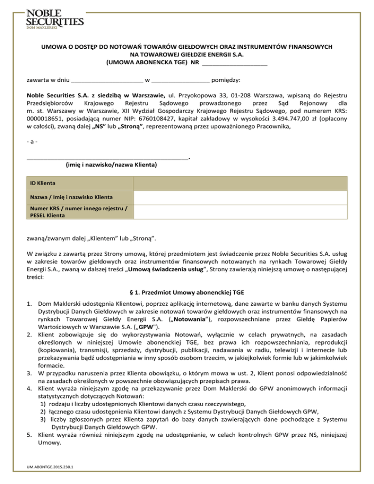 UMOWA O DOSTĘP DO NOTOWAŃ TOWARÓW GIEŁDOWYCH ORAZ INSTRUMENTÓW FINANSOWYCH NA TOWAROWEJ GIEŁDZIE ENERGII S.A. (UMOWA ABONENCKA TGE) NR ___________________ zawarta w dniu _____________________ w _________________ pomiędzy: Noble Securities S.A. z siedzibą w Warszawie, ul. Przyokopowa 33, 01-208 Warszawa, wpisaną do Rejestru Przedsiębiorców Krajowego Rejestru Sądowego prowadzonego przez Sąd Rejonowy dla m. st. Warszawy w Warszawie, XII Wydział Gospodarczy Krajowego Rejestru Sądowego, pod numerem KRS: 0000018651, posiadającą numer NIP: 6760108427, kapitał zakładowy w wysokości 3.494.747,00 zł (opłacony w całości), zwaną dalej „NS” lub „Stroną”, reprezentowaną przez upoważnionego Pracownika, -a_______________________________________________. (imię i nazwisko/nazwa Klienta) ID Klienta Nazwa / Imię i nazwisko Klienta Numer KRS / numer innego rejestru / PESEL Klienta zwaną/zwanym dalej „Klientem” lub „Stroną”. W związku z zawartą przez Strony umową, której przedmiotem jest świadczenie przez Noble Securities S.A. usług w zakresie towarów giełdowych oraz instrumentów finansowych notowanych na rynkach Towarowej Giełdy Energii S.A., zwaną w dalszej treści „Umową świadczenia usług”, Strony zawierają niniejszą umowę o następującej treści: § 1. Przedmiot Umowy abonenckiej TGE 1. Dom Maklerski udostępnia Klientowi, poprzez aplikację internetową, dane zawarte w banku danych Systemu Dystrybucji Danych Giełdowych w zakresie notowań towarów giełdowych oraz instrumentów finansowych na rynkach Towarowej Giełdy Energii S.A. („Notowania”), rozpowszechniane przez Giełdę Papierów Wartościowych w Warszawie S.A. („GPW"). 2. Klient zobowiązuje się do wykorzystywania Notowań, wyłącznie w celach prywatnych, na zasadach określonych w niniejszej Umowie abonenckiej TGE, bez prawa ich rozpowszechniania, reprodukcji (kopiowania), transmisji, sprzedaży, dystrybucji, publikacji, nadawania w radiu, telewizji i internecie lub przekazywania bądź udostępniania w inny sposób osobom trzecim, w jakiejkolwiek formie lub w jakimkolwiek formacie. 3. W przypadku naruszenia przez Klienta obowiązku, o którym mowa w ust. 2, Klient ponosi odpowiedzialność na zasadach określonych w powszechnie obowiązujących przepisach prawa. 4. Klient wyraża niniejszym zgodę na przekazywanie przez Dom Maklerski do GPW anonimowych informacji statystycznych dotyczących Notowań: 1) rodzaju i liczby udostępnionych Klientowi danych czasu rzeczywistego, 2) łącznego czasu udostępnienia Klientowi danych z Systemu Dystrybucji Danych Giełdowych GPW, 3) liczby zgłoszonych przez Klienta zapytań do bazy danych zawierających dane pochodzące z Systemu Dystrybucji Danych Giełdowych GPW. 5. Klient wyraża również niniejszym zgodę na udostępnianie, w celach kontrolnych GPW przez NS, niniejszej Umowy. UM.ABONTGE.2015.230.1 § 2. Opłata za dostęp do danych 1. Opłata za dostęp do Notowań („Opłata") pobierana jest w pierwszym dniu roboczym miesiąca kalendarzowego, którego dotyczy, z Rachunku pieniężnego Klienta prowadzonego przez NS na podstawie Umowy świadczenia usług nr: __________________________ („Rachunek pieniężny"), na co Klient wyraża zgodę. 2. Wysokość Opłaty określa Uchwała Zarządu NS zamieszczana na stronie internetowej NS. 3. Klient zobowiązuje się niniejszym do ponoszenia Opłaty. 4. NS może zmieniać wysokość Opłaty; co najmniej na 2 tygodnie przed dniem wprowadzenia w życie nowej wysokości Opłaty, NS zamieszcza na stronie internetowej NS oraz wysyła na adres mailowy Klienta informację o nowej wysokości Opłaty oraz o dniu wejścia w życie nowej wysokości Opłaty. Jeżeli Klient nie złoży wypowiedzenia przed dniem wejścia w życie nowej wysokości Opłaty, oznacza to, że Klient wyraził zgodę na zmianę wysokości Opłaty, która w takim przypadku obowiązuje od dnia jej wejścia w życie. 5. W przypadku braku środków pieniężnych na Rachunku pieniężnym na Opłatę w dniu, o którym mowa w ust. 1, NS jest uprawniony do nieudostępniania Klientowi Notowania w kolejnym miesiącu kalendarzowym. 6. NS jest uprawniony do udostępnienia Klientowi Notowań w trakcie miesiąca, w przypadku, gdy Klient wniesie Opłatę, w trakcie tego miesiąca. § 3. Rozwiązanie Umowy abonenckiej TGE 1. Umowa abonencka TGE zostaje zawarta na czas nieokreślony. 2. Umowa abonencka TGE ulega rozwiązaniu z chwilą rozwiązania Umowy o świadczenie usług. 3. Klient może rozwiązać Umowę abonencką TGE w drodze jej wypowiedzenia, z zachowaniem 1-miesięcznego okresu wypowiedzenia, ze skutkiem na koniec miesiąca kalendarzowego. 4. NS może rozwiązać Umowę abonencką TGE w drodze jej wypowiedzenia, z zachowaniem 1-miesięcznego okresu wypowiedzenia, ze skutkiem na koniec miesiąca kalendarzowego, w przypadku zakończenia świadczenia przez NS usług w zakresie udostępniania Klientom Notowań. 5. NS może rozwiązać Umowę abonencką TGE w trybie natychmiastowym, bez zachowania okresu wypowiedzenia, w przypadku naruszenia przez Klienta zasad korzystania z Notowań, określonych w Umowie abonenckiej TGE. § 4. Postanowienia końcowe Umowy abonenckiej TGE 1. 2. 3. 4. 5. Klient oświadcza, że w celu zawarcia i realizacji niniejszej Umowy Abonenckiej TGE, w tym w celu realizacji związanych z nią obowiązków wynikających z przepisów prawa, dobrowolnie przekazał dane osobowe i wyraził zgodę na ich przetwarzanie przez NS, będącego administratorem danych osobowych; Klient został poinformowany, że przysługuje mu prawo dostępu do jego danych osobowych i ich poprawiania. Zawarcie niniejszej Umowy abonenckiej TGE następuje z chwilą jej podpisania przez NS oraz przez Klienta. Niniejszą Umowę abonencką TGE sporządzono w dwóch jednobrzmiących egzemplarzach, po jednym dla NS oraz dla Klienta. W zakresie nieuregulowanym treścią niniejszej Umowy abonenckiej TGE, stosuje się przepisy Umowy świadczeni