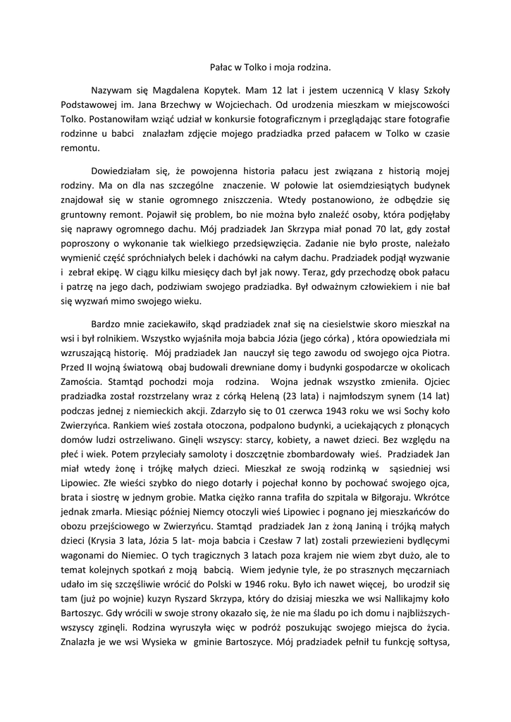 Pałac w Tolko i moja rodzina. Nazywam się Magdalena Kopytek. Mam 12 lat i jestem uczennicą V klasy Szkoły Podstawowej im. Jana Brzechwy w Wojciechach. Od urodzenia mieszkam w miejscowości Tolko. Postanowiłam wziąć udział w konkursie fotograficznym i przeglądając stare fotografie rodzinne u babci znalazłam zdjęcie mojego pradziadka przed pałacem w Tolko w czasie remontu. Dowiedziałam się, że powojenna historia pałacu jest związana z historią mojej rodziny. Ma on dla nas szczególne znaczenie. W połowie lat osiemdziesiątych budynek znajdował się w stanie ogromnego zniszczenia. Wtedy postanowiono, że odbędzie się gruntowny remont. Pojawił się problem, bo nie można było znaleźć osoby, która podjęłaby się naprawy ogromnego dachu. Mój pradziadek Jan Skrzypa miał ponad 70 lat, gdy został poproszony o wykonanie tak wielkiego przedsięwzięcia. Zadanie nie było proste, należało wymienić część spróchniałych belek i dachówki na całym dachu. Pradziadek podjął wyzwanie i zebrał ekipę. W ciągu kilku miesięcy dach był jak nowy. Teraz, gdy przechodzę obok pałacu i patrzę na jego dach, podziwiam swojego pradziadka. Był odważnym człowiekiem i nie bał się wyzwań mimo swojego wieku. Bardzo mnie zaciekawiło, skąd pradziadek znał się na ciesielstwie skoro mieszkał na wsi i był rolnikiem. Wszystko wyjaśniła moja babcia Józia (jego córka) , która opowiedziała mi wzruszającą historię. Mój pradziadek Jan nauczył się tego zawodu od swojego ojca Piotra. Przed II wojną światową obaj budowali drewniane domy i budynki gospodarcze w okolicach Zamościa. Stamtąd pochodzi moja rodzina. Wojna jednak wszystko zmieniła. Ojciec pradziadka został rozstrzelany wraz z córką Heleną (23 lata) i najmłodszym synem (14 lat) podczas jednej z niemieckich akcji. Zdarzyło się to 01 czerwca 1943 roku we wsi Sochy koło Zwierzyńca. Rankiem wieś została otoczona, podpalono budynki, a uciekających z płonących domów ludzi ostrzeliwano. Ginęli wszyscy: starcy, kobiety, a nawet dzieci. Bez względu na płeć i wiek. Potem przyleciały samoloty i doszczętnie zbombardowały wieś. Pradziadek Jan miał wtedy żonę i trójkę małych dzieci. Mieszkał ze swoją rodzinką w sąsiedniej wsi Lipowiec. Złe wieści szybko do niego dotarły i pojechał konno by pochować swojego ojca, brata i siostrę w jednym grobie. Matka ciężko ranna trafiła do szpitala w Biłgoraju. Wkrótce jednak zmarła. Miesiąc później Niemcy otoczyli wieś Lipowiec i pognano jej mieszkańców do obozu przejściowego w Zwierzyńcu. Stamtąd pradziadek Jan z żoną Janiną i trójką małych dzieci (Krysia 3 lata, Józia 5 lat- moja babcia i Czesław 7 lat) zostali przewiezieni bydlęcymi wagonami do Niemiec. O tych tragicznych 3 latach poza krajem nie wiem zbyt dużo, ale to temat kolejnych spotkań z moją babcią. Wiem jedynie tyle, że po strasznych męczarniach udało im się szczęśliwie wrócić do Polski w 1946 roku. Było ich nawet więcej, bo urodził się tam (już po wojnie) kuzyn Ryszard Skrzypa, który do dzisiaj mieszka we wsi Nallikajmy koło Bartoszyc. Gdy wrócili w swoje strony okazało się, że nie ma śladu po ich domu i najbliższychwszyscy zginęli. Rodzina wyruszyła więc w podróż poszukując swojego miejsca do życia. Znalazła je we wsi Wysieka w gminie Bartoszyce. Mój pradziadek pełnił tu funkcję sołtysa, a wszystkie jego dzieci uczęszczały do Szkoły Podstawowej w Bezledach. W latach 70-tych pradziadek wraz z rodziną przeprowadził się do Woryn. Pałac w Tolko ma jeszcze jeden ważny związek z moją rodziną. Właśnie tu odkrył swoją pasję mój wujek Zbyszek (syn babci Józi i starszy brat mojego taty Grzegorza), który od dziecka wykazywał zdolności i zainteresowania plastyczne. Podczas remontu wnętrz szczególnie zainteresował się pracą sztukatorów. Konserwatorzy odnawiali zabytkowe kominki i odnaleziony pod tynkiem herb rodowy właścicieli pałacu. Rozmawiając z wujkiem artyści poznali jego wiedzę i zainteresowania. Postanowili obejrzeć jego obrazy i rysunki. Byli nimi oczarowani. W efekcie wujek Zbyszek został zatrudniony w Pracowni Konserwacji Zabytków w Olsztynie. Później ukończył studia w Akademii Sztuk Pięknych w Toruniu na wydziale konserwacji dzieł sztuki. Dużo podróżował, pracował w różnych miejscach Polski i za granicą. Obecnie mieszka w Lublinie i pracuje przy odnawianiu zabytków Starego Miasta. Z Lublina ma blisko do rodzinnych stron. Często odwiedza miejsca, z którymi jest związana historia naszej rodziny i zapala znicze na grobach naszych przodków. Słuchając opowieści mojej babci mam coraz więcej pytań. Muszę poznać historię brata babci Józi Czesława, który również miał talent plastyczny i dzisiaj w wielu kościołach naszej gminy znajdują się jego prace. Po ukończeniu szkoły w Bezledach Czesław uczył się w Ognisku Plastycznym w Mrągowie. Wtedy zainteresowali się nim dziennikarze, którzy zimą 1953 r. przyjechali do Wysieki i nagrali o nim jeden z odcinków Polskiej Kroniki Filmowej. Babcia miała wtedy 15 lat i również wystąpiła w tym programie (ciągnęła wodę ze studni, która stoi do dzisiaj). Ona nawet pamięta jego tytuł „Warmia i Mazury. Skrzypa Czesław nie będzie Jankiem Muzykantem”. To wydarzenie mogło zmienić jego los, gdyż dostał się do liceum plastycznego w Orłowie. Jednak w (1954 r.) , gdy ukończył 18 lat został powołany do wojska i odebrano mu szansę dalszej nauki. Po wojsku Czesław Skrzypa pracował w Domu Kultury w Rodnowie, a potem zamieszkał w Wojciechach. Przebywał często w miejscowym kościele, gdzie namalował stacje drogi krzyżowej. W Wojciechach odwiedzał go młody kleryk, który odbywał służbę wojskową w jednostce w Bartoszycach. Wraz z innymi żołnierzami pracował przy drodze prowadzącej do cmentarza. Tym klerykiem był bł. Ks. Jerzy Popiełuszko. Ale to już historia na następną opowi