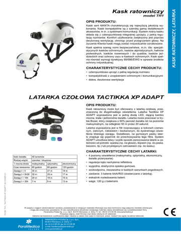 model TH1 OPIS PRODUKTU: Kaski serii MANTA charakteryzują się najwyższą jakością wykonania. Kaski kompatybilne są z szeroką gamą dodatkowych akcesoriów, m.in. z systemami komunikacji. System nośny kasku składa się z czteropunktowej integralnej uprzęży, z pełną regulacją rozmiarów. Komfort użytkowania zwiększony jest poprzez dwutorową wentylację, chroniąc przed przegrzaniem głowy. Na życzenie Klienta kaski mogą zostać indywidualnie oznakowane. Kask spełnia szereg norm bezpieczeństwa, m.in. dla: specjalistycznych kasków ochronnych, kasków alpinistycznych, hełmów podwodnych, kasków rowerowych i do quadów, kasków jeździeckich oraz ochrony uszu w kaskach ochronnych. Kask spełnia również wymogi dyrektywy 89/686/EWG w sprawie środków ochrony indywidualnej. CHARAKTERYSTYCZNE CECHY PRODUKTU: • czteropunktowa uprząż z pełną regulacją rozmiaru • kompatybilność z urządzeniami ochronnymi i komunikacyjnymi • dobra, dwutorowa wentylacja LATARKA CZOŁOWA TACTIKKA XP ADAPT OPIS PRODUKTU: Kask ratowniczy może być oferowany z latarką czołową, przeznaczoną do długotrwałego oświetlenia. Latarka Tactikka XP ADAPT wyposażona jest w jedną diodę LED, dającą bardzo mocne, białe i jednorodne światło. Latarka może pracować w trybie Boost, który zwiększa o 50% jasność światła niż na poziomie maksymalnym, na odległość 50 m przez 20 sekund. Latarka wyposażona jest w filtr rozpraszający w kolorach czerwonym, zielonym, niebieskim i bezbarwnym, do dyskretnego oświetlenia bliskiego zasięgu. Dodatkowo, na gumowym pasku latarki znajduje się pojemnik do przechowywania tego filtra. System ADAPT umożliwia łatwy i szybki sposób zamocowania latarki w zależności od potrzeb: opaską (np. na głowie), klipsem (np. do paska, kieszeni, itp.) lub przyklejanym zatrzaskiem (np. do kasku). KASK TH1, TACTIKKA XP ADAPT: 0613WER.01 CHARAKTERYSTYCZNE CECHY LATARKI: Ilość światła: 40 lumenów Rodzaj wiązki: szeroka / skupiona 1 mocna dioda maksymalny • 4 poziomy oświetlenia (maksymalny, optymalny, ekonomiczny, światło przerywane). • regulacja kąta nachylenia reflektora. optymalny ekonomiczny Czas świecenia: 60 godzin 80 godzin 120 godzin Zasięg t = 0 35 m 27 m 18 m Zasięg t = 0h30 30 m 25 m 17 m Zasięg t = 10h 20 m 19 m 15 m • wskaźnik rozładowania baterii. Zasięg t = 30h 7m 9m 13 m • waga: 120 g z bateriami. • wygodna, elastyczna opaska gumowa. • wodoodporna, niezawodna w każdych warunkach pogodowych. • zasilanie: 3 baterie AAA/R03 (dostarczane z latarką). W związku z ciągłym udoskonalaniem wyrobów, przedstawione w niniejszym materiale informacje oraz dane techniczne mają wyłącznie charakter orientacyjny i mogą ulec zmianie bez uprzedzenia. W celu zweryfikowania aktualności niniejszego materiału należy skontaktować się z przedstawicielem firmy Paramedica Polska Sp. z o.o. Sp.k. 02-815 Warszawa; ul. Żołny 11; tel: +48 22 313 09 39; www.paramedica.pl Powyższe zdjęcia, znaki firmowe oraz teksty należą do ich właścicieli. Zabrania się kopiowania i publikowania zdjęć i tekstów w całości i/lub części w internecie, prasie, mediach bez zgody na piśmie właścicieli. PARAMEDICA POLSKA Sp. z o.o. Sp.k. 02-815 Warszawa, ul. Żołny 11 tel. 22 313 09 39, fax 22 313 09 59 e-mail: [email protected] www.paramedica.pl KASK RATOWNICZY, LATARKA Kask ratowniczy