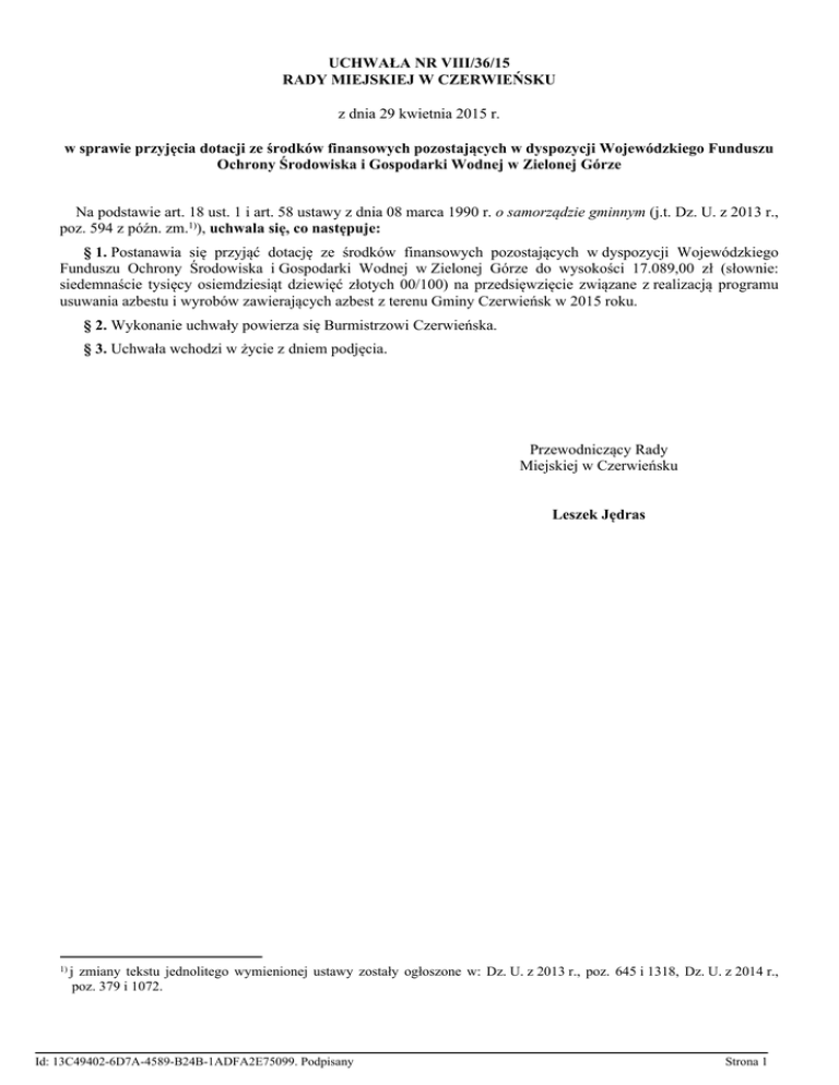 UCHWAŁA NR VIII/36/15 RADY MIEJSKIEJ W CZERWIEŃSKU z dnia 29 kwietnia 2015 r. w sprawie przyjęcia dotacji ze środków finansowych pozostających w dyspozycji Wojewódzkiego Funduszu Ochrony Środowiska i Gospodarki Wodnej w Zielonej Górze Na podstawie art. 18 ust. 1 i art. 58 ustawy z dnia 08 marca 1990 r. o samorządzie gminnym (j.t. Dz. U. z 2013 r., poz. 594 z późn. zm.1)), uchwala się, co następuje: § 1. Postanawia się przyjąć dotację ze środków finansowych pozostających w dyspozycji Wojewódzkiego Funduszu Ochrony Środowiska i Gospodarki Wodnej w Zielonej Górze do wysokości 17.089,00 zł (słownie: siedemnaście tysięcy osiemdziesiąt dziewięć złotych 00/100) na przedsięwzięcie związane z realizacją programu usuwania azbestu i wyrobów zawierających azbest z terenu Gminy Czerwieńsk w 2015 roku. § 2. Wykonanie uchwały powierza się Burmistrzowi Czerwieńska. § 3. Uchwała wchodzi w życie z dniem podjęcia. Przewodniczący Rady Miejskiej w Czerwieńsku Leszek Jędras 1) j zmiany tekstu jednolitego wymienionej ustawy zostały ogłoszone w: Dz. U. z 2013 r., poz. 645 i 1318, Dz. U. z 2014 r., poz. 379 i 1072. Id: 13C49402-6D7A-4589-B24B-1ADFA2E75099. Podpisany Strona 1 Uzasadnienie Zgodnie z obowiązującymi przepisami usuwanie wyrobów zawierających azbest może być realizowane wyłącznie przez specjalistyczne firmy, posiadające w tym zakresie odpowiednie uprawnienia. Z uwagi na uwarunkowania prawne i wysokie koszty usuwania oraz unieszkodliwiania wyrobów azbestowych niezbędne jest udzielenie na ten cel pomocy finansowej dla właścicieli nieruchomości, na których występują materiały zawierające azbest. W związku z powyższym Gmina Czerwieńsk złożyła do Wojewódzkiego Funduszu Ochrony Środowiska i Gospodarki Wodnej w Zielonej Górze wniosek o dofinansowanie usuwania wyrobów zawierających azbest. Procentowy udział dofinansowania z WFOŚiGW w Zielonej Górze w kwalifikowanym koszcie zadania wynosi 100%. W odpowiedzi na wniosek Wojewódzki Fundusz Ochrony Środowiska i Gospodarki Wodnej w Zielonej Górze poinformował, że decyzją Zarządu Funduszu podjętą na posiedzeniu w dniu 19.02.2015 roku wniosek został przyjęty do planu działalności Funduszu na rok 2015 w ramach środków zarezerwowanych na realizację Programu pn.: „Usuwanie wyrobów zawierających azbest”. Na realizację zadania, o którym mowa, zaplanowano wstępnie dofinansowanie w wysokości 7.089,00 zł i do 100% kosztów kwalifikowanych zadania w formie dotacji. Kwota dofinansowania przedsięwzięcia wyniesie 100% całkowitego kosztu, przy czym kwota dotacji nie może przekroczyć iloczynu 800 zł i sumy całkowitej ilości unieszkodliwionych odpadów zawierających azbest. Gmina Czerwieńsk składając 28 stycznia 2015 roku wstępny wniosek o dofinansowanie z WFOŚiGW w Zielonej Górze na w/w zadanie ujęła koszt realizacji zadania wynikający ze złożonych już przez mieszkańców wniosków do Burmistrza Czerwieńska. Jednak z dnia 31 marca na 01 kwietnia w wyniku silnych wiatrów został uszkodzony dach budynku mieszkalnego i gospodarczego pokrytego eternitem w miejscowości Wyszyna. Właściciele budynku na skutek dużych uszkodzeń dachu zmuszeni są do zmiany pokrycia dachowego na budynku mieszkalnym i usunięcia pozrywanych elementów płyt eternitowych z budynków gospodarczych - chcieliby skorzystać z dofinansowania w ramach Programu pn.: „Usuwanie wyrobów zawierających azbest”. Budynek pokryty eternitem w miejscowości Wyszyna ujęty jest w „Inwentaryzacji wyrobów zawierających azbest na terenie Gminy Czerwieńsk”, która została załączona do naszego wniosku do WFOŚiGW w Zielonej Górze z dnia 28 stycznia 2015 roku. W związku z sytuacją, której nie można było przewidzieć wcześniej, Burmistrz Czerwieńska podjął decyzję aby nieruchomość pokrytą eternitem w miejscowości Wyszyna przyjąć do realizacji zadania. W związku z powyższym Urząd Gminy i Miasta w Czerwieńsku zwracił sięz prośbą do Prezesa Zarządu WFOŚiGW w Zielonej Górze o przyznanie Gminie Czerwieńsk wyższego dofinansowania na zadanie zgłoszone przez Gminę. Szacuję się, że dodatkowy koszt – nie ujęty we wstępnym wniosku to około 10.000,00 zł. W związku z tym tut. urząd wnioskował o przyznanie Gminie Czerwieńsk dotacji w wysokości 17.089,00 zł. Rzeczywisty koszt realizacji zadania Gmina Czerwieńsk wykaże po zrealizowaniu całości prac na terenie Gminy przy rozliczeniu końcowym. Biorąc powyższe pod uwagę zasadne jest podjęcie niniejszej uchwały. opracowała: M. Pietrowicz - Szmyt Id: 13C49402-6D7A-4589-B24B-1ADFA2E75099. Podpisany Strona 1