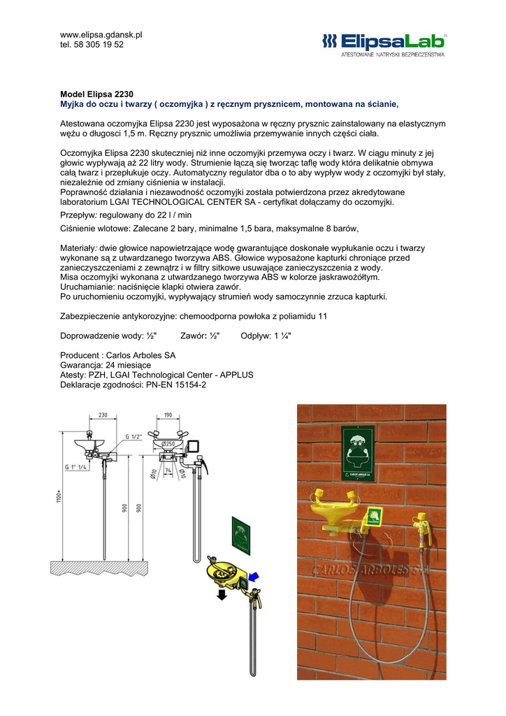 www.elipsa.gdansk.pl tel. 58 305 19 52 Model Elipsa 2230 Myjka do oczu i twarzy ( oczomyjka ) z ręcznym prysznicem, montowana na ścianie, Atestowana oczomyjka Elipsa 2230 jest wyposażona w ręczny prysznic zainstalowany na elastycznym wężu o długosci 1,5 m. Ręczny prysznic umożliwia przemywanie innych części ciała. Oczomyjka Elipsa 2230 skuteczniej niż inne oczomyjki przemywa oczy i twarz. W ciągu minuty z jej głowic wypływają aż 22 litry wody. Strumienie łączą się tworząc taflę wody która delikatnie obmywa całą twarz i przepłukuje oczy. Automatyczny regulator dba o to aby wypływ wody z oczomyjki był stały, niezależnie od zmiany ciśnienia w instalacji. Poprawność działania i niezawodność oczomyjki została potwierdzona przez akredytowane laboratorium LGAI TECHNOLOGICAL CENTER SA - certyfikat dołączamy do oczomyjki. Przepływ: regulowany do 22 l / min Ciśnienie wlotowe: Zalecane 2 bary, minimalne 1,5 bara, maksymalne 8 barów, Materiały: dwie głowice napowietrzające wodę gwarantujące doskonałe wypłukanie oczu i twarzy wykonane są z utwardzanego tworzywa ABS. Głowice wyposażone kapturki chroniące przed zanieczyszczeniami z zewnątrz i w filtry sitkowe usuwające zanieczyszczenia z wody. Misa oczomyjki wykonana z utwardzanego tworzywa ABS w kolorze jaskrawożółtym. Uruchamianie: naciśnięcie klapki otwiera zawór. Po uruchomieniu oczomyjki, wypływający strumień wody samoczynnie zrzuca kapturki. Zabezpieczenie antykorozyjne: chemoodporna powłoka z poliamidu 11 Doprowadzenie wody: ½" Zawór: ½" Odpływ: 1 ¼" Producent : Carlos Arboles SA Gwarancja: 24 miesiące Atesty: PZH, LGAI Technological Center - APPLUS Deklaracje zgodności: PN-EN 15154-2