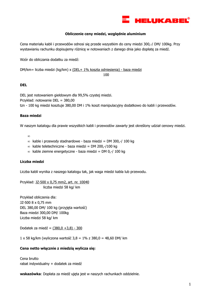 Obliczenie ceny miedzi, względnie aluminium Cena materiału kabli i przewodów odnosi się przede wszystkim do ceny miedzi 300,-/ DM/ 100kg. Przy wystawianiu rachunku dopisujemy róŜnicę w notowaniach z danego dnia jako dopłatę za miedź. Wzór do obliczania dodatku za miedź: DM/km= liczba miedzi (kg/km) x (DEL+ 1% koszta odniesienia) - baza miedzi 100 DEL DEL jest notowaniem giełdowym dla 99,5% czystej miedzi. Przykład: notowanie DEL = 380,00 tzn - 100 kg miedzi kosztuje 380,00 DM i 1% koszt manipulacyjny dodatkowo do kabli i przewodów. Baza miedzi W naszym katalogu dla prawie wszystkich kabli i przewodów zawarty jest określony udział cenowy miedzi. • • kable i przewody stadnardowe - baza miedzi = DM 300,-/ 100 kg • kable teletechniczne - baza miedzi = DM 200,-/100 kg • kable ziemne energetyczne - baza miedzi = DM 0,-/ 100 kg Liczba miedzi Liczba kabli wynika z naszego katalogu tak, jak waga miedzi kabla lub przewodu. Przykład: JZ-500 x 0,75 mm2, art. nr. 10040 liczba miedzi 58 kg/ km Przykład obliczenia dla: JZ-500 8 x 0,75 mm DEL 380,00 DM/ 100 kg (przyjęta wartość) Baza miedzi 300,00 DM/ 100kg Liczba miedzi 58 kg/ km Dodatek za miedź = (380,0 +3,8) - 300 1 x 58 kg/km (wyliczona wartość 3,8 = 1% z 380,0 = 48,60 DM/ km Cena netto włącznie z miedzią wylicza się: Cena brutto rabat indywidualny + dodatek za miedź wskazówka: Dopłata za miedź ujęta jest w naszych rachunkach oddzielnie. 1 Przykłady obliczeń: Przyjęte: notowanie DEL 380,- DM/ 100 kg dla miedzi notowanie dnia 340,- DM/ 100 kg dla aluminium rabat indywidulany np. 20% NYY-J 3 x 70/ 35 sm 0,6/1 kV , nr art. 32038 Ilość zamówiona 1000m Cena (baza miedzi = 0) 11810,00 DM/ km ./. 20% 2362,00 DM/ km 9448,00 DM/ km + dodatek za miedź : (380,00 +3,8) -0 x liczba miedzi: 100 daje razem 3,838 DM/ kg x 2352 kg/km = 9026,98 DM/ km 18474,98DM/ km 2