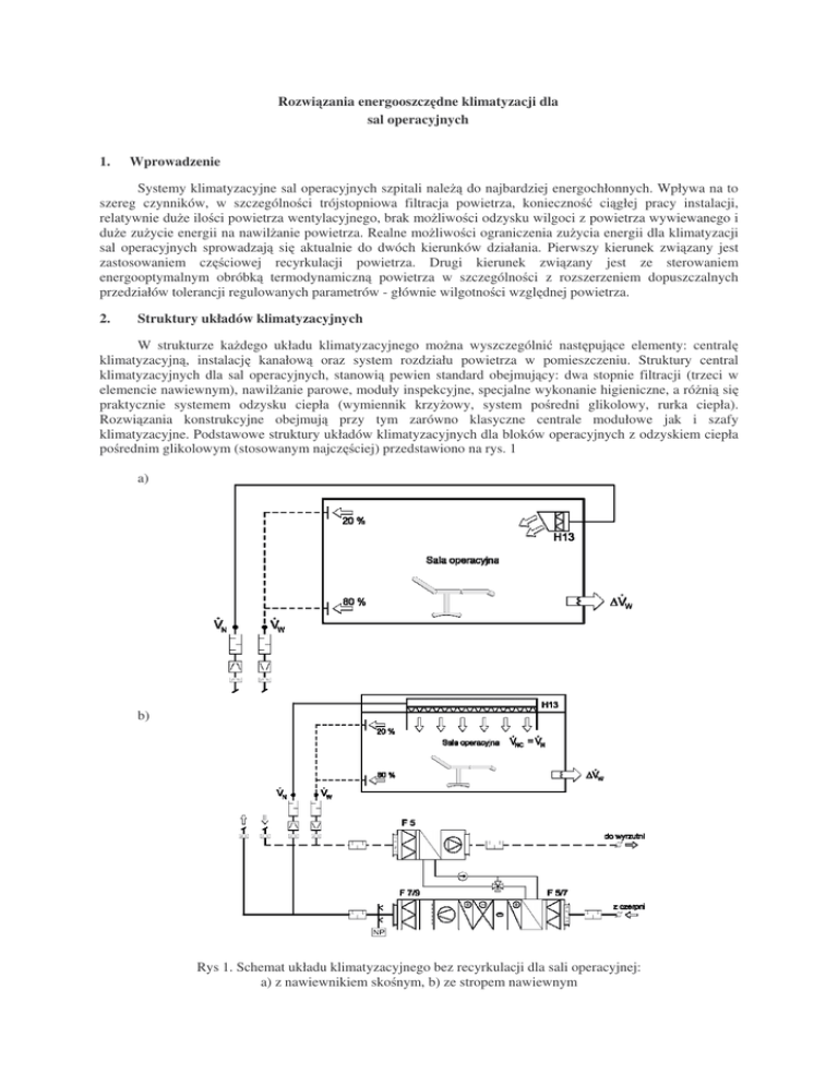Rozwi zania energooszcz dne klimatyzacji dla sal operacyjnych 1. Wprowadzenie Systemy klimatyzacyjne sal operacyjnych szpitali nale do najbardziej energochłonnych. Wpływa na to szereg czynników, w szczególno ci trójstopniowa filtracja powietrza, konieczno ci głej pracy instalacji, relatywnie du e ilo ci powietrza wentylacyjnego, brak mo liwo ci odzysku wilgoci z powietrza wywiewanego i du e zu ycie energii na nawil anie powietrza. Realne mo liwo ci ograniczenia zu ycia energii dla klimatyzacji sal operacyjnych sprowadzaj si aktualnie do dwóch kierunków działania. Pierwszy kierunek zwi zany jest zastosowaniem cz ciowej recyrkulacji powietrza. Drugi kierunek zwi zany jest ze sterowaniem energooptymalnym obróbk termodynamiczn powietrza w szczególno ci z rozszerzeniem dopuszczalnych przedziałów tolerancji regulowanych parametrów - głównie wilgotno ci wzgl dnej powietrza. 2. Struktury układów klimatyzacyjnych W strukturze ka dego układu klimatyzacyjnego mo na wyszczególni nast puj ce elementy: central klimatyzacyjn , instalacj kanałow oraz system rozdziału powietrza w pomieszczeniu. Struktury central klimatyzacyjnych dla sal operacyjnych, stanowi pewien standard obejmuj cy: dwa stopnie filtracji (trzeci w elemencie nawiewnym), nawil anie parowe, moduły inspekcyjne, specjalne wykonanie higieniczne, a ró ni si praktycznie systemem odzysku ciepła (wymiennik krzy owy, system po redni glikolowy, rurka ciepła). Rozwi zania konstrukcyjne obejmuj przy tym zarówno klasyczne centrale modułowe jak i szafy klimatyzacyjne. Podstawowe struktury układów klimatyzacyjnych dla bloków operacyjnych z odzyskiem ciepła po rednim glikolowym (stosowanym najcz ciej) przedstawiono na rys. 1 a) b) Rys 1. Schemat układu klimatyzacyjnego bez recyrkulacji dla sali operacyjnej: a) z nawiewnikiem sko nym, b) ze stropem nawiewnym System z nawiewnikiem sko nym stosuje si dla sal zabiegowo-operacyjnych, dla pozostałych sal operacyjnych klasycznym rozwi zaniem jest system ze stropem nawiewnym. Powietrze nawiewane do sali operacyjnej po przej ciu przez trzy stopnie filtracji jest praktycznie sterylne, zatem o czysto ci mikrobiologicznej w strefie chronionej decyduje głównie powierzchnia obj ta przepływem wyporowym, który ogranicza niebezpiecze stwo mieszania powietrza. Eliminuje to mo liwo przedostania si mikroorganizmów do pola operacyjnego. Współcze nie dla sal wysokoaseptycznych strefa chroniona stanowi około 25% powierzchni sali operacyjnej (~9 m2) i obejmuje stół operacyjny, stół z instrumentami oraz zespół operacyjny. Implikuje to bardzo du e ilo ci powietrza wentylacyjnego. Rozwi zaniem ograniczaj cym koszty obróbki termodynamicznej i przetłaczania powietrza s tutaj układy klimatyzacyjne z cz ciow recyrkulacj powietrza rys. 2, 3, 4. Rys 2. Schemat układu klimatyzacyjnego dla sali operacyjnej ze stropem nawiewnym recyrkulacyjnym Rys 3. Układ klimatyzacyjny z modułami ciennymi recyrkulacyjnymi firmy Weiss Klimatechnik [2] Rys 4. Układ klimatyzacyjny z recyrkulacyjnymi szafami klimatyzacyjnymi firmy Weiss Klimatechnik [2] 3. Model symulacyjny, zu ycie energii W celu wykazania mo liwych do uzyskania oszcz dno ci energetycznych w wyniku wprowadzenia cz ciowej recyrkulacji powietrza lub rozszerzenia dopuszczalnych przedziałów regulacji parametrów wyznaczono roczne zu ycie energii dla analizowanych układów. Roczne zu ycie energii na obróbk i przetłaczanie powietrza wyznaczono w oparciu o model symulacyjny działania układu w ci gu całego roku. Punktem wyj cia analizy było tutaj wyznaczenie algorytmów optymalnej obróbki powietrza uwzgl dniaj cej mo liwo ci układu sterowania i automatycznej regulacji dla analizowanych struktur układów klimatyzacyjnych. Jako parametry klimatu zewn trznego przyj to dane tzw. roku porównawczego [1] stanowi cego zbór 8760 par parametrów (co godzin w ci gu roku): temperatury i wilgotno ci wzgl dnej powietrza, otrzymanych w oparciu o wieloletnie dane klimatyczne dla okre lonej strefy klimatycznej. W analizie porównawczej nakładów energetycznych przeprowadzono obliczenia rocznego zu ycia energii dla dwóch układów klimatyzacyjnych sali operacyjnej: wariant 1 - wielkopowierzchniowy strop nawiewny bez recyrkulacji (rys. 1b), strumie powietrza nawiewanego 7200 m3/h, strumie powietrza wywiewanego 6720 m3/h wariant 2 - wielkopowierzchniowy strop nawiewny z recyrkulacj (rys. 2), strumie powietrza nawiewanego 7200 m3/h -w tym 2400 m3/h powietrza zewn trznego, strumie powietrza wywiewanego 6720 m3/h Szczegółowy algorytm oblicze zawarty jest w pracach [5, 6]. Wyniki oblicze , w tym jednostkowe roczne zu ycie energii (w przeliczeniu na m3/h powietrza nawiewanego przez strop nawiewny pola operacyjnego) przedstawiono na rys. 5, natomiast struktur rocznego zu ycia energii pierwotnej - na rys. 6. Wyniki oblicze pozwalaj na wyci gniecie nast puj cych wniosków: • zastosowanie układu klimatyzacyjnego z recyrkulacj (wariant 2) pozwala na ograniczenie zu ycia energii w stosunku do układu bez recyrkulacji (wariant 1), przy czym zmniejszenie zu ycia energii jest tutaj nast puj ce: nagrzewnice - 5-krotne, chłodnica - 2,7-krotne, nawil acz parowy - 3,2-krotne, wentylatory - 2,5-krotne, ł cznie dla energii pierwotnej - 3,3-krotne. • w strukturze zu ycia energii pierwotnej na obróbk termodynamiczn i przetłaczanie powietrza dominuje nawil anie parowe (~57%), nast pnie nagrzewnice (~13÷20%) przetłaczanie (~14÷19%) i chłodzenie (~8%), przy czym struktura ta pozostaje praktycznie taka sama dla obydwu analizowanych wariantów układów klimatyzacyjnych, • dominuj cy udział nawil ania w strukturze zu ycia energii na obróbk powietrza wynika z braku mo liwo ci odzysku ciepła utajonego z powietrza wywiewanego dla układów klimatyzacyjnych sal operacyjnych, jedyna mo liwo ograniczenia tych nakładów energetycznych polega na wyborze układu z mniejsz ilo ci powietrza zewn trznego (wariant 2), zmian no nika energii np. wytwornica gazowa zam
