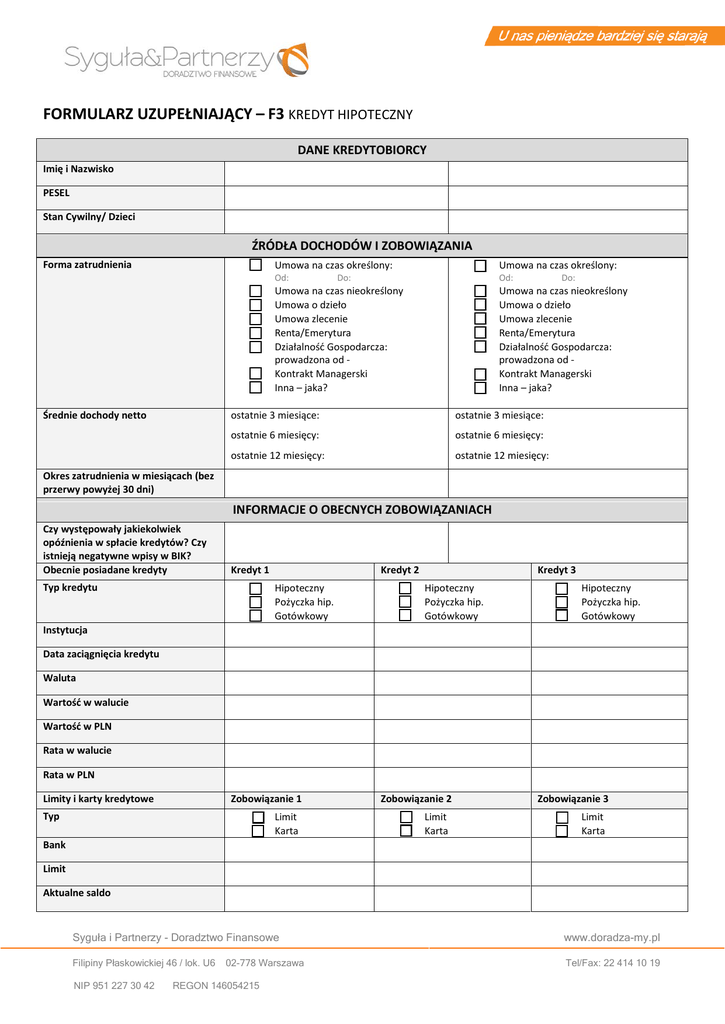 FORMULARZ UZUPEŁNIAJĄCY – F3 KREDYT HIPOTECZNY DANE KREDYTOBIORCY Imię i Nazwisko PESEL Stan Cywilny/ Dzieci ŹRÓDŁA DOCHODÓW I ZOBOWIĄZANIA Forma zatrudnienia Umowa na czas określony: Umowa na czas określony: Umowa na czas nieokreślony Umowa o dzieło ͏ Umowa zlecenie ͏ Renta/Emerytura ͏ Działalność Gospodarcza: prowadzona od Kontrakt Managerski Inna – jaka? Umowa na czas nieokreślony Umowa o dzieło ͏ Umowa zlecenie ͏ Renta/Emerytura ͏ Działalność Gospodarcza: prowadzona od Kontrakt Managerski Inna – jaka? Od: Średnie dochody netto Do: Od: Do: ostatnie 3 miesiące: ostatnie 3 miesiące: ostatnie 6 miesięcy: ostatnie 6 miesięcy: ostatnie 12 miesięcy: ostatnie 12 miesięcy: Okres zatrudnienia w miesiącach (bez przerwy powyżej 30 dni) INFORMACJE O OBECNYCH ZOBOWIĄZANIACH Czy występowały jakiekolwiek opóźnienia w spłacie kredytów? Czy istnieją negatywne wpisy w BIK? Obecnie posiadane kredyty Kredyt 1 Typ kredytu Kredyt 2 Hipoteczny Pożyczka hip. Gotówkowy Instytucja Kredyt 3 Hipoteczny Pożyczka hip. Gotówkowy Hipoteczny Pożyczka hip. Gotówkowy Data zaciągnięcia kredytu Waluta Wartość w walucie Wartość w PLN Rata w walucie Rata w PLN Limity i karty kredytowe Zobowiązanie 1 Typ Limit Karta Bank Zobowiązanie 2 Limit Karta Zobowiązanie 3 Limit Karta Limit Aktualne saldo Syguła i Partnerzy - Doradztwo Finansowe www.doradza-my.pl Filipiny Płaskowickiej 46 / lok. U6 Tel/Fax: 22 414 10 19 NIP 951 227 30 42 02-778 Warszawa REGON 146054215 INFORMACJE DO KALKULACJI KREDYTOWEJ Rodzaj preferowanego kredytu Hipoteczny Pożyczka hipoteczna Kwota kredytu Cel kredytowania Budowa Konsolidacja zobowiązań Pożyczka hipoteczna Refinansowanie Remont nieruchomości Zakup nieruchomości Zakup nieruchomości + remont Zakup nieruchomości + wykończenie Zakup działki + budowa Zakup działki + dokończenie budowy Dowolny Dom Działka Mieszkanie Lokal użytkowy Inny – jaki? Rodzaj nieruchomości Docelowa wartość nieruchomości Planowana wartość remontu / wykończenia Powierzchnia nieruchomości Rodzaj własności Pełna własność z Księgą Wieczystą Spółdzielcze Własnościowe z Księgą Wieczystą Spółdzielcze Własnościowe bez Księgi Wieczystej Inny Pierwotny Wtórny Tak Nie PLN EUR CHF GBP Rynek zakupu nieruchomości (jeśli dotyczy) Nieruchomość stanowi własność osoby trzeciej Waluta preferowanego kredytu Adres nieruchomości Wysokość wkładu własnego Dodatkowe informacje Preferencje Klienta Syguła i Partnerzy - Doradztwo Finansowe www.doradza-my.pl Filipiny Płaskowickiej 46 / lok. U6 Tel/Fax: 22 414 10 19 NIP 951 227 30 42 02-778 Warszawa REGON 146054215 ZGODA NA PRZETWARZANIE DANYCH OSOBOWYCH PRZEZ PIOTR SYGUŁA I PARTNERZY – DORADZTWO FINANSOWE Niniejszym udzielam zgody, w rozumieniu art. 23 ust. 1 pkt. 1 Ustawy z dnia 29 sierpnia 1997r. o ochronie danych osobowych (Dz. U. 2002, nr 101, poz. 926 ze zm.), na przetwarzanie przez firmę Piotr Syguła i Partnerzy - Doradztwo Finansowe moich danych osobowych na określonych poniżej warunkach. I. Administrator danych osobowych. Piotr Syguła i Partnerzy - Doradztwo Finansowe 02-778 Warszawa, Filipiny Płaskowickiej 46 / lok. U6 Telefon: 0 22 414 10 19 Fax: E-Mail: [email protected] Internet: www.doradza-my.pl II. Zakres przetwarzania danych osobowych. 1. Dane osobowe: Zakres przetwarzania danych Dane klienta A. Imię i nazwisko C. Data i miejsce urodzenia D. Numer PESEL E. Adres zameldowania F. Adres korespondencyjny G. Numer telefonu komórkowego H. Adres e-mail 2. B. Płeć Dane majątkowe – zawarte w formularzach uzupełniających sporządzonych i przekazanych przeze mnie przedstawicielowi firmy Piotr Syguła i Partnerzy – Doradztwo Finansowe, w szczególności dane dotyczące: A. Aktualnego stanu majątkowego, B. Zawartych umów ubezpieczeń majątkowych i osobowych. III. Cele przetwarzania danych osobowych. 1. Przedstawienie klientowi indywidualnej, optymalnej dla jego potrzeb, oferty produktów i usług finansowych, 2. Bieżąca weryfikacja adekwatności i efektywności produktów i usług finansowych, zaoferowanych i/lub realizowanych w stosunku do Klienta, 3. Podejmowanie w stosunku do Klienta działań marketingowych i promocyjnych, dotyczących oferowanych produktów i usług finansowych. 4. Możliwość uczestnictwa w programie promocyjnym polecash.pl organizowanym w formie konkursu niepublicznego. IV. Okres przetwarzania danych osobowych. 1. Niniejsza zgoda ma charakter bezterminowy i obejmuje również przetwarzanie przez firmę Piotr Syguła i Partnerzy - Doradztwo Finansowe danych osobowych Klienta w przyszłości, pod warunkiem, że nie ulegną zmianie cele przetwarzania określone w pkt. III. V. Przekazywanie danych osobowych osobom trzecim. 1. Dane osobowe Klienta będą traktowanie jako ściśle poufne i nie będą udostępniane osobom trzecim bez zgody Klienta, chyba, że przepisy prawa powszechnie obowiązującego będą stanowić inaczej. Firma zobowiązuje się do zabezpieczenia danych osobowych Klienta poprzez zastosowanie odpowiednich środków technicznych i organizacyjnych, przewidzianych w Ustawie z dnia 29 sierpnia 1997 r. o ochronie danych osobowych (Dz. U. 2002, nr 101, poz. 926 ze zm.). VI. Prawa Klienta związane z przetwarzaniem jego danych osobowych. Klientowi przysługuje prawo kontroli przetwarzania danych osobowych, które jego dotyczą, a zwłaszcza prawo do: 1. Uzyskania wyczerpującej informacji, czy jego dane są włączone do zbioru danych i jaka jest nazwa tego zbioru oraz do ustalenia administratora danych, adresu jego siedziby i pełnej nazwy, 2. Uzyskania informacji o celu, zakresie i sposobie przetwarzania danych zawartych w zbiorze, 3. Uzyskania informacji, od kiedy przetwarza się w zbiorze dane jego dotyczące oraz podania w powszechnie zrozumiałej formie treści tych danych, 4. Uzyskania informacji o źródle, z którego pochodzą dane jego dotyczące, 5. Uzyskania informacji o sposobie udostępniania danych, a w szczeg