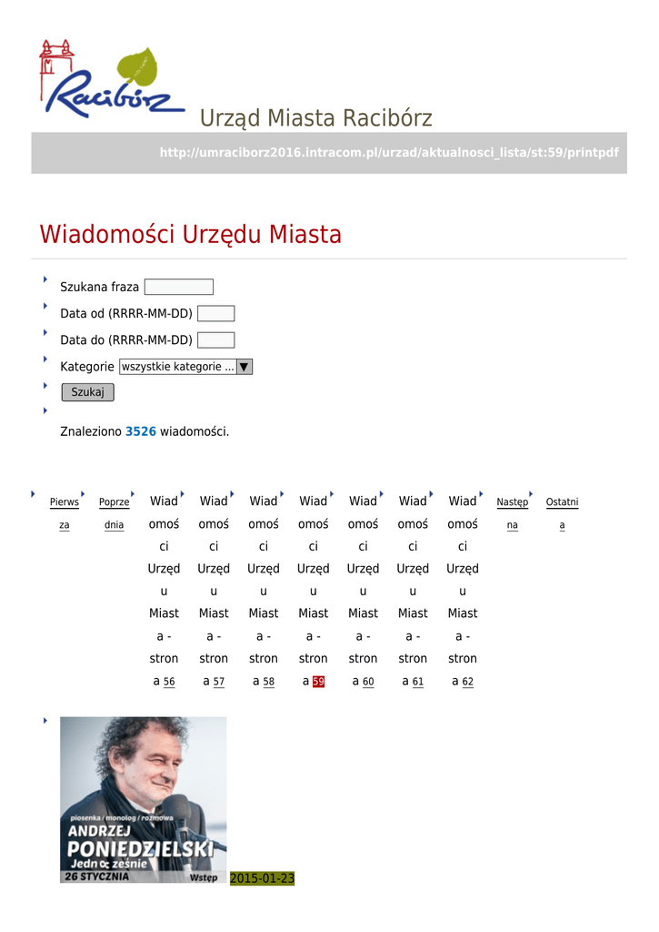 Urząd Miasta Racibórz http://umraciborz2016.intracom.pl/urzad/aktualnosci_lista/st:59/printpdf Wiadomości Urzędu Miasta Szukana fraza Data od (RRRR-MM-DD) Data do (RRRR-MM-DD) Kategorie wszystkie kategorie ... ▼ Szukaj Znaleziono 3526 wiadomości. Pierws Poprze Wiad Wiad Wiad Wiad Wiad Wiad Wiad Następ Ostatni za dnia omoś omoś omoś omoś omoś omoś omoś na a ci ci ci ci ci ci ci Urzęd Urzęd Urzęd Urzęd Urzęd Urzęd Urzęd u u u u u u u Miast Miast Miast Miast Miast Miast Miast a- a- a- a- a- a- a- stron stron stron stron stron stron stron a 56 a 57 a 58 a 59 a 60 a 61 a 62 2015-01-23 Wieczór z Andrzejem Poniedzielskim kategoria: Wiadomości i wydarzenia Na spotkanie z Andrzejem Poniedzielskim poetą, autorem tekstów piosenek, humorystą, twórcą scenariuszy 26 stycznia o godz. 18:00 zaprasza raciborska Biblioteka. 2015-01-23 Ogłoszenie konkursu ofert na wykonanie zadań publicznych kategoria: Wiadomości i wydarzenia Otwarty konkurs ofert na wykonanie zadań publicznych z obszarów: przeciwdziałanie uzależnieniom i patologiom społecznym; ochrona i promocja zdrowia; działalnośćna rzecz osób niepełnosprawnych oraz pomoc społeczna, w tym pomoc rodzinom i osobom w trudenj sytuacji życiowej oraz wyrównywanie szans tych rodzin i osób na rok 2015 2015-01-22 Akcja Zima w mieście 2015 kategoria: Wiadomości i wydarzenia 2 lutego rozpoczynają się dwutygodniowe ferie zimowe dla szkół naszego województwa. Miasto Racibórz wspólnie z jednostkami kultury i sportu przygotowało ciekawą i zróżnicowaną ofertę zajęć dla wszystkich, którzy zimową przerwę w zajęciach szkolnych spędzają w Raciborzu. 2015-01-21 Kulinarni Odkrywcy z Raciborza podbili serca Jury kategoria: Wiadomości i wydarzenia Wśród najlepszych znalazł się film zespołu „Filmowcy z Ostroga” ze Szkoły Podstawowej nr 1 z Oddziałami Integracyjnymi w Raciborzu, który podbił serca jurorów i wygrał w kategorii „Najbardziej utalentowani filmowcy”. 2015-01-21 Kwalifikacja wojskowa 2015 kategoria: Wiadomości i wydarzenia Kwalifikacja wojskowa dla osób zamieszkałych na terenie powiatu raciborskiego zostanie przeprowadzona w budynku Starostwa Powiatowego przy Placu Okrzei 4 w okresie od 16.02.2015 r. do 13.03.2015 r. od poniedziałku do piątku w godzinach od 11.00 do 17.00. 2015-01-21 Porządek obrad najbliższej sesji kategoria: Wiadomości i wydarzenia 28 stycznia 2015 r. o godz. 14.00 w sali kolumnowej Urzędu Miasta Racibórz przy ul. Stefana Batorego 6 odbedzie się sesja Rady Miasta Racibórz. Zobacz porządek obrad. 2015-01-16 Grupa MoCarta z nowym programem zawita do Raciborza kategoria: Wiadomości i wydarzenia Nowy program Grupy MoCarta to największe przeboje muzyki nie tylko klasycznej, inteligentny żart i mnóstwo energii z całego świata - jednym słowem będzie CZAD! Grupa wystąpi w Raciborskim Centrum Kultury 19 lutego o godz.17.00. 2015-01-16 Koncert karnawałowy we włoskim klimacie w RCK kategoria: Wiadomości i wydarzenia 12 lutego o godz. 18.00 Raciborskie Centrum Kultury zaprasza na koncert karnawałowy we włoskim klimacie! Najpiękniejsze hity operetkowe i neopolitańskie nad kanałami Wenecji i w teatrze "La Fenice" zaprezentują gwiazdy opery i operetki. 2015-01-12 Więcej ulg na bilety do Raciborskiego Centrum Kultury kategoria: Wiadomości i wydarzenia Do tej pory na 50-procentową obniżkę ceny biletu na wydarzenia organizowane przez Raciborskie Centrum Kultury mogli liczyć seniorzy posiadający kartę "Senior 60+". Od teraz uprawnionych do tańszych wejściówek będzie więcej. Kto skorzysta? 2015-01-12 Prawie 3 tys. zł z licytacji WOŚP w RCK kategoria: Wiadomości i wydarzenia 500 zł - to najwyższa kwota jaką udało się wylicytować w Raciborskim Centrum Kultury podczas licytacji przedmiotów przekazanych na rzecz Wielkiej Orkiestry Świątecznej Pomocy. Co wylicytowano przy ul. Chopina? Pierws Poprze Wiad Wiad Wiad Wiad Wiad Wiad Wiad Następ Ostatni za dnia omoś omoś omoś omoś omoś omoś omoś na a ci ci ci ci ci ci ci Urzęd Urzęd Urzęd Urzęd Urzęd Urzęd Urzęd u u u u u u u Miast Miast Miast Miast Miast Miast Miast a- a- a- a- a- a- a- stron stron stron stron stron stron stron a 56 a 57 a 58 a 59 a 60 a 61 a 62