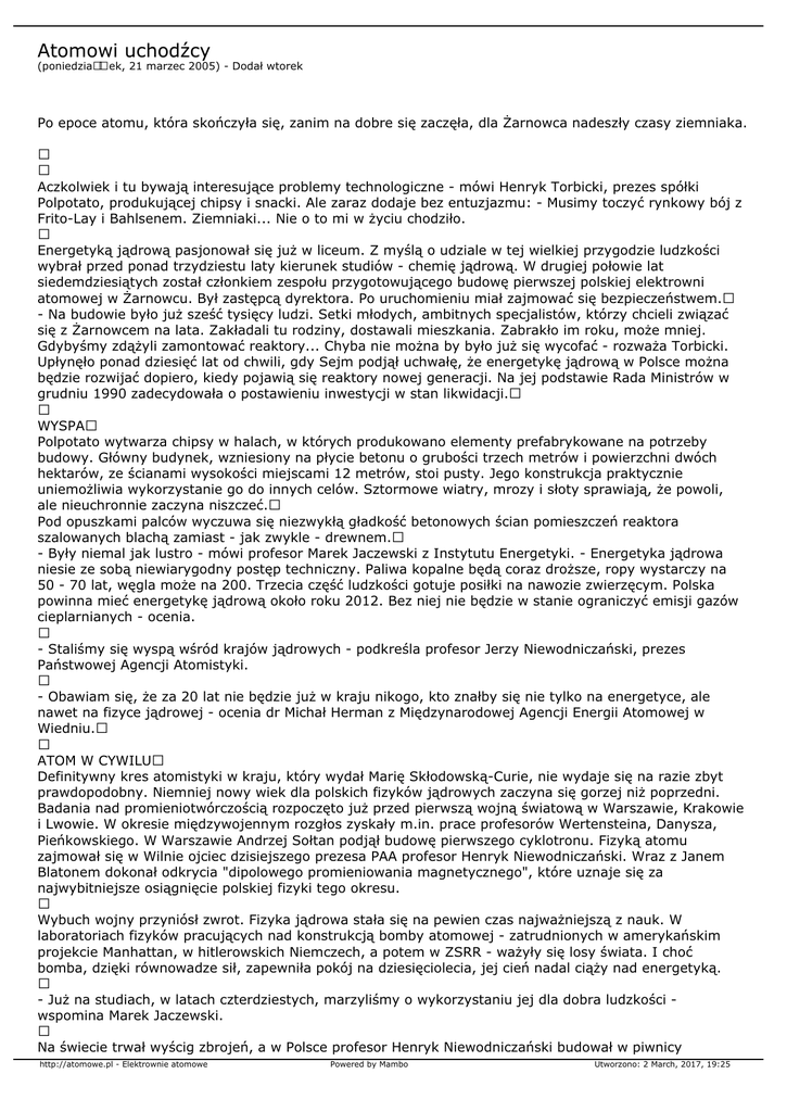 Atomowi uchodźcy (poniedziaÅ‚ek, 21 marzec 2005) - Dodał wtorek Po epoce atomu, która skończyła się, zanim na dobre się zaczęła, dla Żarnowca nadeszły czasy ziemniaka. Aczkolwiek i tu bywają interesujące problemy technologiczne - mówi Henryk Torbicki, prezes spółki Polpotato, produkującej chipsy i snacki. Ale zaraz dodaje bez entuzjazmu: - Musimy toczyć rynkowy bój z Frito-Lay i Bahlsenem. Ziemniaki... Nie o to mi w życiu chodziło. Energetyką jądrową pasjonował się już w liceum. Z myślą o udziale w tej wielkiej przygodzie ludzkości wybrał przed ponad trzydziestu laty kierunek studiów - chemię jądrową. W drugiej połowie lat siedemdziesiątych został członkiem zespołu przygotowującego budowę pierwszej polskiej elektrowni atomowej w Żarnowcu. Był zastępcą dyrektora. Po uruchomieniu miał zajmować się bezpieczeństwem. - Na budowie było już sześć tysięcy ludzi. Setki młodych, ambitnych specjalistów, którzy chcieli związać się z Żarnowcem na lata. Zakładali tu rodziny, dostawali mieszkania. Zabrakło im roku, może mniej. Gdybyśmy zdążyli zamontować reaktory... Chyba nie można by było już się wycofać - rozważa Torbicki. Upłynęło ponad dziesięć lat od chwili, gdy Sejm podjął uchwałę, że energetykę jądrową w Polsce można będzie rozwijać dopiero, kiedy pojawią się reaktory nowej generacji. Na jej podstawie Rada Ministrów w grudniu 1990 zadecydowała o postawieniu inwestycji w stan likwidacji. WYSPA Polpotato wytwarza chipsy w halach, w których produkowano elementy prefabrykowane na potrzeby budowy. Główny budynek, wzniesiony na płycie betonu o grubości trzech metrów i powierzchni dwóch hektarów, ze ścianami wysokości miejscami 12 metrów, stoi pusty. Jego konstrukcja praktycznie uniemożliwia wykorzystanie go do innych celów. Sztormowe wiatry, mrozy i słoty sprawiają, że powoli, ale nieuchronnie zaczyna niszczeć. Pod opuszkami palców wyczuwa się niezwykłą gładkość betonowych ścian pomieszczeń reaktora szalowanych blachą zamiast - jak zwykle - drewnem. - Były niemal jak lustro - mówi profesor Marek Jaczewski z Instytutu Energetyki. - Energetyka jądrowa niesie ze sobą niewiarygodny postęp techniczny. Paliwa kopalne będą coraz droższe, ropy wystarczy na 50 - 70 lat, węgla może na 200. Trzecia część ludzkości gotuje posiłki na nawozie zwierzęcym. Polska powinna mieć energetykę jądrową około roku 2012. Bez niej nie będzie w stanie ograniczyć emisji gazów cieplarnianych - ocenia. - Staliśmy się wyspą wśród krajów jądrowych - podkreśla profesor Jerzy Niewodniczański, prezes Państwowej Agencji Atomistyki. - Obawiam się, że za 20 lat nie będzie już w kraju nikogo, kto znałby się nie tylko na energetyce, ale nawet na fizyce jądrowej - ocenia dr Michał Herman z Międzynarodowej Agencji Energii Atomowej w Wiedniu. ATOM W CYWILU Definitywny kres atomistyki w kraju, który wydał Marię Skłodowską-Curie, nie wydaje się na razie zbyt prawdopodobny. Niemniej nowy wiek dla polskich fizyków jądrowych zaczyna się gorzej niż poprzedni. Badania nad promieniotwórczością rozpoczęto już przed pierwszą wojną światową w Warszawie, Krakowie i Lwowie. W okresie międzywojennym rozgłos zyskały m.in. prace profesorów Wertensteina, Danysza, Pieńkowskiego. W Warszawie Andrzej Sołtan podjął budowę pierwszego cyklotronu. Fizyką atomu zajmował się w Wilnie ojciec dzisiejszego prezesa PAA profesor Henryk Niewodniczański. Wraz z Janem Blatonem dokonał odkrycia "dipolowego promieniowania magnetycznego", które uznaje się za najwybitniejsze osiągnięcie polskiej fizyki tego okresu. Wybuch wojny przyniósł zwrot. Fizyka jądrowa stała się na pewien czas najważniejszą z nauk. W laboratoriach fizyków pracujących nad konstrukcją bomby atomowej - zatrudnionych w amerykańskim projekcie Manhattan, w hitlerowskich Niemczech, a potem w ZSRR - ważyły się losy świata. I choć bomba, dzięki równowadze sił, zapewniła pokój na dziesięciolecia, jej cień nadal ciąży nad energetyką. - Już na studiach, w latach czterdziestych, marzyliśmy o wykorzystaniu jej dla dobra ludzkości wspomina Marek Jaczewski. Na świecie trwał wyścig zbrojeń, a w Polsce profesor Henryk Niewodniczański budował w piwnicy http://atomowe.pl - Elektrownie atomowe Powered by Mambo Utworzono: 2 March, 2017, 19:25 Wydziału Fizyki Uniwersytetu Jagiellońskiego swój pierwszy mały cyklotron. Uruchomił go na początku lat pięćdziesiątych. Mniej więcej w tym samym czasie laureat pierwszej olimpiady fizycznej w 1952 roku Stefan Chwaszczewski, obecnie wicedyrektor Instytutu Energii Atomowej, został skierowany na studia w moskiewskim Uniwersytecie im. Łomonosowa. Pracował w zespole akademika Arcymowicza nad wykorzystaniem energii jądrowej i termojądrowej w energetyce. - Zaraziłem się tą ideą na całe życie - mówi. Mimo zimnej wojny wszędzie kiełkowała myśl o zaprzęgnięciu reakcji jądrowych do służby ludziom, co oznaczało zwolnienie części fizyki jądrowej do cywila. Przełom przyniósł plan prezydenta Eisenhowera "Atom for Peace". Rosjanie zdecydowali się podjąć wyzwanie, dzieląc się swoimi osiągnięciami z krajami satelickimi i włączając je do swych badań. - Można powiedzieć, że Ośrodek Badań Jądrowych w Świerku zawdzięcza swe istnienie generałowi Eisenhowerowi - uważa prof. Niewodniczański. Warunki tej współpracy określali rzecz jasna Rosjanie. W Świerku opowiada się do dziś, jak wyznaczono jego lokalizację. Radziecki ekspert wsiadł z polskimi specjalistami do kukuruźnika. W okolicach Otwocka Rosjanin wskazał kciukiem w dół i wyrzekł jedno słowo: "zdies". Z drugiej jednak strony, jak przyznają polscy atomiści, Rosjanie tanio sprzedali sojusznikom wartościowe urządzenia badawcze - cyklotron i reaktor badawczy. Reaktor "Ewa", kupiony za niespełna pół miliona dolarów, bezpieczny, prosty i efektywny, p