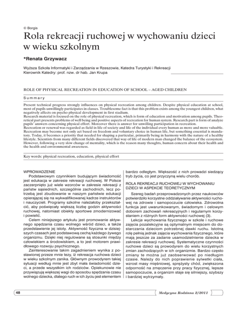 © Borgis Rola rekreacji ruchowej w wychowaniu dzieci w wieku szkolnym *Renata Grzywacz Wyższa Szkoła Informatyki i Zarządzania w Rzeszowie, Katedra Turystyki i Rekreacji Kierownik Katedry: prof. nzw. dr hab. Jan Krupa Role of physical recreation in education of school – aged children Summary Present technical progress strongly influences on physical recreation among children. Despite physical education at school, most of pupils unwillingly participates in classes. Troublesome fact is that this problem exists among the youngest children, what negatively affects on psycho physical development in first stadium. Research material is focused on the role of physical recreation, which is form of education and motivation among pupils. Theo retical part presents problems of well being and positive aspects of recreation for human system. Research part is form of analyze pupils’ answers concerning physical effort. Moreover there is answer for unwilling participation in recreation. Recreation or renewal was regarded as field in life of society and life of the individual every human as more and more valuable. Recreation may become not only act based on freedom and voluntary choice in human life, but something essential is manda tory. Today, it becomes a priority that needed for shaping a particular, primarily being in harmony with the nature of a healthy lifestyle. Scientists from many different fields discovered that way of life of modern man changed the balance of the ecosystem. However, following a very slow change of mentality, which is the reason many thoughts, human concern about their health and the health and environmental awareness. Key words: physical recreation, education, physical effort Wprowadzenie Podstawowym czynnikiem budującym świadomość jest edukacja w zakresie rekreacji ruchowej. W Polsce zaczerpnięto już wiele wzorców w zakresie rekreacji z państw sąsiednich, szczególnie zachodnich, lecz po trzebą jest zbudowanie w naszym państwie edukacji opierającej się na wykwalifikowanej kadrze instruktorów i nauczycieli. Programy szkolne należałoby przekształ cić, aby poświęcały większą liczbę godzin aktywności ruchowej, natomiast obiekty sportowe zmodernizować i powielić. Celem niniejszego artykułu jest promowanie aktyw nego spędzania czasu wolnego wśród dzieci, a także przedstawienie jej istoty. Aktywność fizyczna w dzisiej szych czasach jest podstawową cechą każdego żywego organizmu. Dzięki niej regulowane są stosunki między człowiekiem a środowiskiem, a to jest motorem prawi dłowego rozwoju psychicznego. Zainteresowanie takim zagadnieniem wynika z po stawionej przeze mnie tezy, iż rekreacja ruchowa dzieci w wieku szkolnym zanika. Głównym prowodyrem takiej sytuacji według mnie jest zbyt mała świadomość dzie ci, a przede wszystkim ich rodziców. Opiekunowie nie przywiązują większej wagi do sposobu spędzania czasu wolnego dziecka, dlatego ruch w ich życiu jest elementem 48 bardzo odległym. Większość z nich prowadzi siedzący tryb życia, co jest przyczyną wielu chorób. Rola rekreacji ruchowej w wychowaniu dzieci w aspekcie teoretycznym Szereg badań przeprowadzonych przez naukowców potwierdziło korzystne oddziaływanie aktywności rucho wej na zdrowie i samopoczucie człowieka. Zdrowotna funkcja jest uwarunkowanym, świadomym i celowym doborem zachowań rekreacyjnych i regularnym korzy staniem z różnych form aktywności ruchowej (3). Lekcje wychowania fizycznego w szkole i ruchowe zajęcia pozalekcyjne są optymalnym miejscem do do starczania dzieciom potrzebnej dawki ruchu. Istotną rolę pełnią jednak zajęcia wychowania fizycznego, które mają jeszcze za zadanie usamodzielnienie dziecka w zakresie rekreacji ruchowej. Systematyczne czynności ruchowe dzieci są prowodyrem do wielu korzystnych zmian zachodzących w ich organizmie. Bardzo często zmiany te możn a już zaobserwować po niedługim czasie. Należy do nich poprawienie sylwetki ciała, wzrost masy mięśniowej, sprężysty chód, zwiększona odporność na zmęczenie przy pracy fizycznej, lepsze samopoczucie, a organizm staje się silniejszy, szybszy i bardziej wytrzymały. Medycyna Rodzinna 2/2011 Rola rekreacji ruchowej w wychowaniu dzieci w wieku szkolnym Minimum aktywności ruchowej u dziecka badacze wy tyczają na 6 godzin zorganizowanego ruchu w tygodniu. Aktywność ruchowa dziecka jest niezbędna do prawi dłowego jego funkcjonowania, dlatego dziecko oprócz uczestnictwa w zajęciach wychowania fizycznego, odby wających się w szkole, powinno mieć możliwość udziału w takich czynnościach ze swoimi rówieśnikami poza szkołą. Największą potrzebę ruchową dzieci wykazują w wieku przedszkolnym i wczesnoszkolnym, jest ona ko nieczna do prawidłowego rozwoju umysłowego i fizycz nego dziecka. Dzieci w tym wieku wykazują nadmierną pobudliwość, dlatego też aktywność ruchowa powinna zmierzać do kształtowania ich zdolności manualnych koordynacji ruchowej, reakcji na sygnały akustyczne i optyczne. Niespełnienie minimalnej normy aktywności ruchowej przyczynia się do ograniczenia wszelakich procesów zachodzących w okresie rozwoju dziecka oraz może stać się czynnikiem hamującym rozwój świado mości i aktywności ruchowej w dalszych etapach życia. Zastosowanie się do wytycznych badaczy uchroni młode pokolenie przed całkowicie biernym spędzaniem czasu wolnego, będzie bodźcem do podejmowania niezbędnej aktywności ruchowej i stworzy u dziecka w świadomości podstawę korzyści wypływających z aktywnego spędza nia wolnego czasu i stanie się motorem do podejmowania tych czynności w dalszych etapach swojego życia. Mała aktywność fizyczna w dzisiejszych czasach jest dużym zagrożeniem dla zdrowia dzieci. Najczęstszą cho robą zanotowaną przez lekarzy jest zaburzenie ruchu, w tym wada postawy. Niestety inne wady również dają nie pokojący wizerunek obecnej sytuacji zdrowotnej dzieci, tzn. problem z kręgo