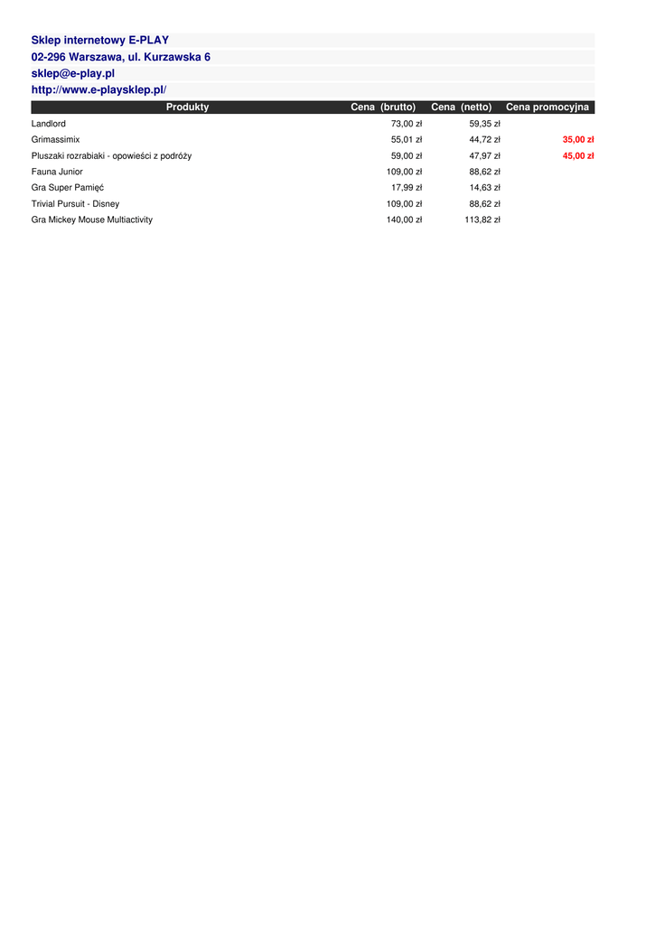 Sklep internetowy E-PLAY 02-296 Warszawa, ul. Kurzawska 6 sklep