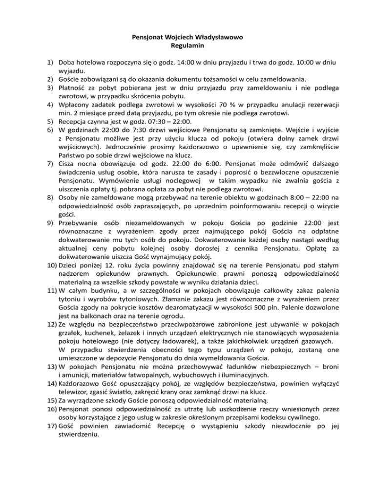 Pensjonat Wojciech Władysławowo Regulamin 1) Doba hotelowa rozpoczyna się o godz. 14:00 w dniu przyjazdu i trwa do godz. 10:00 w dniu wyjazdu. 2) Goście zobowiązani są do okazania dokumentu tożsamości w celu zameldowania. 3) Płatność za pobyt pobierana jest w dniu przyjazdu przy zameldowaniu i nie podlega zwrotowi, w przypadku skrócenia pobytu. 4) Wpłacony zadatek podlega zwrotowi w wysokości 70 % w przypadku anulacji rezerwacji min. 2 miesiące przed datą przyjazdu, po tym okresie nie podlega zwrotowi. 5) Recepcja czynna jest w godz. 07:30 – 22:00. 6) W godzinach 22:00 do 7:30 drzwi wejściowe Pensjonatu są zamknięte. Wejście i wyjście z Pensjonatu możliwe jest przy użyciu klucza od pokoju (otwiera dolny zamek drzwi wejściowych). Jednocześnie prosimy każdorazowo o upewnienie się, czy zamknęliście Państwo po sobie drzwi wejściowe na klucz. 7) Cisza nocna obowiązuje od godz. 22:00 do 6:00. Pensjonat może odmówić dalszego świadczenia usług osobie, która narusza te zasady i poprosić o bezzwłoczne opuszczenie Pensjonatu. Wymówienie usługi noclegowej w takim wypadku nie zwalnia gościa z uiszczenia opłaty tj. pobrana opłata za pobyt nie podlega zwrotowi. 8) Osoby nie zameldowane mogą przebywać na terenie obiektu w godzinach 8:00 – 22:00 na odpowiedzialność osób zapraszających, po uprzednim poinformowaniu recepcji o wizycie gości. 9) Przebywanie osób niezameldowanych w pokoju Gościa po godzinie 22:00 jest równoznaczne z wyrażeniem zgody przez najmującego pokój Gościa na odpłatne dokwaterowanie mu tych osób do pokoju. Dokwaterowanie każdej osoby nastąpi według aktualnej ceny pobytu kolejnej osoby dorosłej z cennika Pensjonatu. Opłatę za dokwaterowanie uiszcza Gość wynajmujący pokój. 10) Dzieci poniżej 12. roku życia powinny znajdować się na terenie Pensjonatu pod stałym nadzorem opiekunów prawnych. Opiekunowie prawni ponoszą odpowiedzialność materialną za wszelkie szkody powstałe w wyniku działania dzieci. 11) W całym budynku, a w szczególności w pokojach obowiązuje całkowity zakaz palenia tytoniu i wyrobów tytoniowych. Złamanie zakazu jest równoznaczne z wyrażeniem przez Gościa zgody na pokrycie kosztów dearomatyzacji w wysokości 500 pln. Palenie dozwolone jest na balkonach oraz na terenie ogrodu. 12) Ze względu na bezpieczeństwo przeciwpożarowe zabronione jest używanie w pokojach grzałek, kuchenek, żelazek i innych urządzeń elektrycznych nie stanowiących wyposażenia pokoju hotelowego (nie dotyczy ładowarek), a także jakichkolwiek urządzeń gazowych. W przypadku stwierdzenia obecności tego typu urządzeń w pokoju, zostaną one umieszczone w depozycie Pensjonatu do dnia wymeldowania Gościa. 13) W pokojach Pensjonatu nie można przechowywać ładunków niebezpiecznych – broni i amunicji, materiałów łatwopalnych, wybuchowych i iluminacyjnych. 14) Każdorazowo Gość opuszczający pokój, ze względów bezpieczeństwa, powinien wyłączyć telewizor, zgasić światło, zakręcić krany oraz zamknąć drzwi na klucz. 15) Za wyrządzone szkody Goście ponoszą odpowiedzialność materialną. 16) Pensjonat ponosi odpowiedzialność za utratę lub uszkodzenie rzeczy wniesionych przez osoby korzystające z jego usług w zakresie określonym przepisami kodeksu cywilnego. 17) Gość powinien zawiadomić Recepcję o wystąpieniu szkody niezwłocznie po jej stwierdzeniu. 18) Pensjonat odpowiada z tytułu utraty lub uszkodzenia pieniędzy, papierów wartościowych, kosztowności albo przedmiotów mających wartość naukową lub artystyczną wyłącznie, jeśli przedmioty te zostały oddane na przechowanie do depozytu Pensjonatu. 19) Pensjonat zastrzega sobie prawo do odmowy przyjęcia do depozytu Pensjonatu przedmiotów o dużej wartości, znacznych kwot pieniężnych, przedmiotów zagrażających bezpieczeństwu oraz przedmiotów wielkogabarytowych, których nie można umieścić w depozycie 20) Pensjonat świadczy usługi zgodnie ze swoją kategorią (*) i standardem. 21) W przypadku zastrzeżeń dotyczących, jakości usług Gość jest proszony o niezwłoczne ich zgłaszanie do Recepcji, co umożliwi pracownikom poprawę standardu świadczonych usług. 22) Pensjonat ma obowiązek zapewnić Gościom: – warunki do pełnego i nieskrępowanego wypoczynku, – bezpieczeństwo pobytu, w tym bezpieczeństwo zachowania w tajemnicy informacji o Gościu, – profesjonalną i uprzejmą obsługę w zakresie wszystkich usług świadczonych w Pensjonacie. 23) Pensjonat nie akceptuje obecności zwierząt na terenie obiektu. 24) Za zgubienie kluczy pobierana jest opłata 100 zł. 25) Pensjonat może odmówić kontynuacji świadczenia usługi dla gościa, który podczas pobytu rażąco naruszył regulamin Pensjonatu wyrządzając szkodę w mieniu hotelowym lub gości, albo szkodę na osobie gości, pracowników Pensjonatu albo innych osób przebywających w Pensjonacie, albo też w inny sposób zakłócił pobyt gości lub funkcjonowanie Pensjonatu. 26) Korzystanie z usług Pensjonatu Wojciech stanowi akceptację niniejszego regulaminu.