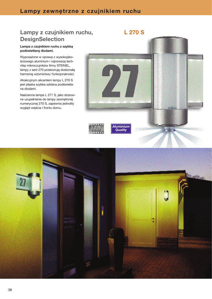 Lampy zewnętrzne z czujnikiem ruchu Lampy z czujnikiem ruchu, DesignSelection L 270 S Lampa z czujnikiem ruchu z szybką podświetlaną diodami. Wyposażone w oprawę z wysokojakościowego aluminium i najnowszą technikę mikroczujników firmy STEINEL, lampy z serii 270 przekonują doskonałą harmonią wzornictwa i funkcjonalności. Atrakcyjnym akcentem lampy L 270 S jest płaska szybka szklana podświetlana diodami. Naścienna lampa L 271 S, jako stosowne uzupełnienie do lampy zewnętrznej numerycznej 270 S, zapewnia jednolity wygląd wejścia i frontu domu. Aluminium Quality 38 Lampy zewnętrzne numeryczne z czujnikiem ruchu L 271 S Opis działania Numer domu podświetlany diodami o zmierzchu i w nocy (L 270 S). Bardzo wysoka trwałość diod świecących Niskie zużycie energii diod świecących Aby uzyskać równomierne oświetlenie klosza szklanego, te lampy z czujnikiem są wyposażone w dwie żarówki halogenowe G9. Cztery praktyczne programy działania z funkcją łagodnego włączania światła i regulacja jasności podstawowej w zakresie 25% (Watt-o-matic) pozwalają spełnić wszelkie życzenia. Światło stałe (4h) włączane wyłącznikiem sieciowym. Możliwości regulacji Możliwość ograniczenia obszaru wykrywania za pomocą dołączonych przesłon. Proste i wygodne ustawianie czasu świecenia, progu czułości zmierzchowej i wybór programu na wyjmowanym module czujnika. Aluminium Quality L 270 S L 271 S aluminium aluminium EAN 4007841... 647810 647919 Wymiary (wys. x szer. x gł.) 270 x 328 x 141 mm 270 x 100 x 141 mm Moc / żarówka max 2 x 40 W / G9 szybka podświetlana diodą LED, ok. 1 W Zasilanie sieciowe 230 – 240 V, 50 Hz Kąt wykrywania 360° z zabezpieczeniem przed podpełzaniem Zasięg czujnika 8 m dookoła Ustawianie progu czułości zmierzchowej 2 – 2000 luksów Ustawianie czasu 5 s – 15 min Regulacja jasności 0 % lub 25% (Watt-o-matic) Światło stałe 4 godz., przełączalne Stopień ochrony IP 44 Klasa ochronności I Zalety montażowe Podświetlana szybka zakładana z lewej lub prawej strony w zależności od montażu po prawej lub lewej stronie drzwi (L 270 S). Samoprzylepne cyfry w komplecie (L 270 S). Seria 270 Najważniejsze cechy w skrócie Kąt wykrywania 360° Idealna kontrola z ochroną przed podpełzaniem Zmniejszenie kąta wykrywania czujnika Ustawianie funkcji Łagodne Światło stałe zapalanie światła 2 x wyłączyć i włączyć 39