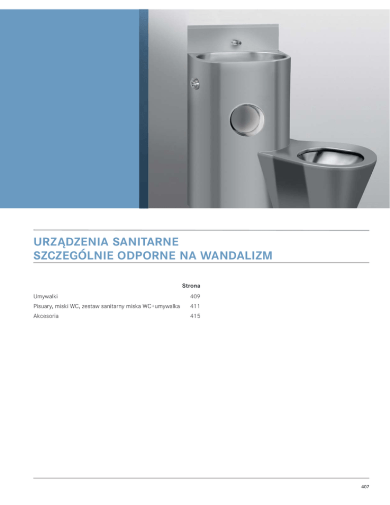URZĄDZENIA SANITARNE SZCZEGÓLNIE ODPORNE NA WANDALIZM Strona Umywalki 409 Pisuary, miski WC, zestaw sanitarny miska WC+umywalka 411 Akcesoria 415 407 Urządzenia sanitarne szczególnie odporne na wandalizm Umywalki HEAVY DUTY Opis Umywalka pojedyncza do montażu na ścianie. Stal szlachetna, powierzchnia jedwabisty mat, grubość materiału 1,2 mm. Trzy gwintowane pręty do wandaloodpor– nego montażu umywalki od strony korytarza technologicznego. Wspawana bezspoinowo komora. Bez przelewu. Półka na armaturę głębokości 40 mm. Ukryty syfon DN 32. Odpływ sitkowy DN 40. Wytłoczone wgłębienie na mydło. W komplecie: zestaw montażowy. Wymiary (szer. × wys. × głęb.): 450 × 280 × 400 mm Wymiary niecki (szer. × głęb.): 360 × 270 mm Typ Numer katalogowy HDTX450 7612210016790 Wersja z płytą montażową do montażu od strony pomieszczenia użytkowego ANMX450 7612210019623 Stan: 01.11 409 Urządzenia sanitarne szczególnie odporne na wandalizm Umywalki HEAVY DUTY Opis Umywalka pojedyncza do montażu na ścianie. Stal szlachetna, powierzchnia matowa szlifowana, grubość materiału 1,2 mm. Bez półki na armaturę. Gwintowane pręty do wandaloodpornego montażu umywalki od strony korytarza technologicznego. Zamknięta ze wszystkich stron obudowa ze wspawaną bezspoinowo, okrągłą komorą. Wspawany bezspoinowo odpływ sitkowy z rurą odpływową DN 32. Montowany od strony korytarza technologicznego syfon (zakupić dodatkowo). W komplecie: zestaw montażowy. Wymiary (szer. × wys. × głęb.): 500 × 160 × 425 mm Typ Numer katalogowy HDTX455 7612210059490 Wskazówka Umywalka dostosowana do potrzeb użytkowników wózków inwalidzkich. Opis Umywalka pojedyncza do montażu na ścianie. Stal szlachetna, powierzchnia jedwabisty mat, grubość materiału 1,2 mm. Umywalka bezspoinowa tłoczona z jednego arkusza blachy. Zaokrąglone krawędzie, wandaloodporna. Odpływ sitkowy 1 ¼˝. Syfon DN 40/50. Bez przelewu. Mocowanie od przodu (od strony pomieszczenia użytkowego). W komplecie: zestaw montażowy. Wymiary (szer. × wys. × głęb.): 460 × 170 × 490 mm Wymiary niecki (szer. × głęb.): 420 × 360 mm Typ Numer katalogowy ANMX460 ANMX461 7612982005206 bez otworu na armaturę 7612982005190 z otworem na armaturę Wersja bez półki na armaturę. Wymiary (szer. × wys. × głęb.): 460 × 170 × 410 mm ANMX462 7612982080647 Wskazówka Umywalka dostosowana do potrzeb użytkowników wózków inwalidzkich. 410 Stan: 01.11 Urządzenia sanitarne szczególnie odporne na wandalizm Pisuary HEAVY DUTY Opis Pisuar ścienny Muszla ze stali szlachetnej, powierzchnie wewnętrzne i zewnętrzne jedwabisty mat, grubość materiału 1,2 mm. Owalny kształt muszli. Głowica spłukująca ½˝ ze stali szlachetnej. Obudowa całkowicie zamknięta. Odpływ poziomy tylny. Gwintowane pręty do wandaloodpornego montażu od strony korytarza technologicznego. W komplecie: armatura spłukująca składająca się z czujnika pierścieniowego, zaworu elektromagnetycznego i akcesoriów, zestaw montażowy, rura odpływowa 90° i odpływ sitkowy. Wymiary (szer. × wys. × głęb.): 313 × 733 × 341 mm Typ Numer katalogowy HDTX538RS 7612982104701 Wersja z listwą montażową i zakrytymi elementami mocującymi do montażu od strony pomieszczenia użytkowego CMPX538RS 7612982106798 Dane techniczne Wymagane ciśnienie robocze: Normatywny wypływ wody: Natężenie strumienia spłukującego: Objętość strumienia spłukującego: Napięcie zasilania: Pobór mocy: Stopień ochrony: Stan: 01.11 1,0 bar 0,3 l/s 0,3 − 0,7 l/s 2 − 4 l regulowana 24 V DC 7W elektronika IP 68, zawór elektromagnetyczny IP 40 411 Urządzenia sanitarne szczególnie odporne na wandalizm Pisuary HEAVY DUTY Opis Pisuar ścienny ze stali szlachetnej, powierzchnia jedwabisty mat, grubość materiału 1,2 mm. Owalny kształt pisuaru i muszli. Głowica spłukująca ½˝ ze stali szlachetnej. Odpływ poziomy tylny. Gwintowane pręty do wandaloodpornego montażu od strony korytarza technologicznego. W komplecie: zestaw montażowy, syfon DN 40 oraz odpływ sitkowy. Wymiary (szer. × wys. × głęb.): 380 × 600 × 350 mm Typ Numer katalogowy HDTX532 7612979000337 Wersja z listwą montażową i zakrytymi elementami mocującymi do montażu od strony pomieszczenia użytkowego CMPX532 7612210016721 412 Stan: 01.11 Urządzenia sanitarne szczególnie odporne na wandalizm Miski WC HEAVY DUTY Opis Lejowa, wisząca miska ustępowa ze stali szlachetnej, powierzchnia jedwabisty mat, grubość materiału 1,6 mm. Wandaloodporna – maskowane mocowanie za pomocą gwinto– wanych prętów, podłączenie i serwisowanie od strony korytarza technologicznego. Sposób spłukiwania certyfikowany według EN 997. Przystosowana do spłuczek o pojemności min. 4 l wody. Odpływ poziomy tylny z syfonem DN 100 ze stali szlachetnej. Siedzisko zaokrąglone ze wszystkich stron, z opadającym ku otworowi wytłoczeniem. Wymiary (szer. × wys. × głęb.): 360 × 351 × 500 mm Typ Numer katalogowy HDTX592 7612979002089 Wersja z płytą montażową i śrubami antykradzieżowymi do montażu od strony pomieszczenia użytkowego CMPX592 7612979002171 Opis Lejowa, wisząca miska ustępowa dla osób niepełnosprawnych ze stali szlachetnej, powierzchnia jedwabisty mat, grubość materiału 1,6 mm. Wandaloodporna – maskowane mocowanie za pomocą gwinto– wanych prętów, podłączenie i serwisowanie od strony korytarza technologicznego. Sposób spłukiwania certyfikowany według EN 997. Przystosowana do płuczek o pojemności min. 4 l wody. Odpływ poziomy tylny z syfonem DN 100 ze stali szlachetnej. Siedzisko zaokrąglone ze wszystkich stron, z opadającym ku otworowi wytłoczeniem. Wymiary (szer. × wys. × głęb.): 360 × 351 × 700 mm Typ Numer katalogowy HDTX594 7612979002324 Wersja z płytą montażową i śrubami antykradzieżowymi do montażu od strony pomieszczenia użytkowego CMPX594 7612979002225 Stan: 01.11 413 Urządzenia sanitarne szczególnie odporne na wandalizm Miski 
