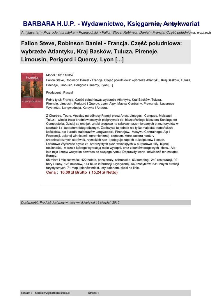 Utworzono Antykwariat : 02 marzec 2017 BARBARA H.U.P. - Wydawnictwo, Księgarnia, Antykwariat > Przyroda i turystyka > Przewodniki > Fallon Steve, Robinson Daniel - Francja. Część południowa: wybrzeże Fallon Steve, Robinson Daniel - Francja. Część południowa: wybrzeże Atlantyku, Kraj Basków, Tuluza, Pireneje, Limousin, Perigord i Quercy, Lyon [...] Model : 131115357 Fallon Steve, Robinson Daniel - Francja. Część południowa: wybrzeże Atlantyku, Kraj Basków, Tuluza, Pireneje, Limousin, Perigord i Quercy, Lyon [...] Producent : Pascal Pełny tytuł: Francja. Część południowa: wybrzeże Atlantyku, Kraj Basków, Tuluza, Pireneje, Limousin, Perigord i Quercy, Lyon, Alpy, Masyw Centralny, Prowansja, Lazurowe Wybrzeże, Langwedocja, Korsyka i Andora. Z Chartres, Tours, Vezelay na północy Francji przez Arles, Limoges, Conques, Moissac i Tuluz� wiodła trasa średniowiecznych pielgrzymek do hiszpańskiego klasztoru Santiago de Compostella. Dzisiaj są one jak znaki drogowe na szlakach przemierzanych przez turystów w szortach i z aparatem fotograficznym. Zachwyca tu jednak nie tylko majestat romańskich kościołów, ale i uroda krajobrazów Langwedocji, Pirenejów, Masywu Centralnego, Alp i Prowansji, usianej winnicami i opromienionej słońcem, które zaciera kontury średniowiecznych starówek, rzymskich ruin i potęguje zapach eukaliptusów i sosen. Lazurowe Wybrzeże słynie ze srebrzystych plaż, wciśniętych w purpurowe klify, bujnej roślinności, morza z którego wyrastają małe wysepki, oraz z korków drogowych i tłoku. Ale lato mija i znów wszystko powraca do swojego rytmu. Doprawdy warto odwiedzić ten zakątek Europy. 68 miast i miejscowości, 422 hotele, pensjonaty, schroniska, 63 kempingi, 249 restauracji, 92 bary i kluby, 128 muzeów, 144 biura informacji turystycznej, 560 zabytków, 531 innych atrakcji turystycznych, 71 map i planów miast, loty balonem, skoki na linie. Cena : 16,00 zł Brutto ( 15,24 zł Netto) Dostępność: Produkt dostępny w naszym sklepie od 18 sierpień 2015 kontakt : - [email protected] Strona 1