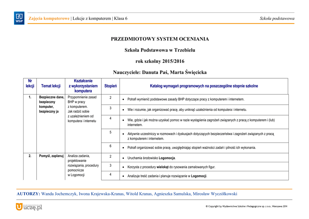 Zajęcia komputerowe | Lekcje z komputerem | Klasa 6 Szkoła podstawowa PRZEDMIOTOWY SYSTEM OCENIANIA Szkoła Podstawowa w Trzebielu rok szkolny 2015/2016 Nauczyciele: Danuta Paś, Marta Święcicka Nr lekcji 1. 2. Temat lekcji Bezpieczne dane, bezpieczny komputer, bezpieczny ja Pomyśl, zaplanuj Kształcenie z wykorzystaniem komputera Przypomnienie zasad BHP w pracy z komputerem. Jak radzić sobie z uzależnieniem od komputera i internetu Analiza zadania, projektowanie rozwiązania, procedury pomocnicze w Logomocji Stopień Katalog wymagań programowych na poszczególne stopnie szkolne 2 Potrafi wymienić podstawowe zasady BHP dotyczące pracy z komputerem i internetem. 3 Wie i rozumie, jak organizować pracę, aby uniknąć uzależnienia od komputera i internetu. 4 Wie, gdzie i jak można uzyskać pomoc w razie wystąpienia zagrożeń związanych z pracą z komputerem i (lub) internetem. 5 Aktywnie uczestniczy w rozmowach i dyskusjach dotyczących bezpieczeństwa i zagrożeń związanych z pracą z komputerem i internetem. 6 Potrafi organizować sobie pracę, uwzględniając stopień ważności zadań i pilność ich wykonania. 2 Uruchamia środowisko Logomocja. 3 Korzysta z procedury wielokąt do rysowania zamalowanych figur. 4 Analizuje treść zadania i planuje rozwiązanie w Logomocji. AUTORZY: Wanda Jochemczyk, Iwona Krajewska-Kranas, Witold Kranas, Agnieszka Samulska, Mirosław Wyczółkowski Zajęcia komputerowe | Lekcje z komputerem | Klasa 6 Nr lekcji Temat lekcji Kształcenie z wykorzystaniem komputera Stopień Szkoła podstawowa Katalog wymagań programowych na poszczególne stopnie szkolne 5 Pisze procedury pomocnicze i korzysta z nich podczas rozwiązywania zadania. 6 Bezbłędnie wykonuje ćwiczenia na lekcji, trzeba mu zadawać dodatkowe, trudniejsze zadania, np. z konkursów informatycznych miniLOGIA i Grafika z żółwiem. Jest aktywny na lekcji i pomaga innym uczniom. 3. Jedzie pociąg z daleka Skalowanie rysunku w Logomocji 2 Uruchamia środowisko Logomocja. 3 Potrafi napisać procedurę, w której są wywoływane procedury pomocnicze. 4 Wyjaśnia, na czym polega skalowanie rysunku. 5 Potrafi napisać procedurę główną, tak aby rysunek był prawidłowo skalowany, według założeń podanych w treści zadania. 6 Bezbłędnie wykonuje ćwiczenia na lekcji, trzeba mu zadawać dodatkowe, trudniejsze zadania, np. z konkursów informatycznych miniLOGIA i Grafika z żółwiem. Jest aktywny na lekcji i pomaga innym uczniom. 4. Wirujące wiatraki Wykorzystanie kodu rysunku do tworzenia postaci żółwia w Logomocji 2 Uruchamia środowisko Logomocja. 3 Potraf korzystać z przycisku do uruchamiania animacji. 4 Korzysta z kodu rysunku do tworzenia postaci żółwia. AUTORZY: Wanda Jochemczyk, Iwona Krajewska-Kranas, Witold Kranas, Agnieszka Samulska, Mirosław Wyczółkowski Zajęcia komputerowe | Lekcje z komputerem | Klasa 6 Nr lekcji Temat lekcji Kształcenie z wykorzystaniem komputera Stopień Szkoła podstawowa Katalog wymagań programowych na poszczególne stopnie szkolne 5 Korzysta z żółwi mających postać kodu rysunku do tworzenia animacji. 6 Bezbłędnie wykonuje ćwiczenia na lekcji, trzeba mu zadawać dodatkowe, trudniejsze zadania, np. z konkursów informatycznych miniLOGIA i Grafika z żółwiem. Jest aktywny na lekcji i pomaga innym uczniom. 5. 6. Liczby z kresek Kreski z liczb Zamiana kodu paskowego na liczby Zamiana liczb na kod paskowy, wprowadzenie do dwójkowego systemu liczbowego 2 Opisuje zasadę odczytywania kodu kreskowego. 3 Potrafi odczytywać proste kody zero-jedynkowe, czyli zamieniać je na liczby. 4 Potrafi opisywać zasadę odczytywania kodu kreskowego. 5 Samodzielnie wykonuje zadania. 6 Wyjaśnia innym uczniom sposób wykonywania zamiany kodu paskowego na liczby. 2 Opisuje zasadę tworzenia kodu kreskowego. 3 Zamienia liczby w zakresie od 0 do 255 na kod zero-jedynkowy. 4 Opisuje zasadę tworzenia kodu kreskowego i zamienia liczby w zakresie od 0 do 255 na kod zero-jedynkowy. 5 Samodzielnie wykonuje zadania. 6 Odkodowuje zakodowane wyrazy i wyjaśnia innym uczniom sposób ich odkodowania. AUTORZY: Wanda Jochemczyk, Iwona Krajewska-Kranas, Witold Kranas, Agnieszka Samulska, Mirosław Wyczółkowski Zajęcia komputerowe | Lekcje z komputerem | Klasa 6 Nr lekcji Temat lekcji 7. Obrazy z ekranu Kształcenie z wykorzystaniem komputera Tworzenie instrukcji ilustrowanej zrzutami ekranu Stopień 2 Szkoła podstawowa Katalog wymagań programowych na poszczególne stopnie szkolne Uruchamia edytor tekstu. Tworzy dokument zawierający tekst. 3 Korzysta w podstawowym zakresie z programu Microsoft Word lub innego zaawansowanego edytora tekstu. Przygotowuje zrzut ekranu. 4 Zaznacza wybrane fragmenty zrzutu ekranu i wkleja je do edytora tekstu. Dba o prawidłowe ułożenie obiektów na stronie. Samodzielnie wykonuje zadania i ćwiczenia. 5 Dba o estetykę wprowadzonego tekstu oraz wygląd elementów graficznych. Tworzy bezbłędną pracę, zgodnie z jej specyfikacją. 6 Bezbłędnie wykonuje ćwiczenia na lekcji, trzeba mu zadawać dodatkowe, trudniejsze zadania. Jest aktywny na lekcji i pomaga innym uczniom. 8. Multimedialna instrukcja Tworzenie filmu wideo z prezentacji multimedialnej 2 Z pomocą nauczyciela uruchamia program do tworzenia prezentacji. Pod kierunkiem nauczyciela tworzy prezentację zbudowaną z jednego slajdu. 3 Korzysta w podstawowym zakresie z programu Microsoft PowerPoint lub innego programu do tworzenia prezentacji. Tworzy prezentację zawierającą zrzuty ekranu. 4 Dodaje do slajdów własną narrację. Samodzielnie wykonuje zadania i ćwiczenia. AUTORZY: Wanda Jochemczyk, Iwona Krajewska-Kranas, Witold Kranas, Agnieszka Samulska, Mirosław Wyczółkowski Zajęcia komputerowe | Lekcje z komputerem | Klasa 6 Nr lekcji Temat lekcji Kształcenie z wykorzystaniem komputera Stopień 5 Szkoła podstawowa Katalog wymagań programowych na poszczególne stopnie szkolne Tworzy film z prezentacji. Dba o estetykę przygotowanej prezentacji. 6 Bez