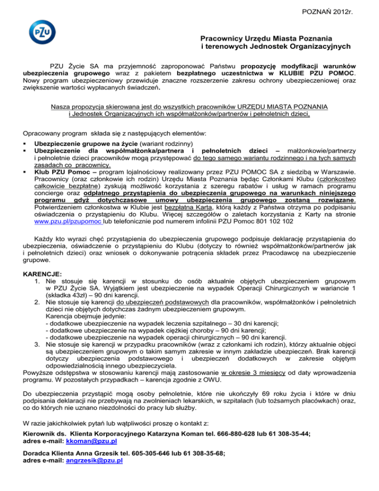 POZNAŃ 2012r. Pracownicy Urzędu Miasta Poznania i terenowych Jednostek Organizacyjnych PZU Życie SA ma przyjemność zaproponować Państwu propozycję modyfikacji warunków ubezpieczenia grupowego wraz z pakietem bezpłatnego uczestnictwa w KLUBIE PZU POMOC. Nowy program ubezpieczeniowy przewiduje znaczne rozszerzenie zakresu ochrony ubezpieczeniowej oraz zwiększenie wartości wypłacanych świadczeń. Nasza propozycja skierowana jest do wszystkich pracowników URZĘDU MIASTA POZNANIA i Jednostek Organizacyjnych ich współmałżonków/partnerów i pełnoletnich dzieci, Opracowany program składa się z następujących elementów: Ubezpieczenie grupowe na życie (wariant rodzinny) Ubezpieczenie dla współmałżonka/partnera i pełnoletnich dzieci – małżonkowie/partnerzy i pełnoletnie dzieci pracowników mogą przystępować do tego samego wariantu rodzinnego i na tych samych zasadach co pracownicy. Klub PZU Pomoc – program lojalnościowy realizowany przez PZU POMOC SA z siedzibą w Warszawie. Pracownicy (oraz członkowie ich rodzin) Urzędu Miasta Poznania będąc Członkami Klubu (członkostwo całkowicie bezpłatne) zyskują możliwość korzystania z szeregu rabatów i usług w ramach programu concierge oraz odpłatnego przystąpienia do ubezpieczenia grupowego na warunkach niniejszego programu gdyż dotychczasowe umowy ubezpieczenia grupowego zostaną rozwiązane. Potwierdzeniem członkostwa w Klubie jest bezpłatna Karta, którą każdy z Państwa otrzyma po podpisaniu oświadczenia o przystąpieniu do Klubu. Więcej szczegółów o zaletach korzystania z Karty na stronie www.pzu.pl/pzupomoc lub telefonicznie pod numerem infolinii PZU Pomoc 801 102 102 Każdy kto wyrazi chęć przystąpienia do ubezpieczenia grupowego podpisuje deklarację przystąpienia do ubezpieczenia, oświadczenie o przystąpieniu do Klubu (dotyczy to również współmałżonków/partnerów jak i pełnoletnich dzieci) oraz wniosek o dokonywanie potrącenia składek przez Pracodawcę na ubezpieczenie grupowe. KARENCJE: 1. Nie stosuje się karencji w stosunku do osób aktualnie objętych ubezpieczeniem grupowym w PZU Życie SA. Wyjątkiem jest ubezpieczenie na wypadek Operacji Chirurgicznych w wariancie 1 (składka 43zł) – 90 dni karencji. 2. Nie stosuje się karencji do ubezpieczeń podstawowych dla pracowników, współmałżonków i pełnoletnich dzieci nie objętych dotychczas żadnym ubezpieczeniem grupowym. Karencja obejmuje jedynie: - dodatkowe ubezpieczenie na wypadek leczenia szpitalnego – 30 dni karencji; - dodatkowe ubezpieczenie na wypadek ciężkiej choroby – 90 dni karencji; - dodatkowe ubezpieczenie na wypadek operacji chirurgicznych – 90 dni karencji. 3. Nie stosuje się karencji w przypadku pracowników (wraz z członkami ich rodzin), którzy aktualnie objęci są ubezpieczeniem grupowym o takim samym zakresie w innym zakładzie ubezpieczeń. Brak karencji dotyczy ubezpieczenia podstawowego i ubezpieczeń dodatkowych w zakresie objętym odpowiedzialnością innego ubezpieczyciela. Powyższe odstępstwa w stosowaniu karencji mają zastosowanie w okresie 3 miesięcy od daty wprowadzenia programu. W pozostałych przypadkach – karencja zgodnie z OWU. Do ubezpieczenia przystąpić mogą osoby pełnoletnie, które nie ukończyły 69 roku życia i które w dniu podpisania deklaracji nie przebywają na zwolnieniach lekarskich, w szpitalach (lub tożsamych placówkach) oraz, co do których nie uznano niezdolności do pracy lub służby. W razie jakichkolwiek pytań lub wątpliwości proszę o kontakt z: Kierownik ds. Klienta Korporacyjnego Katarzyna Koman tel. 666-880-628 lub 61 308-35-44; adres e-mail: [email protected] Doradca Klienta Anna Grzesik tel. 605-305-646 lub 61 308-35-68; adres e-mail: [email protected]