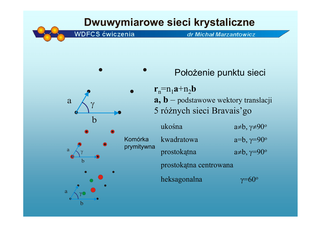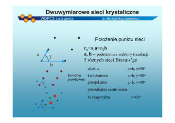 Dwuwymiarowe sieci krystaliczne Położenie punktu sieci a γ b a γ b rn=n1a+n2b a, b – podstawowe wektory translacji 5 różnych sieci Bravais’go Komórka prymitywna ukośna a≠b, γ≠90o kwadratowa a=b, γ=90o prostokątna a≠b, γ=90o prostokątna centrowana heksagonalna a γ b γ=60o Wskaźniki Millera (hkl) m=1 n=3 o=2 n o m 1/ 1 1/3 1/2 h=6 k=2 l=3 Teoria dyfrakcji. Sieć odwrotna Amplituda i faza fali fali kulistej względem fali padającej opisane są czynnikiem rozpraszania ρ(r) Natężenie fali rozproszonej w kierunku K: I (K ) ∝ ∫ ρ ( r )e −iK ⋅r 2 dr K=k-k0 Dla struktur periodycznych ρ(r) można rozwinąć w szereg Fouriera. ρ (r ) = ∑ ρ G e iG⋅r G G=hg1+kg2+lg3 G·rn=2πm Dyfrakcja na sieci periodycznej. Warunek Lauego a 2 × a3 g1 = 2π a1 ⋅ (a 2 × a3 ) g2 a2 g1 giaj=2πσij a1 2 A0 I (K ) ∝ R′2 ∑ρ ∫e 2 i ( G − K )⋅ r G G całka ≠0 kiedy G=K (warunek Lauego) Ghkl 2π = d hkl dr (020) (010) (000) G k k0 (10) (20) (30) Dyfrakcja na sieci krystalicznej -warunek Bragga nλ=2dsinθ Geometria pomiaru dyfrakcyjnego Czynnik atomowy i strukturalny czynnik atomowy 2 A0 ∝ I (K ) R′2 ∑ρ ∫e 2 i ( G − K )⋅r G dr z f(∆k) G I(∆k)∝|f(∆k)|2 ( 2 2 f (∆k ) = Z exp − 1 ∆k ra 2 ) ∆k 1/ra czynnik strukturalny I ( ∆k ) ∝ S (∆k ) = f A ( ∆k )e 2 I (∆k ) ∝ S (∆k ) = f A e 2 i ∆k ⋅ R A 2πi ( hA1 + kA2 ) + f B ( ∆k ) e + f Be i ∆k ⋅ R B ) 2 2πi ( hB1 + kB2 ) 2 Materiały Simulations for solid state physics • • R.H. Silsbee, J. Dräger Cambridge University Press 1997 www.physics.cornell.edu/sss/ Powder Cell www.chemistry.wustl.edu/~courses/spring_06/ch_465/pcw23.exe www.ccp14.ac.uk/ccp/web-mirrors/powdcell/a_v/v_1/powder/e_cell.html Komórka elementarna - diament
