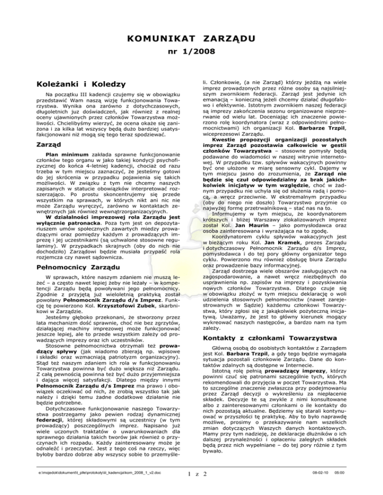 KOMUNIKAT ZARZĄDU nr 1/2008 Koleżanki i Koledzy Na początku III kadencji czujemy się w obowiązku przedstawić Wam naszą wizję funkcjonowania Towarzystwa. Wynika ona zarówno z dotychczasowych, długoletnich juz doświadczeń, jak również z realnej oceny ujawnionych przez członków Towarzystwa możliwości. Chcielibyśmy wierzyć, że ocena okaże się zaniżona i za kilka lat wszyscy będą dużo bardziej usatysfakcjonowani niż mogą się tego teraz spodziewać. Zarząd Plan minimum zakłada sprawne funkcjonowanie członków tego organu w jako takiej kondycji psychofizycznej do końca 4-letniej kadencji, chociaż od razu trzeba w tym miejscu zaznaczyć, że jesteśmy gotowi do jej skrócenia w przypadku pojawienia się takich możliwości. W związku z tym nie chcemy naszych zapisanych w statucie obowiązków interpretować rozszerzająco. Po prostu skoncentrujemy się przede wszystkim na sprawach, w których nikt ani nic nie może Zarządu wyręczyć, zarówno w kontaktach zewnętrznych jak również wewnątrzorganizacyjnych. W działalności imprezowej rola Zarządu jest wyłącznie patronacka. Poza tym jest on depozytariuszem umów społecznych zawartych miedzy prowadzącymi oraz pomiędzy każdym z prowadzących imprezę i jej uczestnikami (są uchwalone stosowne regulaminy). W przypadkach skrajnych (oby do nich nie dochodziło) Zarządowi będzie musiała przypaść rola rozjemcza czy nawet sądownicza. Pełnomocnicy Zarządu W sprawach, które naszym zdaniem nie muszą leżeć – a często nawet lepiej żeby nie leżały – w kompetencji Zarządu będą powoływani jego pełnomocnicy. Zgodnie z przyjętą już wieloletnią praktyką został powołany Pełnomocnik Zarządu d/s Imprez. Funkcję tę powierzono Kol. Krzysztofowi Zubek, skarbnikowi w Zarządzie. Jesteśmy głęboko przekonani, że stworzony przez lata mechanizm dość sprawnie, choć nie bez zgrzytów, działającej machiny imprezowej może funkcjonować jeszcze lepiej, ale to przede wszystkim zależy od prowadzących imprezy oraz ich uczestników. Stosowne pełnomocnictwa otrzymali też prowadzący spływy (jak wiadomo zbierają np. wpisowe i składki oraz wzmacniają patriotyzm organizacyjny). Stąd też naszym zdaniem ich rola w funkcjonowaniu Towarzystwa powinna być dużo większa niż Zarządu. Z całą pewnością powinna też być dużo przyjemniejsza i dająca więcej satysfakcji. Dlatego między innymi Pełnomocnik Zarządu d/s Imprez ma prawo i obowiązek oczekiwać od nich, że zrobią wszystko tak jak należy i dzięki temu żadne dodatkowe działanie nie będzie potrzebne. Dotychczasowe funkcjonowanie naszego Towarzystwa postrzegamy jako pewien rodzaj dynamicznej federacji, której składowymi są uczestnicy (w tym prowadzący) poszczególnych imprez. Napisano już wiele uczonych traktatów o uwarunkowaniach dla sprawnego działania takich tworów jak również o przyczynach ich rozpadu. Każdy zainteresowany może je odnaleźć i przeczytać. Jest z tego coś na rzeczy, więc byłoby bardzo dobrze aby wszyscy sobie to przemyśle- e:\mojedok\dokument\t_plłe\protokoły\iii_kadencja\kom_2008_1_v2.doc li. Członkowie, (a nie Zarząd) którzy jeżdżą na wiele imprez prowadzonych przez różne osoby są najsilniejszym zwornikiem federacji. Zarząd jest jedynie ich emanacją – konieczną jeżeli chcemy działać długofalowo i efektywnie. Istotnym zwornikiem naszej federacji są imprezy zakończenia sezonu organizowane nieprzerwanie od wielu lat. Doceniając ich znaczenie powierzono rolę koordynatora (wraz z odpowiednimi pełnomocnictwami) ich organizacji Kol. Barbarze Trzpil, wiceprezesowi Zarządu. Kwestie propozycji organizacji pozostałych imprez Zarząd pozostawia całkowicie w gestii członków Towarzystwa – stosowne pomysły będą podawane do wiadomości w naszej witrynie internetowej. W przypadku tzw. spływów wakacyjnych powinny być one ułożone w miarę sensowny cykl. Dajemy w tym miejscu jasno do zrozumienia, że Zarząd nie będzie się czuł odpowiedzialny za brak jakichkolwiek inicjatyw w tym względzie, choć w żadnym przypadku nie uchyla się od służenia radą i pomocą, a wręcz przeciwnie. W ekstremalnym przypadku (oby do niego nie doszło) Towarzystwo przyjmie co najwyżej formę przetrwalnikową – stać nas na to. Informujemy w tym miejscu, że koordynatorem krótszych i bliżej Warszawy zlokalizowanych imprez został Kol. Jan Maurin – jako pomysłodawca oraz osoba zainteresowana i wyrażająca na to zgodę. Koordynatorem cyklu spływów wakacyjnych jest w bieżącym roku Kol. Jan Kramek, prezes Zarządu i dotychczasowy Pełnomocnik Zarządu d/s Imprez, pomysłodawca i do tej pory główny organizator tego cyklu. Powierzono mu również obsługę biura Zarządu oraz prowadzenie bazy informacyjnej. Zarząd dostrzega wiele obszarów zasługujących na zagospodarowanie, a nawet wręcz niezbędnych do usprawnienia np. zapisów na imprezy i pozyskiwania nowych członków Towarzystwa. Dlatego czuje się w obowiązku złożyć w tym miejscu deklarację o woli udzielenia stosownych pełnomocnictw (nawet zarejestrowanych w Sądzie) każdemu członkowi Towarzystwa, który zgłosi się z jakąkolwiek pożyteczną inicjatywą. Uważamy, że jest to główny kierunek mogący wykreować naszych następców, a bardzo nam na tym zależy. Kontakty z członkami Towarzystwa Główną osobą do osobistych kontaktów z Zarządem jest Kol. Barbara Trzpil, a gdy tego będzie wymagała sytuacja pozostali członkowie Zarządu. Dane do kontaktów zdalnych są dostępne w Internecie. Istotną rolę pełnią prowadzący imprezy, którzy powinni czuć się patronami szczególnie tych, których rekomendowali do przyjęcia w poczet Towarzystwa. Ma to szczególne znaczenie zwłaszcza przy podejmowaniu przez Zarząd decyzji o wykreśleniu za niepłacenie składek. Decyzje te są zwykle z nimi konsultowane albo z zainteresowanymi członkami o ile kontakty do nich pozostają aktualne. Będziemy 
