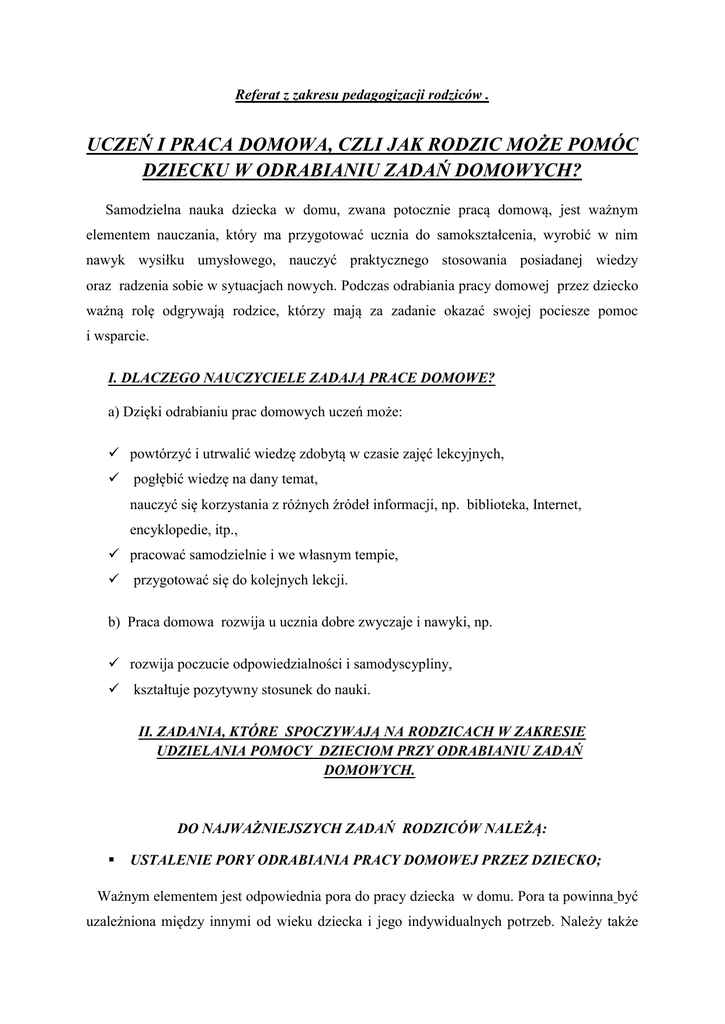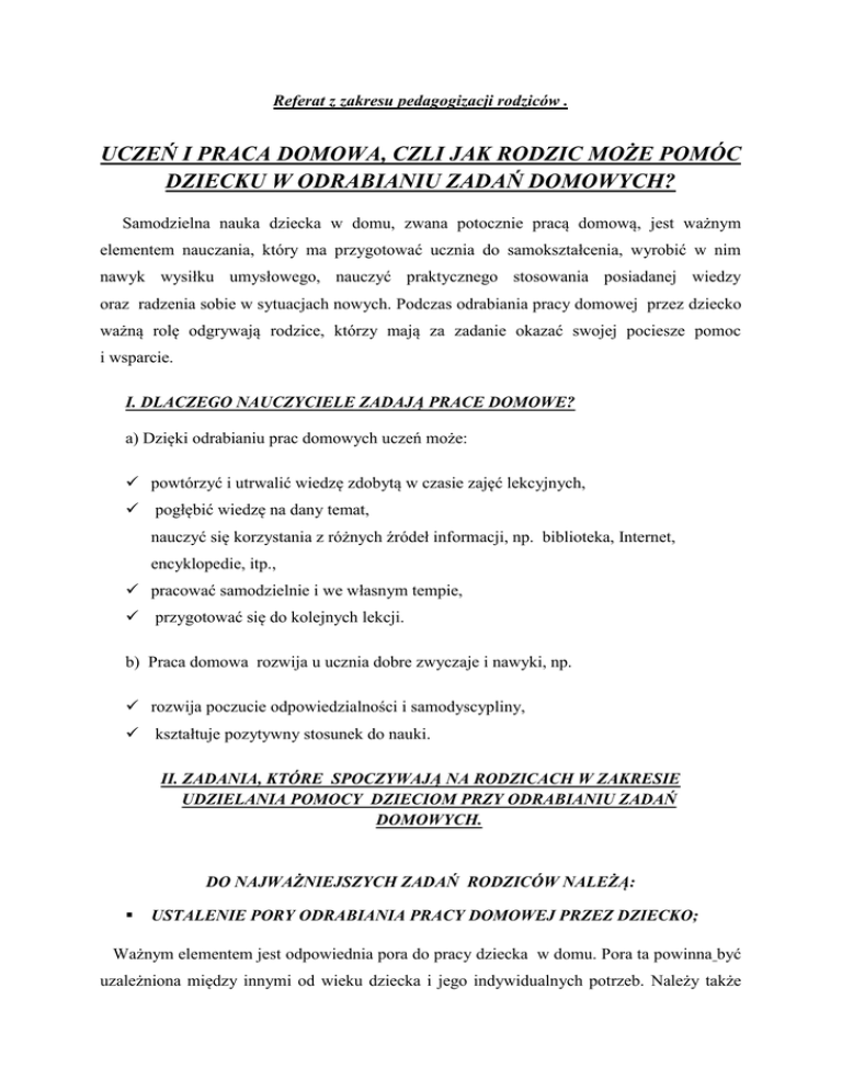 Referat z zakresu pedagogizacji rodziców . UCZEŃ I PRACA DOMOWA, CZLI JAK RODZIC MOŻE POMÓC DZIECKU W ODRABIANIU ZADAŃ DOMOWYCH? Samodzielna nauka dziecka w domu, zwana potocznie pracą domową, jest ważnym elementem nauczania, który ma przygotować ucznia do samokształcenia, wyrobić w nim nawyk wysiłku umysłowego, nauczyć praktycznego stosowania posiadanej wiedzy oraz radzenia sobie w sytuacjach nowych. Podczas odrabiania pracy domowej przez dziecko ważną rolę odgrywają rodzice, którzy mają za zadanie okazać swojej pociesze pomoc i wsparcie. I. DLACZEGO NAUCZYCIELE ZADAJĄ PRACE DOMOWE? a) Dzięki odrabianiu prac domowych uczeń może: powtórzyć i utrwalić wiedzę zdobytą w czasie zajęć lekcyjnych, pogłębić wiedzę na dany temat, nauczyć się korzystania z różnych źródeł informacji, np. biblioteka, Internet, encyklopedie, itp., pracować samodzielnie i we własnym tempie, przygotować się do kolejnych lekcji. b) Praca domowa rozwija u ucznia dobre zwyczaje i nawyki, np. rozwija poczucie odpowiedzialności i samodyscypliny, kształtuje pozytywny stosunek do nauki. II. ZADANIA, KTÓRE SPOCZYWAJĄ NA RODZICACH W ZAKRESIE UDZIELANIA POMOCY DZIECIOM PRZY ODRABIANIU ZADAŃ DOMOWYCH. DO NAJWAŻNIEJSZYCH ZADAŃ RODZICÓW NALEŻĄ: USTALENIE PORY ODRABIANIA PRACY DOMOWEJ PRZEZ DZIECKO; Ważnym elementem jest odpowiednia pora do pracy dziecka w domu. Pora ta powinna być uzależniona między innymi od wieku dziecka i jego indywidualnych potrzeb. Należy także uwzględniać wszystkie zasady racjonalnej pracy umysłowej. Dziecko nie może zabierać się do lekcji, np. bezpośrednio po przyjściu ze szkoły oraz po posiłku. Rodzice odpowiedzialni za dobre samopoczucie i prawidłowy rozwój dziecka muszą tak zharmonizować czynności i zajęcia, by wszystkie potrzeby dziecka były zaspokojone. WYBÓR MIEJSCE PRACY DLA DZIECKA PODCZAS ODRABIANIA PRACY DOMOWEJ; Obowiązkiem rodzica jest zapewnienie dziecku warunków do pracy w domu. Dla dobrej pracy ucznia ważna jest odpowiednia wysokość stołu i krzesła oraz właściwe oświetlenie. USUŃIĘCIE WSZYSTKIEGO, CO ROZPRASZA UWAGĘ DZIECKA; Rodzic powinien zadbać o to, aby telewizor został wyłączony na czas odrabiania przez dziecko pracy domowej oraz zrezygnować z słuchania w tym czasie głośnej muzyki przez pozostałych członków rodziny. ZAPEWNIENIE DZIECKU POTRZEBNYCH PRZYBORÓW I NARZĘDZI; powinien Rodzic zadbać, aby potrzebne podczas odrabiania prac domowych przybory i narzędzia (tj. ołówek, długopis, kredki, gumka, podręczniki, zeszyty, itp.) – znajdowały się w jednym miejscu ponieważ dziecko nie powinno tracić czasu na ich szukanie. PRZESTRZEGANIE RÓWNOMIERNEGO ROZŁOŻENIE PRACY DZIECKA PRZY ODRABIANIU ZADANYCH LEKCJI; Czas odrabiania zadań domowych przez ucznia w młodszych klasach nie powinien przekraczać godziny. W dużym jednak stopniu zależy to od samego dziecka, jego uzdolnień, możliwości koncentracji uwagi i od sprawności pracy. OKAZYWANIE DZIECKU SWOJEGO ZAINTERESOWANIA; Rodzice powinni poświęcać czas swojemu dziecku – zabierać go do biblioteki, aby zgromadzić materiały potrzebne do wykonania zadania domowego, czytać z nim tak często jak jest to tylko możliwe, rozmawiać z nim o szkole i zajęciach lekcyjnych. Zachęcać dziecko do wypowiadania się na temat tego, czego uczyło się w szkole danego dnia. Innym sposobem okazywania dziecku zainteresowania jest udział rodziców w zajęciach szkolnych, np. w wywiadówkach, akademiach, dniach otwartych, itp. KONTROLOWANIE PRAC DOMOWYCH; Obowiązkiem rodzica jest sprawdzenie, czy dziecko odrobiło lekcje. Po oddaniu pracy domowej przez nauczyciela rodzic powinien przeczytać jego ewentualne komentarze oraz sprawdzić prawidłowość wykonanego zadania. WYRABIANIE W DZIECKU DOBRYCH NAWYKÓW; RODZICE POWINNI: Wdrażać dziecko do systematycznej pracy i odrabiania zadań domowych od pierwszego dnia nauki; Pomóc dziecku w zorganizowaniu czasu niezbędnego do wykonania zadania domowego; Przygotować dziecko do określonych zadań w domu, np., jeżeli zostało zapowiedziane dyktando, przećwiczyć z nim pisownię wyrazów z określoną trudnością; Dopilnować, aby dziecko nie uczyło się na ostatnią chwilę przed sprawdzianem. STOSOWANIE POCHWAŁ WOBEC DZIECKA; Stosowanie przez rodziców pochwał i zachęt jest niezmiernie ważne dla dziecka. Powinno ono także być informowane gdy jego praca nie jest najlepszej jakości. Jednak komentarze rodziców powinny być konstruktywne. III. BŁĘDÓW, KTÓRYCH RODZICE POWINNI UNIKAĆ! NAJCZĘŚCIEJ POPEŁNIANE PRZEZ RODZICÓW BŁĘDY TO: Przesadna ambicja i stawianie zbyt wysokich wymagań, ciągła krytyka efektów pracy dziecka; Nadmierna kontrola i wyręczanie, które nie pozwalają na samodzielność i rozwijanie odpowiedzialności; Lekceważenie obowiązków szkolnych dziecka i niedostrzeganie jego sukcesów; Bezustanne przypominanie i popędzanie, które rodzą bierny opór; Zbyt szybkie objaśnianie dziecku zadania, zanim ono samo podejmie próbę zastanowienia się nad problemem, już uzyskuje pomoc. Taki nadmiar troski hamuje rozwój samodzielności. Karanie za niepowodzenia szkolne – może być przyczyną stanów lękowych i spowodować trudności w koncentracji uwagi; Przypominanie o konieczności odrobienia lekcji tonem rozkazującym i w stanie poirytowania; Stosowanie dodatkowej nauki jako kary; Deprecjonowanie znaczenia w życiu dorosłym wykształcenia i wiedzy. IV. ZNACZENIE PRACY DOMOWEJ W PROCESIE UCZENIA SIĘ DZIECKA Wykonywanie prac domowych wymaga od uczniów samodzielności. Doświadczony nauczyciel bez większego trudu rozpozna prace niesamodzielne. Prace domowe odrabiane przez rodziców lub rodzeństwo, łatwo zidentyfikować po stylu, doborze wyrazów, układzie treści, metodzie rozwiązania, itp. Wyręczanie dzieci podczas odrabiania prac domowych przynosi zgubne skutki, bowiem dziecko uczy się nieuczciwości, często domagając się od nauczyci