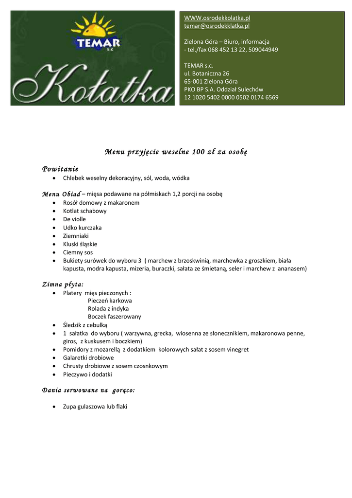 WWW.osrodekkolatka.pl [email protected] Zielona Góra – Biuro, informacja - tel./fax 068 452 13 22, 509044949 TEMAR s.c. ul. Botaniczna 26 65-001 Zielona Góra PKO BP S.A. Oddział Sulechów 12 1020 5402 0000 0502 0174 6569 Menu przyjęcie weselne 100 zł za osobę Powitanie Chlebek weselny dekoracyjny, sól, woda, wódka M e n u Obi a d – mięsa podawane na półmiskach 1,2 porcji na osobę Rosół domowy z makaronem Kotlat schabowy De violle Udko kurczaka Ziemniaki Kluski śląskie Ciemny sos Bukiety surówek do wyboru 3 ( marchew z brzoskwinią, marchewka z groszkiem, biała kapusta, modra kapusta, mizeria, buraczki, sałata ze śmietaną, seler i marchew z ananasem) Zimna płyta: Platery mięs pieczonych : Pieczeń karkowa Rolada z indyka Boczek faszerowany Śledzik z cebulką 1 sałatka do wyboru ( warzywna, grecka, wiosenna ze słonecznikiem, makaronowa penne, giros, z kuskusem i boczkiem) Pomidory z mozarellą z dodatkiem kolorowych sałat z sosem vinegret Galaretki drobiowe Chrusty drobiowe z sosem czosnkowym Pieczywo i dodatki Dan i a s e r w o w a ne na gor ą co: Zupa gulaszowa lub flaki Dodatkowo: Ciasto, alkohol własny Owoce, soki, napoje – do uzgodnienia Bufet kawowo – herbaciany – bez ograniczeń – 7 zł za osobę Kawa z ekspresu ciśnieniowego , kawa rozpuszczalna, kawa parzona, herbaty różnorodne Chłopskie jadło na paśniku – dla 60 osób to koszt dodatkowy 500 zł, powyżej 60 osób 1000 zł Pajda chleba ze smalcem i ogórkiem małosolnym Prosiak, dzik w zależności od wagi – około 1500 zł Cena obejmuje wynajęcie sali na wyłączność z obsługą i sprzątaniem na 1 dzień POPRAWINY : Wynajęcie sali z obsługą i sprzątaniem - 30 zł od osoby z bufetem kawa/ herbata , jednak nie mniej niż 2000 zł przy rezerwacji sali na wyłączność . W ramach ceny podanie i odgrzanie potraw , które pozostały po weselu oraz bufet kawowoherbaciany. Dodatkowa konsumpcja zamawiana na poprawiny płatna zgodnie z cennikiem: Żurek z jajkiem i pieczywem – 9 zł Ziemniaki, pieczeń karkowa z ciemnym sosem i zestawem surówek – 18 zł lub inne dania ustalone indywidualnie. Istnieje możliwość dostosowania menu do Państwa potrzeb. Prosimy o zapoznanie się z naszą ofertą. W razie potrzeby proponujemy spotkanie z szefem kuchni – chętnie odpowie na każde Państwa pytanie i wyjaśni skład i formę podania poszczególnych potraw, które zastępczo , bądź dodatkowo możemy umieścić w Państwa indywidualnym menu.