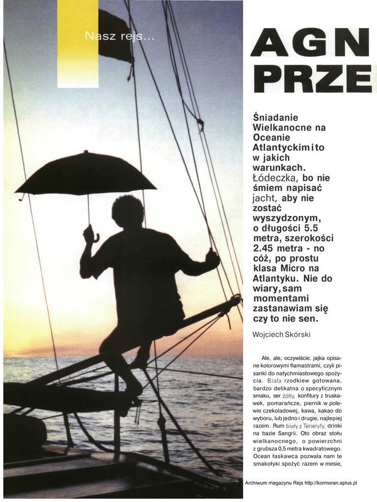 Śniadanie Wielkanocne na Oceanie Atlantyckim i to w jakich warunkach. Łódeczka, bo nie śmiem napisać jacht, aby nie zostać wyszydzonym, o długości 5.5 metra, szerokości 2.45 metra - no cóż, po prostu klasa Micro na Atlantyku. Nie do wiary, sam momentami zastanawiam się czy to nie sen. Wojciech Skórski Ale, ale, oczywiście, jajka opisane kolorowymi flamastrami, czyli pisanki do natychmiastowego spożycia. Biała rzodkiew gotowana, bardzo delikatna o specyficznym smaku, ser żółty, konfitury z truskawek, pomarańcze, piernik w polewie czekoladowej, kawa, kakao do wyboru, lub jedno i drugie, najlepiej razem. Rum biały z Teneryfy, drinki na bazie Sangrii. Oto obraz stołu wielkanocnego, o powierzchni z grubsza 0,5 metra kwadratowego. Ocean łaskawca pozwala nam te smakołyki spożyć razem w mesie, Archiwum magazynu Rejs http://kormoran.aplus.pl ESSĄ Z ATLANTYK ponieważ tódka od doby płynie sama. Rumpel na ekspandorach, grot na kontraszocie, fok wypchnięty na spinakerbomie. Płyniemy sobie całkiem spokojnie w kierunku południowo-zachodnim z prędkością 2,5 - 3 węzłów, wiatr wieje równomiernie z kierunku W N W z siłą odpowiadającą dwóm stopniom w skali Beauforta. Wspaniałe, najprzeróżniejsze odcienie niebieskiego, od błękitu, lazuru do dark blue, które oferuje nam morze i niebo. Kolorystykę uzupełnia motylek pomarańczowo-brązowy, który za chwilę odleci i wszystkie jego kolory zmieszają się w ogniwie łańcucha pokarmowego. Świąteczny nastrój dodatkowo podtrzymu- ją Placido Domingo i Jose Carreras. Słucham festiwalu muzyki hiszpańskiej z rozgłośni na Kanarach. Dalszy ciąg Świątecznego Dnia to leżenie bykiem, no i dogadzanki, czyli kurczak 'a la Alicja, kasza gryczana, papryka, zupa pomidorowa. Wlałem trochę za dużo wody, trudno, będzie na trzy dni, kolacja już bez wybryków, jeśli można tak potraktować kanapki z czosnkiem. Z obowiązku zapisuję; kończy się chleb, niestety, dwa bochenki już spleśniały. Rozglądam się po łódce, no cóż teraz parę rzeczy chętnie bym zmienił. Jest zbyt mało specjalnych miejsc na rzeczy osobiste; mydło, przybory do golenia, szczoteczka do zębów itp. Miejsca w ogóle jest do- syć, ale na niektóre nasze dobra powinny być specjalnie zaprojektowane, dopasowane schowki, i co najważniejsze, umieszczone tak, aby były bardzo łatwo dostępne. Kuchenka umieszczona jest pod stołem na kardanie. Na szczęście, pomyślałem przedtem o tym, aby stół można było podnosić do góry i obracać go, z czego zresztą niejednokrotnie korzystaliśmy. Oczywiście, powinny być stałe miejsca na radionamiernik, mapy, ołówki, latarkę itp. O czym dokładnie wcześniej wiedzieliśmy. l tak, powoli zbliżamy się do kuszącej próby stworzenia idealnego jachtu, próby, którą od czasu do czasu podejmują znane żeglarskie czasopisma, opierając się na doświad- Archiwum magazynu Rejs http://kormoran.aplus.pl czeniach i przemyśleniach znakomitości żeglarskich. Problem ten wraca co jakiś czas. Jak sobie przypominam stworzony przez nas wiele lat temu, ten wymarzony, wyśniony jacht, dziób miał oparty o Amerykę, a rufę o Europę. Nie będę już wspominał o najprzeróżniejszych udogodnieniach, wymysłach, bajerach i luksusach. Natomiast winien jestem wyjaśnienie; skąd się wzięło dwóch facetów na oceanie, w „łupince" odpowiadającej wymogom klasy Micro, chcących przepłynąć Wielką Wodę. Otóż, 2-3 lata temu uległem wypadkowi samochodowemu. Przeleżałem dwa miesiące i w tym czasie narysowałem linie teoretyczne nowego jachciku, takiego trochę do turystyki, trochę do ścigania się. Mój kolega Kazio Kwasiborski, który płynie ze mną, miał ochotę spróbować swoich umiejętności jako szkutnik. Zaczął robić formę w/g mojej dokumentacji, l tak po mniej więcej dwóch latach mieliśmy do dyspozycji niedokończoną formę łódki, a życie szło swoim torem i płatało najprzeróżniejsze figle, często niezbyt przyjemne, a jeszcze częściej bardzo nieprzyjemne. Tak, powoli dojrzał we mnie pomysł: A jakby sobie gdzieś popłynąć. Gdzie, to jest stosunkowo proste - palec na mapę i już. Ale na czym, to już jest pytanie. No i rozwiązanie nasunęło się samo - zrobić własnoręcznie łódkę, po pierwsze to taniej, po drugie nie jestem wtedy od kogokolwiek zależny. Jeśli ma być tanio, to znaczy, że musi być mała. Pomysł skrystalizował się. Ale jak zwykle czegoś brakowało, aby od pomysłu przejść do czynu. Ciekawe... czy zastanawialiście się kiedykolwiek ilu wielkich odkryć, podróży nie byłoby gdyby nie zawody miłosne? Ile poematów, utworów nie zostało by stworzonych? Jak wielu mężczyzn pchnęło to do desperackich przedsięwzięć, l nie wiadomo teraz z perspektywy czasu, czy lepiej było im życzyć szczęścia u ukochanej osoby, czy lepiej (dla wynalazków, rozwoju), że ich miłość nie spełniła się. l tą przysłowiową kroplą przepełniającą czarę, nie wstydzę się tego powiedzieć, w moim przypadku było rozstanie z miłością mego życia. No cóż, rozpacz, smutek, żal, ale uczucie nie wygasło i łódka nosi imię AGNESSA od imienia mej (teraz już niestety byłej) ukochanej. Mówiąc cherchez la femme , w tym, j a k i w wielu innych wypadkach będzie się niezbyt dalekim od prawdy. Sama budowa łodzi trwała około dziesięciu tygodni. Poza warunkami technicznymi, które musiała spełnić jako łódka klasy Micro, postawiłem dodatkowo parę wymogów odnośnie bezpieczeństwa i jak mi się wte- Archiwum magazynu Rejs http://kormoran.aplus.pl dy wydawało - wygody. W sumie komory wypornościowe miały objętość ponad jeden metr sześcienny przy masie łódki (bez prowiantu, wody, narzędzi) 560 kg. Maszt, bom, spinakerbomy były wypełnione pianką poliuretanową. Zrezygnowałem z luku przedniego i dostępu do achterpiku z zewnątrz, zostały natomiast okna. Zamocowaliśmy parę dodatkowych uchwytów niezwykle t