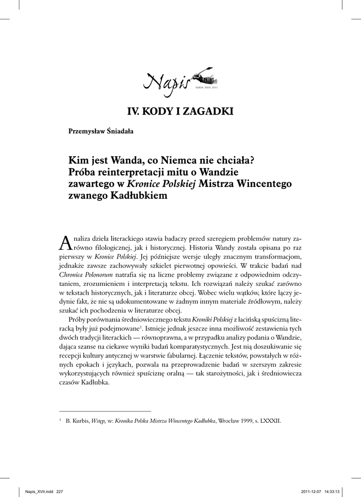 SERIA XVII 2011 IV. KODY I ZAGADKI Przemysław Śniadała Kim jest Wanda, co Niemca nie chciała? Próba reinterpretacji mitu o Wandzie zawartego w Kronice Polskiej Mistrza Wincentego zwanego Kadłubkiem A naliza dzieła literackiego stawia badaczy przed szeregiem problemów natury zarówno filologicznej, jak i historycznej. Historia Wandy została opisana po raz pierwszy w Kronice Polskiej. Jej późniejsze wersje uległy znacznym transformacjom, jednakże zawsze zachowywały szkielet pierwotnej opowieści. W trakcie badań nad Chronica Polonorum natrafia się na liczne problemy związane z odpowiednim odczytaniem, zrozumieniem i interpretacją tekstu. Ich rozwiązań należy szukać zarówno w tekstach historycznych, jak i literaturze obcej. Wobec wielu wątków, które łączy jedynie fakt, że nie są udokumentowane w żadnym innym materiale źródłowym, należy szukać ich pochodzenia w literaturze obcej. Próby porównania średniowiecznego tekstu Kroniki Polskiej z łacińską spuścizną literacką były już podejmowane1. Istnieje jednak jeszcze inna możliwość zestawienia tych dwóch tradycji literackich — równoprawna, a w przypadku analizy podania o Wandzie, dająca szanse na ciekawe wyniki badań komparatystycznych. Jest nią doszukiwanie się recepcji kultury antycznej w warstwie fabularnej. Łączenie tekstów, powstałych w różnych epokach i językach, pozwala na przeprowadzenie badań w szerszym zakresie wykorzystujących również spuściznę oralną — tak starożytności, jak i średniowiecza czasów Kadłubka. 1 Napis_XVII.indd 227 B. Kurbis, Wstęp, w: Kronika Polska Mistrza Wincentego Kadłubka, Wrocław 1999, s. LXXXII. 2011-12-07 14:33:13 228 Przemysław Śniadała Wraz z kolejnymi próbami odczytania legendy2, niezwykle pomocne okazuje się odwoływanie się do tekstów antycznych, co dowodzi istnienia powiązań z tą tradycją. Największym problemem, przed jakim stoją badacze dzieła Wincentego Kadłubka, jest próba ustalenia, czy opowieść o Wandzie funkcjonowała na terenach polskich przed wiekiem XIII. Dotychczas uważano, że cała historia o założeniu Krakowa była recepcją tradycji oralnej, która istniała na terenach krakowskich. Nie dawano jasnej odpowiedzi na temat pochodzenia podania, chociaż pozostałe części Kroniki Polskiej zostały opracowane zgodnie z metodą porównawczą3. W Kronice Polskiej Wanda zajmuje miejsce szczególne. Pojawia się nagle, tworząc obraz pierwszej królowej terenów polskich. Jest ona postacią, której istnienie nie zostało poświadczone w żadnych wcześniejszych tekstach. Jej rola w legendzie o założeniu miasta Krakowa rozwinęła się za sprawą Dzierzwy i Długosza. W świetle tych trzech podań, historia opisana przez Mistrza Wincentego, przedstawia się dość ubogo. Brak w niej sprecyzowania celowości całego wątku, który zdaje się pełnić raczej funkcję dynamiczną (wpływając na rozwój fabuły) aniżeli dydaktyczną. Jest to błędne założenie, które rodzi więcej pytań niż odpowiedzi. Każdorazowe próby zbadania wątku córki Grakcha sprowadzały się do twierdzeń, że jest on odzwierciedleniem ówczesnych relacji polsko–germańskich4. Taki sposób rozumienia Kroniki Polskiej wynika bardziej z braków wiedzy filologiczno–historycznej, niż logicznego tropu interpretacyjnego. Mając bowiem w pamięci wnioski na temat pozostałych postaci legendy krakowskiej (walka ze smokiem, bratobójstwo), jak również silne oddziaływanie literatury antycznej, warto postawić tezę, według której Wanda jest również schrystianizowanym zapożyczeniem ze starożytności. Chociaż „polskość” bohaterki wydaje się oczywista, to próba uzasadnienia wyżej wymienionej tezy może tę sytuację diametralnie zmienić i doprowadzić do reinterpretacji tego podania 2 Zgodnie z tradycją badawczą, pojęcia „legenda” i „podanie” stosuję tu wymiennie. H. Olczak– Mortkowiczówna w książce Podanie o Wandzie: dzieje wątku literackiego (Warszawa 1927) jako określenia opowieści o Wandzie używa pojęcia „podanie”. Tego samego określenia używa w swojej pracy Kazimierz Kumaniecki (Podanie o Wandzie w świetle źródeł starożytnych, w: Scripta Minora, red. O. Jurewicz, Wrocław–Warszawa, 1967). Podaniem nazywa się zazwyczaj opowieść ludową, tradycji ustnej, która jest fikcyjna, jednakże związana bezpośrednio z jakimś miejscem (zob. W. Kopaliński, hasło Podanie, w: idem, Słownik mitów i tradycji kultury, Warszawa 2007, s. 500). Jacek Banaszkiewicz w pracy Polskie dzieje bajeczne Mistrza Wincentego Kadłubka (Wrocław 1998) stosuje natomiast pojęcie „legenda”, czyli opowieść fantastyczna o tematyce historycznej, której podstawą są podania ludowe (zob. W. Kopaliński, hasło Legenda, w: idem, Słownik mitów i tradycji kultury, op. cit., s. 161). 3 J. Banaszkiewicz, op. cit., także: B. Kurbis, Wstęp, w: Kronika Polska Mistrza Wincentego Kadłubka, op. cit. 4 Za początek odczytywania legendy o Wandzie i tyranie lemańskim w kontekście relacji polsko–germańskich należy przyjąć Cud mniemany czyli krakowiaków i górali Wojciecha Bogusławskiego z 1794 roku, w którym znajduje się ustęp: „Wanda leży w naszej ziemi, co nie chciała Niemca”. Fragment ten był traktowany jako jedno z antyniemieckich haseł propagandowych w XX wieku. Napis_XVII.indd 228 2011-12-07 14:33:13 Kim jest Wanda, co Niemca nie chciała? Próba reinterpretacji mitu o Wandzie… 229 Chociaż „nacjonalistyczna” wizja krakowskiej legendy trwa nieprzerwanie od wielu lat, to już w 1925 r. Kazimierz Kumaniecki stwierdził, jakoby geneza Wandy sięgała sta5 rożytności . Sugeruje on, że opowieść o córce Grakcha, którą przedstawia Długosz, jest odzwierciedleniem dziejów królowej Kartaginy, Dydony. To myśl znacząca również w świetle badań nad Kroniką Polską. Jednakże początków historii o Wandzie i jej powiązań z antykiem należy szukać u Kadłubk