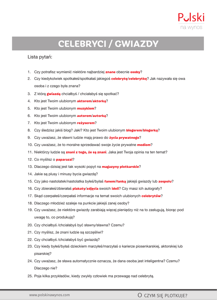 na wynos CELEBRYCI / GWIAZDY Lista pytań: 1. Czy potrafisz wymienić niektóre najbardziej znane obecnie osoby? 2. Czy kiedykolwiek spotkałeś/spotkałaś jakiegoś celebrytę/celebrytkę? Jak nazywała się owa osoba i z czego była znana? 3. Z którą gwiazdą chciałbyś / chciałabyś się spotkać? 4. Kto jest Twoim ulubionym aktorem/aktorką? 5. Kto jest Twoim ulubionym muzykiem? 6. Kto jest Twoim ulubionym autorem/autorką? 7. Kto jest Twoim ulubionym reżyserem? 8. Czy śledzisz jakiś blog? Jaki? Kto jest Twoim ulubionym blogerem/blogerką? 9. Czy uważasz, że sławni ludzie mają prawo do życia prywatnego? 10. Czy uważasz, że to moralne sprzedawać swoje życie prywatne mediom? 11. Niektórzy ludzie są znani z tego, że są znani. Jaka jest Twoja opinia na ten temat? 12. Co myślisz o paparazzi? 13. Dlaczego dzisiaj jest tak wysoki popyt na magazyny plotkarskie? 14. Jakie są plusy i minusy bycia gwiazdą? 15. Czy jako nastolatek/nastolatka byłeś/byłaś fanem/fanką jakiejś gwiazdy lub zespołu? 16. Czy zbierałeś/zbierałaś plakaty/zdjęcia swoich idoli? Czy masz ich autografy? 17. Skąd czerpałeś/czerpałaś informacje na temat swoich ulubionych celebrytów? 18. Dlaczego młodzież szaleje na punkcie jakiejś zanej osoby? 19 . Czy uważasz, że niektóre gwiazdy zarabiają więcej pieniędzy niż na to zasługują, biorąc pod uwagę to, co produkują? 20. Czy chciałbyś /chciałabyś być sławny/sławna? Czemu? 21. Czy myślisz, że znani ludzie są szczęśliwi? 22. Czy chciałbyś /chciałabyś być gwiazdą? 23. Czy kiedy byłeś/byłaś dzieckiem marzyłeś/marzyłaś o karierze piosenkarskiej, aktorskiej lub pisarskiej? 24. Czy uważasz, że sława automatycznie oznacza, że dana osoba jest inteligentna? Czemu? Dlaczego nie? 25. Poja kilka przykładów, kiedy zwykły człowiek ma przewagę nad celebrytą. www.polskinawynos.com O CZYM SIĘ PLOTKUJE?