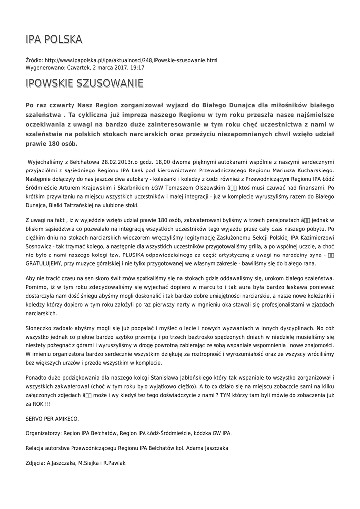 IPA POLSKA Źródło: http://www.ipapolska.pl/ipa/aktualnosci/248,IPowskie-szusowanie.html Wygenerowano: Czwartek, 2 marca 2017, 19:17 IPOWSKIE SZUSOWANIE Po raz czwarty Nasz Region zorganizował wyjazd do Białego Dunajca dla miłośników białego szaleństwa . Ta cykliczna już impreza naszego Regionu w tym roku przeszła nasze najśmielsze oczekiwania z uwagi na bardzo duże zainteresowanie w tym roku chęć uczestnictwa z nami w szaleństwie na polskich stokach narciarskich oraz przeżyciu niezapomnianych chwil wzięło udział prawie 180 osób. Wyjechaliśmy z Bełchatowa 28.02.2013r.o godz. 18,00 dwoma pięknymi autokarami wspólnie z naszymi serdecznymi przyjaciółmi z sąsiedniego Regionu IPA Łask pod kierownictwem Przewodniczącego Regionu Mariusza Kucharskiego. Następnie dołączyły do nas jeszcze dwa autokary - koleżanki i koledzy z Łodzi również z Przewodniczącym Regionu IPA Łódź Śródmieście Arturem Krajewskim i Skarbnikiem ŁGW Tomaszem Olszewskim â ktoś musi czuwać nad finansami. Po krótkim przywitaniu na miejscu wszystkich uczestników i małej integracji - już w komplecie wyruszyliśmy razem do Białego Dunajca, Białki Tatrzańskiej na ulubione stoki. Z uwagi na fakt , iż w wyjeździe wzięło udział prawie 180 osób, zakwaterowani byliśmy w trzech pensjonatach â jednak w bliskim sąsiedztwie co pozwalało na integrację wszystkich uczestników tego wyjazdu przez cały czas naszego pobytu. Po ciężkim dniu na stokach narciarskich wieczorem wręczyliśmy legitymację Zasłużonemu Sekcji Polskiej IPA Kazimierzowi Sosnowicz - tak trzymać kolego, a następnie dla wszystkich uczestników przygotowaliśmy grilla, a po wspólnej uczcie, a choć nie było z nami naszego kolegi tzw. PLUSIKA odpowiedzialnego za część artystyczną z uwagi na narodziny syna - GRATULUJEMY, przy muzyce góralskiej i nie tylko przygotowanej we własnym zakresie - bawiliśmy się do białego rana. Aby nie tracić czasu na sen skoro świt znów spotkaliśmy się na stokach gdzie oddawaliśmy się, urokom białego szaleństwa. Pomimo, iż w tym roku zdecydowaliśmy się wyjechać dopiero w marcu to i tak aura była bardzo łaskawa ponieważ dostarczyła nam dość śniegu abyśmy mogli doskonalić i tak bardzo dobre umiejętności narciarskie, a nasze nowe koleżanki i koledzy którzy dopiero w tym roku założyli po raz pierwszy narty w mgnieniu oka stawali się profesjonalistami w zjazdach narciarskich. Słoneczko zadbało abyśmy mogli się już poopalać i myśleć o lecie i nowych wyzwaniach w innych dyscyplinach. No cóż wszystko jednak co piękne bardzo szybko przemija i po trzech beztrosko spędzonych dniach w niedzielę musieliśmy się niestety pożegnać z górami i wyruszyliśmy w drogę powrotną zabierając ze sobą wspaniałe wspomnienia i nowe znajomości. W imieniu organizatora bardzo serdecznie wszystkim dziękuję za roztropność i wyrozumiałość oraz że wszyscy wróciliśmy bez większych urazów i przede wszystkim w komplecie. Ponadto duże podziękowania dla naszego kolegi Stanisława Jabłońskiego który tak wspaniale to wszystko zorganizował i wszystkich zakwaterował (choć w tym roku było wyjątkowo ciężko). A to co działo się na miejscu zobaczcie sami na kilku załączonych zdjęciach â może i wy kiedyś też tego doświadczycie z nami ? TYM którzy tam byli mówię do zobaczenia już za ROK !!! SERVO PER AMIKECO. Organizatorzy: Region IPA Bełchatów, Region IPA Łódź-Śródmieście, Łódzka GW IPA. Relacja autorstwa Przewodniczącegu Regionu IPA Bełchatów kol. Adama Jaszczaka Zdjęcia: A.Jaszczaka, M.Siejka i R.Pawlak Pozdrawiam Serdecznie. Robert Pawlak Sekretarz Łódzkiej GW IPA Ocena: 0/5 (0) Tweetnij Łódzka Grupa Wojewódzka IPA