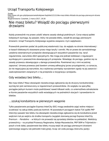 Urząd Transportu Kolejowego Źródło: http://www.utk.gov.pl/pl/pasazerowie/kolejowe-faq/bilet/12115,Nie-masz-biletu-Wsiadz-do-pociagu-pierwszymi-drzwia mi.html Wygenerowano: Czwartek, 2 marca 2017, 19:26 Nie masz biletu? Wsiądź do pociągu pierwszymi drzwiami Każdy przewoźnik ma prawo ustalić własne zasady obsługi podróżnych. Coraz więcej spółek kolejowych wymaga, by pasażer, który nie posiada biletu, wsiadł do pociągu pierwszymi drzwiami. Urząd Transportu Kolejowego wyjaśnia związane z tym wątpliwości. Przewoźnik powinien podać do publicznej wiadomości (np. do wglądu na stronie internetowej i w kasach biletowych) stosowane przez niego taryfy i cenniki. Ma on prawo do samodzielnego ustalenia wewnętrznych przepisów obowiązujących wszystkich pasażerów (np. taryf, regulaminów, warunków ofert specjalnych). Nie mogą one jednak kolidować z regulacjami wynikającymi z powszechnie obowiązujących przepisów. Wsiadając do pociągu, godzisz się na zasady przewozu obowiązujące u danego przewoźnika. Powinieneś się z nimi wcześniej zapoznać. Umowa przewozu jest bowiem umową adhezyjną (przez przystąpienie), co oznacza, że nie negocjujesz jej warunków, lecz wybierasz pomiędzy wyrażeniem zgody na jej zawarcie i zaakceptowaniem związanych z nią przepisów a rezygnacją z przejazdu. Gdy wsiadasz bez biletu… Nie masz biletu? Masz obowiązek niezwłocznego zgłoszenia się do drużyny konduktorskiej wymóg ten jest zamieszczony w regulaminach przewoźników. Ze względu na specyfikę pociągów jednym kursem może podróżować nawet kilkaset osób, co uniemożliwia odnalezienie w tłumie pasażerów wszystkich osób wsiadających na pośrednich stacjach i sprawdzenie im biletów. …szukaj konduktora w pierwszym wagonie Tylko pasażerowie pociągów Express InterCity (EIC) mogą swobodnie zająć wolne miejsce i oczekiwać na zakup biletu podczas kontroli. W pozostałych pociągach (także TLK spółki PKP Intercity) pasażer bez biletu ma obowiązek niezwłocznego zgłoszenia się do konduktora przed wejściem lub po wejściu do środka transportu (wyjątek stanowią pociagi Express InterCity Premium – Pendolino – w których nie prowadzi się sprzedaży biletów na pokładzie). Niektórzy przewoźnicy – na przykład Przewozy Regionalne, Koleje Mazowieckie, PKP SKM w Trójmieście – poszli o krok dalej: pasażerowie bez biletu muszą wejść do pociągu pierwszymi drzwiami (pierwszego wagonu lub jednostki trakcyjnej), licząc od czoła pociągu (kierunku jazdy). Gdzie czekać, gdy nie ma konduktora? Jeśli wsiądziemy do pociągu przewoźników regionalnych pierwszymi drzwiami, a w pierwszym wagonie nie znajdziemy konduktora, nie możemy wmieszać się między innych pasażerów i zająć dowolne miejsce. Musimy poczekać na konduktora. Spółka SKM w Trójmieście zapisała to w swoim regulaminie w sposób bezpośredni (§7 ust. 16): „W przypadku, gdy w pierwszym wagonie nie ma kierownika pociągu/konduktora, podróżny ma obowiązek na niego poczekać”. Spółka Koleje Mazowieckie w piśmie do UTK sprecyzowała obowiązującą u niej podobną regulację: „W przypadku, gdy w chwili wejścia do pociągu pasażer nie zastanie w pierwszym przedziale kierownika pociągu lub konduktora, ma obowiązek oczekiwania na ich powrót oraz ma pełne prawo do zajęcia miejsca siedzącego w tym przedziale w oczekiwaniu na zakup biletu na przejazd. Podróżny oczekujący w pierwszym przedziale za czynną kabiną maszynisty nie może zostać uznany za osobę próbującą wyłudzić przejazd bez ważnego biletu”. Oznacza to, że w pociągach KM można bezpiecznie oczekiwać na konduktora w pierwszym przedziale. Tylko tam, nie mając biletu, nie narażasz się na otrzymanie kary. Nie powinieneś więc poszukiwać konduktora na własną rękę. Podejmowanie takich prób może wiązać się ze spotkaniem w głębi pociągu kontrolera, który stwierdzi niezastosowanie się do regulaminu i nieposiadanie biletu. Ma więc prawo wystawić Ci wezwanie do zapłaty. Spółka Przewozy Regionalne wyjaśniła zaś, że ze względu na różnorodność eksploatowanego taboru miejscem przeznaczonym dla podróżnych bez ważnego dokumentu jest: 1) w elektrycznych zespołach trakcyjnych: pierwszy przedział pasażerski pomiędzy pomostami, na których znajdują się drzwi wejściowe do pociągu, 2) w wagonach z przedziałami – korytarz prowadzący do nich; 3) w szynobusach lub wagonach bezprzedziałowych – przestrzeń z miejscami do siedzenia. Przewoźnik przypomina jednak, że „osoby, które wsiadły do pociągu pierwszymi drzwiami i w bliższej lub dalszej odległości od nich oczekują na obsługę pociągu, w chwili jej pojawienia się mają obowiązek niezwłocznie zgłosić się po zakup biletu lub legalizację dokumentu przewozu”. U przewoźników, którzy nie wymagają wsiadania do pociągu pierwszymi drzwiami, sam musisz znaleźć konduktora. Powinieneś zrobić to w pierwszej kolejności przed wejściem lub po wejściu do wagonu. We wszystkich spółkach kolejowych (z wyjątkiem pociągów kategorii Express InterCity - EIC) niedopuszczalna jest zajęcie dowolnego miejsca siedzącego i oczekiwanie na ujawnienie braku biletu podczas kontroli. W takim przypadku konduktor stwierdzi brak biletu i ma obowiązek wystawić wezwanie do zapłaty (nawet kilkusetzłotową karę). Spotykane niekiedy przypadki odstąpienia od naliczenia kary pieniężnej oznaczają naruszenie przez konduktora regulaminu swojego pracodawcy. Nie należy spodziewać się, że podczas kolejnej podróży natrafisz na równie łaskawego kontrolera. Osoby uprzywilejowane, czyli odstępstwa od zasad Zgodnie z unijnym Rozporządzeniem (WE) 1371/2007 dotyczącym praw i obowiązków pasażerów w ruchu kolejowym obowiązek wejścia do pociągu pierwszymi drzwiami lub samodzielnego znalezienia konduktora nie dotyczy jedynie osób niepełnosprawnych oraz osób o ograniczonej sprawności ruchowe