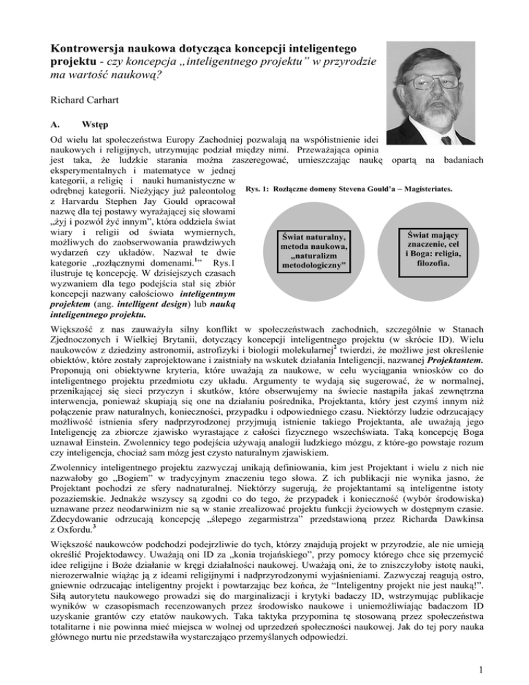 Kontrowersja naukowa dotycząca koncepcji inteligentego projektu - czy koncepcja „inteligentnego projektu” w przyrodzie ma wartość naukową? Richard Carhart A. Wstęp Od wielu lat społeczeństwa Europy Zachodniej pozwalają na współistnienie idei naukowych i religijnych, utrzymując podział między nimi. Przeważająca opinia jest taka, że ludzkie starania można zaszeregować, umieszczając naukę opartą na badaniach eksperymentalnych i matematyce w jednej kategorii, a religię i nauki humanistyczne w odrębnej kategorii. Nieżyjący już paleontolog Rys. 1: Rozłączne domeny Stevena Gould’a – Magisteriates. z Harvardu Stephen Jay Gould opracował nazwę dla tej postawy wyrażającej się słowami „żyj i pozwól żyć innym”, która oddziela świat wiary i religii od świata wymiernych, Świat mający Świat naturalny, możliwych do zaobserwowania prawdziwych znaczenie, cel metoda naukowa, wydarzeń czy układów. Nazwał te dwie i Boga: religia, „naturalizm kategorie „rozłącznymi domenami.1” Rys.1 filozofia. metodologiczny” ilustruje tę koncepcję. W dzisiejszych czasach wyzwaniem dla tego podejścia stał się zbiór koncepcji nazwany całościowo inteligentnym projektem (ang. intelligent design) lub nauką inteligentnego projektu. Większość z nas zauważyła silny konflikt w społeczeństwach zachodnich, szczególnie w Stanach Zjednoczonych i Wielkiej Brytanii, dotyczący koncepcji inteligentnego projektu (w skrócie ID). Wielu naukowców z dziedziny astronomii, astrofizyki i biologii molekularnej2 twierdzi, że możliwe jest określenie obiektów, które zostały zaprojektowane i zaistniały na wskutek działania Inteligencji, nazwanej Projektantem. Proponują oni obiektywne kryteria, które uważają za naukowe, w celu wyciągania wniosków co do inteligentnego projektu przedmiotu czy układu. Argumenty te wydają się sugerować, że w normalnej, przenikającej się sieci przyczyn i skutków, które obserwujemy na świecie nastąpiła jakaś zewnętrzna interwencja, ponieważ skupiają się one na działaniu pośrednika, Projektanta, który jest czymś innym niż połączenie praw naturalnych, konieczności, przypadku i odpowiedniego czasu. Niektórzy ludzie odrzucający możliwość istnienia sfery nadprzyrodzonej przyjmują istnienie takiego Projektanta, ale uważają jego Inteligencję za zbiorcze zjawisko wyrastające z całości fizycznego wszechświata. Taką koncepcję Boga uznawał Einstein. Zwolennicy tego podejścia używają analogii ludzkiego mózgu, z które-go powstaje rozum czy inteligencja, chociaż sam mózg jest czysto naturalnym zjawiskiem. Zwolennicy inteligentnego projektu zazwyczaj unikają definiowania, kim jest Projektant i wielu z nich nie nazwałoby go „Bogiem” w tradycyjnym znaczeniu tego słowa. Z ich publikacji nie wynika jasno, że Projektant pochodzi ze sfery nadnaturalnej. Niektórzy sugerują, że projektantami są inteligentne istoty pozaziemskie. Jednakże wszyscy są zgodni co do tego, że przypadek i konieczność (wybór środowiska) uznawane przez neodarwinizm nie są w stanie zrealizować projektu funkcji życiowych w dostępnym czasie. Zdecydowanie odrzucają koncepcję „ślepego zegarmistrza” przedstawioną przez Richarda Dawkinsa z Oxfordu.3 Większość naukowców podchodzi podejrzliwie do tych, którzy znajdują projekt w przyrodzie, ale nie umieją określić Projektodawcy. Uważają oni ID za „konia trojańskiego”, przy pomocy którego chce się przemycić idee religijne i Boże działanie w kręgi działalności naukowej. Uważają oni, że to zniszczyłoby istotę nauki, nierozerwalnie wiążąc ją z ideami religijnymi i nadprzyrodzonymi wyjaśnieniami. Zazwyczaj reagują ostro, gniewnie odrzucając inteligentny projekt i powtarzając bez końca, że “Inteligentny projekt nie jest nauką!”. Siłą autorytetu naukowego prowadzi się do marginalizacji i krytyki badaczy ID, wstrzymując publikacje wyników w czasopismach recenzowanych przez środowisko naukowe i uniemożliwiając badaczom ID uzyskanie grantów czy etatów naukowych. Taka taktyka przypomina tę stosowaną przez społeczeństwa totalitarne i nie powinna mieć miejsca w wolnej od uprzedzeń społeczności naukowej. Jak do tej pory nauka głównego nurtu nie przedstawiła wystarczająco przemyślanych odpowiedzi. 1 Te dwa sposoby podejścia są klasycznym przypadkiem możliwego częściowego pokrywania się przyczyn nadnaturalnych i naturalnych. Aby ukierunkować dyskusję uznajmy, że jeżeli naprawdę istnieją dowody naukowe projektu, to przypuszczalnym Projektantem jest tradycyjny monoteistyczny Bóg. Pytanie w celu obiektywnych badań brzmi, czy Bóg, Stwórca, pozostawił wyraźne dowody bezpośredniego działania, które nie wynika z naturalnych praw. Jeżeli istnieje prawdziwy Stwórca, nie możemy go usunąć do jakiegoś eterycznego „duchowego królestwa” czy „rozłącznej domeny”. Stwórca na tyle potężny, aby stworzyć i podtrzymywać wszechświat mógłby słusznie postanowić, że będzie interweniował w tym wszechświecie. Aby jasno omówić, co dzieje się w związku z kontrowersją dotyczącą inteligentnego projektu, musimy rozpocząć od próby zdefiniowania dwóch rywalizujących światopoglądów, które zderzają się w tej kontrowersji: naturalizmu i światopoglądu biblijnego. Musimy omówić różnicę pomiędzy naturalnymi wydarzeniami czy układami oraz nadnaturalnymi wydarzeniami czy układami. B. Naturalne wydarzenia lub systemy Od tysiącleci ludzie zauważali, że wydarzenia wydają się mieścić w przewidywalnym schemacie przyczyn i skutków. Znalazło to praktyczne odniesienie poprzez rozwój wielu technologii wynalezionych i stosowanych przez ludzkość. W czasie Oświecenia opracowano to jako system praw naturalnych, które były ogólnym opisem tych możliwych do zaobserwowania regularnych zjawisk, często przy zastosowaniu terminów matematycznych. Prawa ruchu Newtona, wł