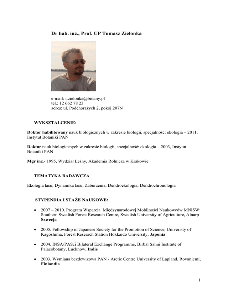 Dr hab. inż., Prof. UP Tomasz Zielonka e-mail: [email protected] tel.: 12 662 78 23 adres: ul. Podchorążych 2, pokój 207N WYKSZTAŁCENIE: Doktor habilitowany nauk biologicznych w zakresie biologii, specjalność: ekologia – 2011, Instytut Botaniki PAN Doktor nauk biologicznych w zakresie biologii, specjalność: ekologia – 2003, Instytut Botaniki PAN Mgr inż.- 1995, Wydział Leśny, Akademia Rolnicza w Krakowie TEMATYKA BADAWCZA Ekologia lasu; Dynamika lasu; Zaburzenia; Dendroekologia; Dendrochronologia STYPENDIA I STAŻE NAUKOWE: • 2007 – 2010. Program Wsparcia Międzynarodowej Mobilności Naukowców MNiSW: Southern Swedish Forest Research Centre, Swedish University of Agriculture, Alnarp Szwecja • 2005. Fellowship of Japanese Society for the Promotion of Science, Univeristy of Kagoshima, Forest Research Station Hokkaido University, Japonia • 2004. INSA/PASci Bilateral Exchange Programme, Birbal Sahni Institute of Palaeobotany, Lucknow, Indie • 2003. Wymiana bezdewizowa PAN - Arctic Centre University of Lapland, Rovaniemi, Finlandia 1 • 2003. W ramach projektu SUFOR, Southern Swedish Forest Research Centre, Swedish University of Agriculture, Alnarp Szwecja • 2000. W ramach programu NATO „Effects of Air Pollution on Forest Health and Biodiversity in Forests of the Carpathian Mountains”, Dept. of Natural Resources, University of Missouri, Columbia, USA • 1999. Stypendium “Visby Programme” Svenska Institutet, Southern Swedish Forest Research Centre, Swedish University of Agriculture, Alnarp, Szwecja • 1998. W ramach wymiany bezdewizowej PAN Arctic Centre, University of Lapland, Rovaniemi, Finlandia. • 1997 . W ramach wymiany bezdewizowej PAN, - Dept. of Vegetational Ecology, Swedish University of Agricultural Sciences, Umea, Szwecja KIEROWNIK PROJEKTÓW BADAWCZYCH KBN / MNiSW / NCN: • Projekt nr N N309 711240: Dendroekologiczna rekonstrukcja historii wiatrowałów w karpackich borach świerkowych (2011 – 2014) • Projekt nr N N304 2366 33: Struktura i funkcjonowanie pierwotnego lasu urwiskowego – adaptacje drzew do życia w ekstremalnych warunkach siedliskowych (01.10.2007 – 18.08.2011) • Projekt nr 2P04F 008 26: Dynamika i pochodzenie martwego drewna w potokach górskich Tatr (01.04.2004 - 30.03.2007) • Projekt nr 6P04F 017 19: Tempo dekompozycji martwego drewna a odnowienie i sukcesja roślinna w świerkowych borach górnoreglowych (01.09.2000 - 28.02.2003) • Projekt nr 6P04F 024 15: Struktura wiekowa i przestrzenna oraz procesy odnawiania w naturalnych borach górnoreglowych w Tatrańskim Parku Narodowym (01.09.1998 30.01.2000) WYKAZ WAŻNIEJSZYCH PUBLIKACJI Żywiec M., Zielonka T. 2013. Does a heavy fruit crop reduce the tree ring increment? Results from a 12-year study in a subalpine zone. Trees –Structure and Function 27: 13651373. Zielonka T., Holeksa J., Fleischer P., Kapusta P. 2010. A tree-ring reconstruction of wind disturbances in the mountain forest of the Slovakian Tatra Mountains, Western Carpathians. Journal of Vegetation Science 21: 31-42. Zielonka T., Malcher P. 2009 The dynamics of a mountain mixed forest under wind disturbances in the Tatra Mountains, central Europe — a dendroecological reconstruction. Canadian Journal of Forest Research 39(11): 2215-2223. 2 Zielonka T., Holeksa, J. Malcher, P. 2009. Disturbance events in a mixed spruce larch forest in the Tatra Mts., Western Carpathians – a tentative reconstruction. Baltic Forestry. Vol. 15, 2(29): 161-167. Niklasson M., Drobyshev I., Zielonka T. 2010. A 400-year history of fires on lake islands in south-east Sweden. International Journal of Wildland Fire 19(8): 1050-1058. Niklasson M, Zin E., Zielonka T., Feijen M., Korczyk A.F., Churski M., Samojlik T., Jędrzejewska B., Gutowski J.M., Brzeziecki B. 2010. A 350-year tree-ring fire record from Białowieża Primeval Forest, Poland – implication for central European lowland fire history. Journal of Ecology 98: 1319-1329. Zielonka T., Holeksa J., Ciapała S. 2008. A reconstruction of flood events using scarred trees in the Tatra Mountains, Poland. Dendrochronologia 26: 173-183. Holeksa J., Zielonka T., Żywiec M. 2008. Modeling the decay of coarse woody debris in a subalpine Norway spruce forest of the West Carpathians, Poland. Canadian Journal of Forest Research 38(3): 415-428. Zielonka T. 2006. When does dead wood turn into a substrate for spruce replacement? Journal of Vegetation Science. 17(6): 739-746. Zielonka T. 2006. Quantity and decay stages of coarse woody debris in old-growth subalpine spruce forests of the western Carpathians, Poland. Canadian Journal of Forest Research. 36 (10): 2614-2622. Zielonka T., Piątek G. 2004. The herb and dwarf shrubs colonization of decaying logs in subalpine forest in the Polish Tatra Mountains. Plant Ecology 172 (1): 63-72. Muzika R.M., Guyette R., Zielonka T., Liebhold A. 2004. The influence of O3 and SO2 on growth of Picea abies and Fagus sylvatica in the Carpathian Mountains. Environmental Pollution 130: 65-71. Holeksa J., Zielonka T., Żywiec M., Fleischer P. 2011. Disturbance history before 2004 in the area of the large windstorm „Velka Kalamita” [W: P. Fleisher, Z. Homolova (red.) Štúdie o Tatranskom Národnom Parku 10(43), Podtatranské noviny, Poprad: 25-35] Zielonka T., Holeksa J., Ciapała S. 2010. A 100-year history of floods determined from treerings in a small mountain stream in the Tatra Mts., Poland. [W: M. Stoffel et al. (red.) Tree Rings and Natural Hazards: A State-of-the-Art, Advances in Global Change Research 41, Springer Science + Business Media: 263-275.] Zielonka T., Holeksa J., Fleischer P. An abrupt growth release as an indicator of past disturbances in a spruce forest in the High Tatras [W: R. Kaczka et al. (red.) TRACE – Tree Rings in Archaeology, Climatology and Ecology, Vol.7, Potsdam: 158-163.] Holeksa J., Żywiec M., Parusel J., Szewczyk J., Zielonka T. 2008. Subalpine spruce forests in the Babia Góra National Park. [W: M. Saniga 