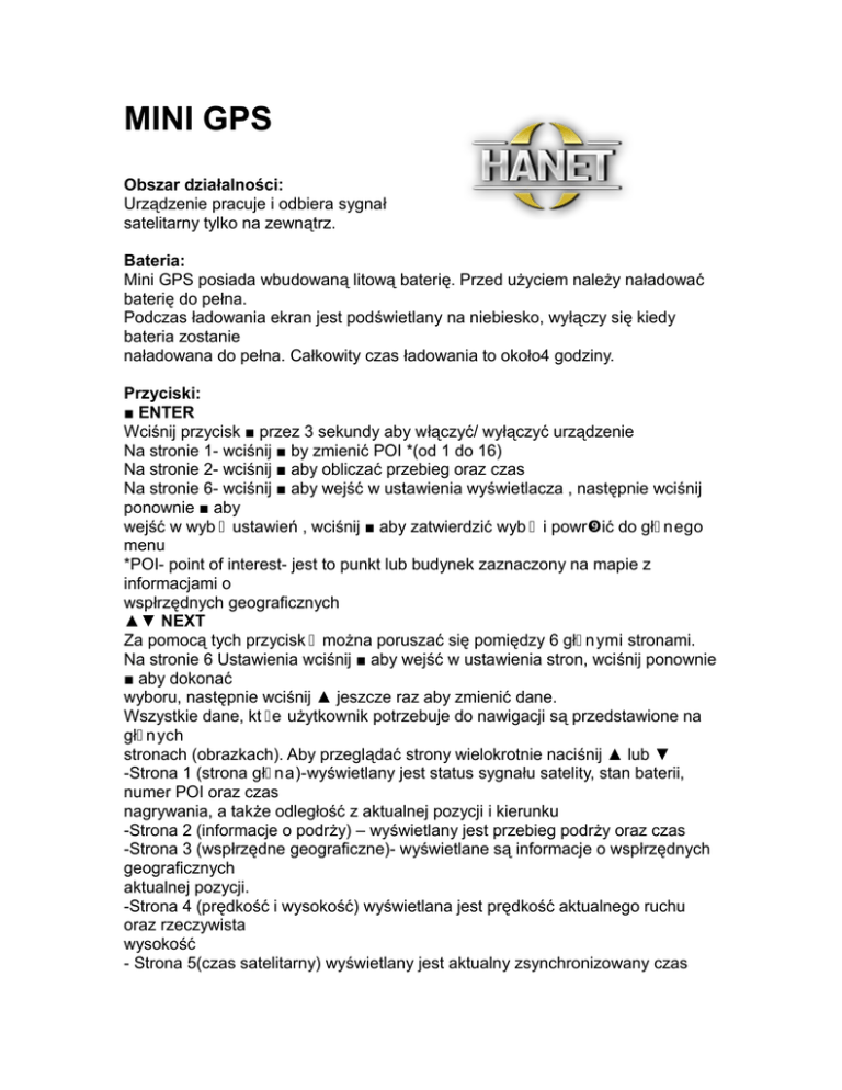MINI GPS Obszar działalności: Urządzenie pracuje i odbiera sygnał satelitarny tylko na zewnątrz. Bateria: Mini GPS posiada wbudowaną litową baterię. Przed użyciem należy naładować baterię do pełna. Podczas ładowania ekran jest podświetlany na niebiesko, wyłączy się kiedy bateria zostanie naładowana do pełna. Całkowity czas ładowania to około4 godziny. Przyciski: ■ ENTER Wciśnij przycisk ■ przez 3 sekundy aby włączyć/ wyłączyć urządzenie Na stronie 1- wciśnij ■ by zmienić POI *(od 1 do 16) Na stronie 2- wciśnij ■ aby obliczać przebieg oraz czas Na stronie 6- wciśnij ■ aby wejść w ustawienia wyświetlacza , następnie wciśnij ponownie ■ aby wejść w wyb ustawień , wciśnij ■ aby zatwierdzić wyb i powrić do gł nego menu *POI- point of interest- jest to punkt lub budynek zaznaczony na mapie z informacjami o wspłrzędnych geograficznych ▲▼ NEXT Za pomocą tych przycisk można poruszać się pomiędzy 6 gł n ymi stronami. Na stronie 6 Ustawienia wciśnij ■ aby wejść w ustawienia stron, wciśnij ponownie ■ aby dokonać wyboru, następnie wciśnij ▲ jeszcze raz aby zmienić dane. Wszystkie dane, kt e użytkownik potrzebuje do nawigacji są przedstawione na gł n ych stronach (obrazkach). Aby przeglądać strony wielokrotnie naciśnij ▲ lub ▼ -Strona 1 (strona gł na)-wyświetlany jest status sygnału satelity, stan baterii, numer POI oraz czas nagrywania, a także odległość z aktualnej pozycji i kierunku -Strona 2 (informacje o podrży) – wyświetlany jest przebieg podrży oraz czas -Strona 3 (wspłrzędne geograficzne)- wyświetlane są informacje o wspłrzędnych geograficznych aktualnej pozycji. -Strona 4 (prędkość i wysokość) wyświetlana jest prędkość aktualnego ruchu oraz rzeczywista wysokość - Strona 5(czas satelitarny) wyświetlany jest aktualny zsynchronizowany czas satelitarny - Strona 6 (ustawienia) Włączanie/ wyłączanie Aby włączyć urządzenie należy przytrzymać ■ przez 3 sekundy. Na wyświetlaczu pojawi się chwile napis Mini GPS , a następnie strona gł na. Aby wyłączyć urządzenie należy przytrzymać ■ przez 3 sekundy. A. Ustawienia POI 1.W otwartej przestrzeni przytrzymaj urządzenie kierując je prosto i w g ę, następnie włącz urządzenie. Po wejściu w stronę gł n ą w lewym g nym rogu widoczny będzie status sygnału. Brak kresek oznacza brak sygnału. Jedna kreska oznacza przechwytywanie sygnału z 3 satelit, 2 kreski z 4 satelit, 3 kreski z 5 satelit, 4 z 6 lub więcej satelit. Aby ustawić dokładny punkt POI, muszą być co najmniej 2 kreski zasięgu-więcej kresek to większa dokładność.”Zimne uruchomienie” oznacza uruchomienie urządzenia w nowym miejscu lub uruchomieni po długim czasie nieużywania urządzenia- urządzenie przechwyci sygnał satelitarny po około 2 minutach. „Ciepłe uruchomienie” oznacza uruchomienie po niewielkich zmiany położenia lub nie używaniu urządzenia więcej niż 2 godziny- urządzenie przechwyci sygnał satelitarny po 40 sekundach. „Gorące uruchomienie” oznacza uruchomienie po wyłączeniu urządzenia lub po kr kiej stracie sygnału-urządzenie przechwyci sygnał satelitarny po 2 sekundach. 2.Podczas gdy widoczne są 2 lub więcej kreski zasięgu przytrzymaj jednocześnie ■ oraz ▲ lub ▼ aby potwierdzić pierwszy punkt POI. Numer POI pokaże się po lewej stronie ekranu , natomiast data oraz czas po prawej stronie. Użytkownik za pomocą wskazanych kierunk i odległości może wrić do pierwotnej pozycji lub dotrzeć do wybranego celu. 3.Wciśnij ■ aby zmienić POI, ponownie jednocześnie przytrzymaj ■ oraz ▲ lub ▼ aby zatwierdzić drugi POI, następnie postępuj jeden po drugim 1,2,.....16. 4.Przytrzymaj ▼lub ▲ przez 3 sekundy aby wejść we wspłrzędne geograficzne. Pierwsza cyfra będzie podświetlona na biało, następnie wielokrotnie wciśnij ▲lub ▼ aby przejść do zmiany cyfr, wielokrotnie naciśnij ▼ lub ▲ aby zmienić numer od 1-9. N- oznacza płnocną szerokość geograficzną, S- południową szerokość geograficzną, E- wschodnią długość geograficzną , Wzachodnią długość geograficzną. Użytkownik może dowiedzieć się o wspłrzędnych geograficznych z bezpłatnych map Google a następnie wprowadzić dane do urządzenia. Po ustawieniu, przytrzymaj ▲ lub ▼ przez 3 sekundy, następnie wrć do strony gł nej. Urządzenie automatycznie powri do strony gł nej jeśli nie będzie wykonywana żadna operacja przez 10 sekund. Aby uniknąć utratę danych możesz przed wyjazdem zapisać ważne wspłrzędne geograficzne w urządzeniu .Możesz r nie ż sprawdzić odległość i kierunek w każdym czasie podczas podrży. B. Informacje o podrży Należy w menu - obrazek nr 2 (Trip Information), nacisnąć ■. Obok paska zasięgu pojawi się mała ikonka przedstawiająca człowieka, rozpocznie się liczenie przebytej drogi (w km) i czasu. Po ponownym naciśnięciu ■, ikona zniknie a naliczanie kilometr zostanie zatrzymane. C. Wspłrzędne geograficzne Aby zobaczyć wspłrzędne geograficzne miejsca, w kt ym obecnie si ę znajdujesz należy wejść w menu – obrazek nr 3 , na ekranie pojawią się dane – długość i szerokość geograficzna. D. Prędkość i wysokość Aby wyświetlić informacje o prędkości i wysokości obecnej pozycji należy wejść w menu – obrazek nr 4. Dane zostaną wyświetlone na ekranie gps. E. Czas satelitarny W menu – obrazek nr 5, wyświetla się aktualny czas satelitarny. Domyślna strefa czasowa Pekin +8h. F. Ustawienia Aby wejść w ustawienia należy w menu gł n ym – obrazek nr 6 (Setting), nacisnąć ■ - obrazek z napisem setting zostanie podświetlony. Strzałkami ▲ i ▼ posługujemy się by wybrać interesującą nas opcję ustawień: język, podświetlenie, strefa czasowa, jednostka miary, usuwanie ustawień POI, „zimny” start, przywrenie ustawień domyślnych. Jeżeli w ciągu 5 sek. żadna operacja nie zostan