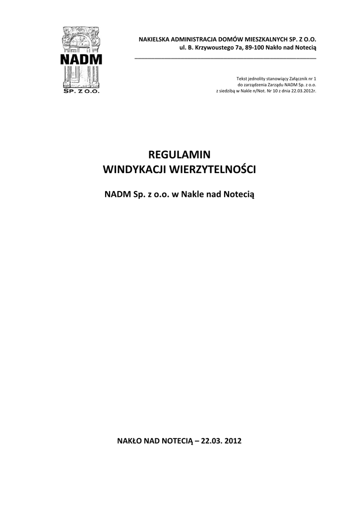 NAKIELSKA ADMINISTRACJA DOMÓW MIESZKALNYCH SP. Z O.O. ul. B. Krzywoustego 7a, 89-100 Nakło nad Notecią _______________________________________________________ Tekst jednolity stanowiący Załącznik nr 1 do zarządzenia Zarządu NADM Sp. z o.o. z siedzibą w Nakle n/Not. Nr 10 z dnia 22.03.2012r. REGULAMIN WINDYKACJI WIERZYTELNOŚCI NADM Sp. z o.o. w Nakle nad Notecią NAKŁO NAD NOTECIĄ – 22.03. 2012 SPIS TREŚCI I. ZASADY OGÓLNE. ............................................................................................................................... 3 II. POSTĘPOWANIE WINDYKACYJNE....................................................................................................... 5 PROCEDURA WINDYKACJI PRZEDSĄDOWEJ (POLUBOWNEJ). ............................................................ 7 WINDYKACJA SĄDOWA ....................................................................................................................... 7 III. AKTUALIZACJA I NIEŚCIĄGALNOŚĆ NALEŻNOŚCI ............................................................................... 8 IV. POSTANOWIENIA KOŃCOWE ............................................................................................................. 9 2 I. ZASADY OGÓLNE. §1 1. Regulamin określa sposób postępowania prowadzonego w celu skutecznego wyegzekwowania niezapłaconych w terminie należności cywilnoprawnych stanowiących przychód Gminy, oraz Spółki NADM. 2. Regulamin systematyzuje czynności windykacyjne w Spółce NADM podejmowane w stosunku do należności pieniężnych mających charakter cywilnoprawny. Regulaminem objęte są czynności windykacji należności głównej oraz kosztów ubocznych, tj. odsetek od nieterminowych wpłat, kosztów postępowania windykacyjnego, w tym sądowego oraz kosztów egzekucyjnych. 3. Przedmiotem niniejszej pragmatyki jest także procedura stosowania windykacji lokali w drodze eksmisji. §2 1. Podstawy wszczęcia postępowania windykacyjnego przez NADM sp. z o. o. stanowią: pełnomocnictwo udzielone Prezesowi Zarządu przez Gminę; postanowienia zapisane w § 8 umowy o zarządzanie i administrowanie zasobem mieszkaniowym Gminy Nakło nad Notecią; zarządzenie Burmistrza Nakła nad Notecią w sprawie ustalania opłat za użytkowanie lokali; zarządzenie Burmistrza Nakła nad Notecią w sprawie zasad umarzania, odraczania terminu zapłaty oraz rozkładania na raty wierzytelności Gminy Nakło nad Notecią z tytułu czynszów najmu, dzierżawy nieruchomości i lokali należących do zasobu mieszkaniowego Gminy Nakło nad Notecią oraz opłat niezależnych od właściciela w rozumieniu przepisów zdefiniowanych ustawą z dnia 21 czerwca 2001r. o ochronie praw lokatorów, mieszkaniowym zasobie gminy i o zmianie Kodeksu cywilnego (tj. Dz. U. z 2005 r. Nr 31, poz. 266 z późn. zm.) oraz inne przepisy ogólnie obowiązujące. 2. Postanowienia Regulaminu mają zastosowanie w szczególności do wierzytelności powstałych z tytułu: a) opłat należnych od najemców lokali mieszkalnych będących własnością Gminy Nakło nad Notecią oraz w zarządzie NADM Sp. z o. o. związanych z eksploatacją i utrzymaniem; b) opłat należnych od najemców (dzierżawców) lokali użytkowych, pomieszczeń gospodarczych, gruntów pod dzierżawę, garaży, miejsc parkingowych, wiat, itp. będących własnością Gminy Nakło nad Notecią w zarządzie NADM Sp. z o. o. oraz Spółki; c) opłat należnych z tytułu umownego jak i bezumownego zajmowania lokali mieszkalnych i użytkowych oraz pozostałych użytkowników mienia Spółki i Gminy; d) eksmisji z lokali stanowiących własność Gminy Nakło nad Notecią lub NADM sp. z o.o. 3. Za opłaty należne solidarnie z najemcami, użytkownikami lokali odpowiadają stale zamieszkujące z nimi w lokalu osoby pełnoletnie, z wyjątkiem pełnoletnich zstępnych pozostających na ich utrzymaniu, a także osoby faktycznie korzystające z lokalu. 4. Odpowiedzialność osób, o których mowa w ust 3, ogranicza się do wysokości opłat należnych za okres ich stałego zamieszkiwania lub faktycznego korzystania z lokalu. §3 Ilekroć w regulaminie jest mowa o: 1) Spółce - rozumie się przez to Nakielską Administrację Domów Mieszkalnych Spółka z ograniczoną odpowiedzialnością. 2) Gminie – rozumie się przez to Gminę Nakło nad Notecią. 3) Wierzytelności – rozumie się wymagalną kwotę wynikającą z obowiązujących w tym zakresie przepisów ustanowionych przez Gminę i Spółkę, przy czym w przypadku zaległości, tj. należności nie opłaconych w terminie płatności, do wierzytelności zalicza się ponadto odsetki 3 za zwłokę w ustawowej wysokości i ewentualne koszty upomnień, koszty sądowe oraz egzekucyjne. 4) Dłużniku - rozumie się przez to osobę/podmiot, wobec którego Spółka posiada wymagalną wierzytelność wynikającą z nieterminowego regulowania przez tą osobę/podmiot zobowiązań wobec Gminy oraz Spółki. 5) Odroczeniu terminu płatności – rozumie się pisemną zgodę na przesunięcie terminu zapłaty należności (wynikających z zawartej ugody, zgody na rozłożenie na raty, itp.) na wniosek złożony przed upływem obowiązującego terminu jej zapłaty. 6) Ważnym interesie dłużnika – rozumie się sytuacje dłużnika - nadzwyczajne wypadki losowe, które uniemożliwiają uregulowanie wierzytelności. Muszą one być efektem czynników obiektywnych, a nie działania samego zobowiązanego. Trudności te muszą pojawić się nagle i niespodziewanie, przy ocenie bierze się pod uwagę całokształt sytuacji życiowej- nie tylko warunki finansowe, ale również stan zdrowia, sytuację rodzinną, możliwości zarobkowe, zdarzenia losowe. 7) Dokumentach niezbędnych do zawarcia ugody – rozumie się dokumenty finansowe (np. informacja o zarobkach, rencie, emeryturze, zeznaniu rocznym PIT, sprawozdaniu o wynikach finansowych prowadzonej działalności gospodarczej, oświadczenie o źródłach dochodu – w