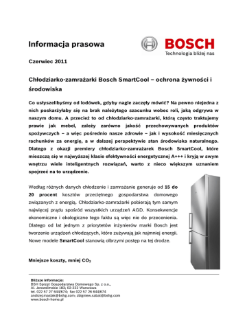 Informacja prasowa Czerwiec 2011 Chłodziarko-zamrażarki Bosch SmartCool – ochrona żywności i środowiska Co usłyszelibyśmy od lodówek, gdyby nagle zaczęły mówić? Na pewno niejedna z nich poskarżyłaby się na brak należytego szacunku wobec roli, jaką odgrywa w naszym domu. A przecież to od chłodziarko-zamrażarki, którą często traktujemy prawie jak mebel, zależy zarówno jakość przechowywanych produktów spożywczych – a więc pośrednio nasze zdrowie – jak i wysokość miesięcznych rachunków za energię, a w dalszej perspektywie stan środowiska naturalnego. Dlatego z okazji premiery chłodziarko-zamrażarek Bosch SmartCool, które mieszczą się w najwyższej klasie efektywności energetycznej A+++ i kryją w swym wnętrzu wiele inteligentnych rozwiązań, warto z nieco większym uznaniem spojrzeć na to urządzenie. Według różnych danych chłodzenie i zamrażanie generuje od 15 do 20 procent kosztów przeciętnego gospodarstwa domowego związanych z energią. Chłodziarko-zamrażarki pobierają tym samym najwięcej prądu spośród wszystkich urządzeń AGD. Konsekwencje ekonomiczne i ekologiczne tego faktu są więc nie do przecenienia. Dlatego od lat jednym z priorytetów inżynierów marki Bosch jest tworzenie urządzeń chłodzących, które zużywają jak najmniej energii. Nowe modele SmartCool stanowią olbrzymi postęp na tej drodze. Mniejsze koszty, mniej CO2 Bliższe informacje: BSH Sprzęt Gospodarstwa Domowego Sp. z o.o., Al. Jerozolimskie 183; 02-222 Warszawa tel. 022 57 27 644/674; fax 022 57 26 644/674 [email protected]; [email protected] www.bosch-home.pl Skalę innowacyjności nowych chłodziarko-zamrażarek marki Bosch najlepiej ilustruje porównanie z modelami innych klas. Wybierając SamartCool ze znaczkiem A+++ zużyjemy aż o połowę energii mniej w stosunku do klasy A, w skali roku zaoszczędzimy ok. 130 PLN i pozwolimy odetchnąć pięciu drzewom, które nie będą musiały neutralizować 75 kg CO2. A wszystko to dzięki nowatorskim rozwiązaniom technologicznym, które obejmują m.in. wysoce wydajny kompresor, lepszą izolację czy zoptymalizowaną pozycję i geometrię parownika. Większy komfort, lepsza ochrona żywności Oczywiście nowe chłodziarko-zamrażarki marki Bosch oferują również wiele rozwiązań, które zapewniają jeszcze lepszą ochronę żywności i komfort użytkowania. Do tej pierwszej kategorii należy niewątpliwie zaliczyć szuflady ChillerBox i CrisperBox, które pozwalają na dłuższe zachowanie świeżości ryb, mięsa, serów i wędlin (w szufladzie ChillerBox) oraz owoców i warzyw (w szufladzie CrisperBox). Lepsze warunki dla przechowywania żywności gwarantuje ponadto system LowFrost, który znacząco ogranicza tworzenie się lodu w zamrażarce, dzięki czemu urządzeń SmartCool nie trzeba tak często rozmrażać, co chroni produkty i nie podnosi zużycia energii. Wyjątkowo inteligentnym i przyjaznym dla użytkownika rozwiązaniem jest także innowacyjny system FlexShelf, którego konstrukcja polega na ruchomym połączeniu specjalnymi klamrami dwóch różnych półek (szklanej i z tworzywa sztucznego), co pozwala na ich wygodne składanie i rozkładanie oraz gwarantuje dodatkową elastyczność w zagospodarowywaniu wnętrza lodówki. Wygoda sterowania to natomiast zasługa nowatorskiego panelu TouchControl, który jest nie tylko wyjątkowo intuicyjny w obsłudze, lecz pozwala dodatkowo na oddzielne sterowanie Bliższe informacje: BSH Sprzęt Gospodarstwa Domowego Sp. z o.o., Al. Jerozolimskie 183; 02-222 Warszawa tel. 022 57 27 644/674; fax 022 57 26 644/674 [email protected]; [email protected] www.bosch-home.pl chłodziarką i zamrażarką. Jeżeli zaś wybieramy się na dłuższe wakacje, SmartCool daje nam możliwość wyłączenia chłodziarki niezależnie od zamrażarki. [3.191 znaków ze spacjami] W 2011 r. grupa Bosch obchodzi jubileusz 125-lecia istnienia, zaś od ponad 75 lat nazwa Bosch jest synonimem najwyższego poziomu technologii, jakości i niezawodności także w zakresie sprzętu gospodarstwa domowego. Już założyciel firmy - Robert Bosch, kierował się w swym życiu obowiązującą do dziś zasadą „Wolę stracić pieniądze niż Wasze zaufanie.“ Tradycja ta wciąż zobowiązuje i motywuje przedsiębiorstwo do dalszych wysiłków: Bosch jest liderem na polskim i europejskim rynku sprzętu gospodarstwa domowego, zaś urządzenia AGD z logo Bosch są dostępne na całym świecie. Produkty te od wielu pokoleń ułatwiają codzienne obowiązki domowe milionów ludzi i poprawiają jakość ich życia. Dążenie do osiągnięcia doskonałych rozwiązań technicznych znajduje wyraźne odzwierciedlenie nie tylko w niezrównanej funkcjonalności i wydajności urządzeń, lecz również w wyróżnionej wieloma nagrodami stylistyce. Pełen szacunku stosunek do człowieka i przyrody, który od lat należy do podstawowych zasad firmy, jest natomiast widoczny w produktach – energooszczędnych, trwałych, chroniących zasoby naturalne i tworzonych zgodnie z zasadami zrównoważonego rozwoju. Więcej informacji na: www.bosch-home.pl Podstawowe dane wybranych modeli chłodziarko-zmarażarek SmartCool: o Symbol: KGE39AI40 o Klasa efektywności energetycznej: A+++ o Pojemność całkowita: 339 L o Poziom hałasu: 38 dB o Wymiary (WxSxG): 2010x700x650 mm o Kolor: stal szlachetna (drzwi), inox (boki) o Cena: 3899 zł o Symbol: KGE39AL40 o Klasa efektywności energetycznej: A+++ o Pojemność całkowita: 339 L o Poziom hałasu: 38 dB o Wymiary (WxSxG): 2010x600x650 mm o Kolor: inox (drzwi), inox (boki) o Cena: 3799 zł Bliższe informacje: BSH Sprzęt Gospodarstwa Domowego Sp. z o.o., Al. Jerozolimskie 183; 02-222 Warszawa tel. 022 57 27 644/674; fax 022 57 26 644/674 [email protected]; [email protected] www.bosch-home.pl