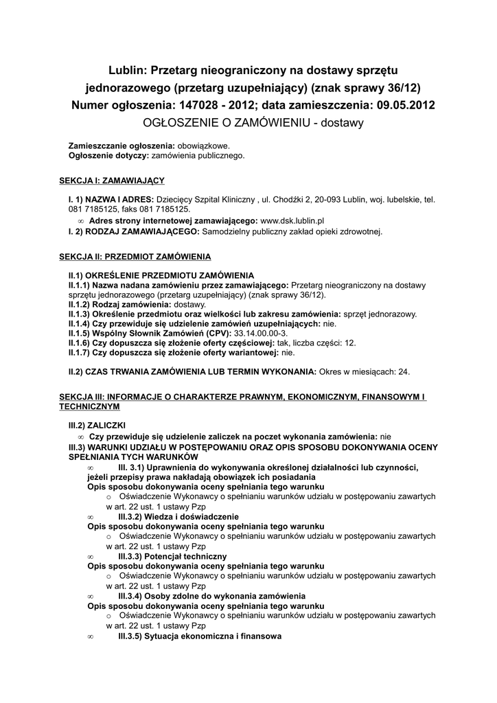 Lublin: Przetarg nieograniczony na dostawy sprzętu jednorazowego (przetarg uzupełniający) (znak sprawy 36/12) Numer ogłoszenia: 147028 - 2012; data zamieszczenia: 09.05.2012 OGŁOSZENIE O ZAMÓWIENIU - dostawy Zamieszczanie ogłoszenia: obowiązkowe. Ogłoszenie dotyczy: zamówienia publicznego. SEKCJA I: ZAMAWIAJĄCY I. 1) NAZWA I ADRES: Dziecięcy Szpital Kliniczny , ul. Chodźki 2, 20-093 Lublin, woj. lubelskie, tel. 081 7185125, faks 081 7185125. • Adres strony internetowej zamawiającego: www.dsk.lublin.pl I. 2) RODZAJ ZAMAWIAJĄCEGO: Samodzielny publiczny zakład opieki zdrowotnej. SEKCJA II: PRZEDMIOT ZAMÓWIENIA II.1) OKREŚLENIE PRZEDMIOTU ZAMÓWIENIA II.1.1) Nazwa nadana zamówieniu przez zamawiającego: Przetarg nieograniczony na dostawy sprzętu jednorazowego (przetarg uzupełniający) (znak sprawy 36/12). II.1.2) Rodzaj zamówienia: dostawy. II.1.3) Określenie przedmiotu oraz wielkości lub zakresu zamówienia: sprzęt jednorazowy. II.1.4) Czy przewiduje się udzielenie zamówień uzupełniających: nie. II.1.5) Wspólny Słownik Zamówień (CPV): 33.14.00.00-3. II.1.6) Czy dopuszcza się złożenie oferty częściowej: tak, liczba części: 12. II.1.7) Czy dopuszcza się złożenie oferty wariantowej: nie. II.2) CZAS TRWANIA ZAMÓWIENIA LUB TERMIN WYKONANIA: Okres w miesiącach: 24. SEKCJA III: INFORMACJE O CHARAKTERZE PRAWNYM, EKONOMICZNYM, FINANSOWYM I TECHNICZNYM III.2) ZALICZKI • Czy przewiduje się udzielenie zaliczek na poczet wykonania zamówienia: nie III.3) WARUNKI UDZIAŁU W POSTĘPOWANIU ORAZ OPIS SPOSOBU DOKONYWANIA OCENY SPEŁNIANIA TYCH WARUNKÓW • III. 3.1) Uprawnienia do wykonywania określonej działalności lub czynności, jeżeli przepisy prawa nakładają obowiązek ich posiadania Opis sposobu dokonywania oceny spełniania tego warunku o Oświadczenie Wykonawcy o spełnianiu warunków udziału w postępowaniu zawartych w art. 22 ust. 1 ustawy Pzp • III.3.2) Wiedza i doświadczenie Opis sposobu dokonywania oceny spełniania tego warunku o Oświadczenie Wykonawcy o spełnianiu warunków udziału w postępowaniu zawartych w art. 22 ust. 1 ustawy Pzp • III.3.3) Potencjał techniczny Opis sposobu dokonywania oceny spełniania tego warunku o Oświadczenie Wykonawcy o spełnianiu warunków udziału w postępowaniu zawartych w art. 22 ust. 1 ustawy Pzp • III.3.4) Osoby zdolne do wykonania zamówienia Opis sposobu dokonywania oceny spełniania tego warunku o Oświadczenie Wykonawcy o spełnianiu warunków udziału w postępowaniu zawartych w art. 22 ust. 1 ustawy Pzp • III.3.5) Sytuacja ekonomiczna i finansowa Opis sposobu dokonywania oceny spełniania tego warunku o Oświadczenie Wykonawcy o spełnianiu warunków udziału w postępowaniu zawartych w art. 22 ust. 1 ustawy Pzp III.4) INFORMACJA O OŚWIADCZENIACH LUB DOKUMENTACH, JAKIE MAJĄ DOSTARCZYĆ WYKONAWCY W CELU POTWIERDZENIA SPEŁNIANIA WARUNKÓW UDZIAŁU W POSTĘPOWANIU ORAZ NIEPODLEGANIA WYKLUCZENIU NA PODSTAWIE ART. 24 UST. 1 USTAWY • III.4.1) W zakresie wykazania spełniania przez wykonawcę warunków, o których mowa w art. 22 ust. 1 ustawy, oprócz oświadczenia o spełnieniu warunków udziału w postępowaniu, należy przedłożyć: • III.4.2) W zakresie potwierdzenia niepodlegania wykluczeniu na podstawie art. 24 ust. 1 ustawy, należy przedłożyć: • oświadczenie o braku podstaw do wykluczenia • aktualny odpis z właściwego rejestru, jeżeli odrębne przepisy wymagają wpisu do rejestru, w celu wykazania braku podstaw do wykluczenia w oparciu o art. 24 ust. 1 pkt 2 ustawy, wystawiony nie wcześniej niż 6 miesięcy przed upływem terminu składania wniosków o dopuszczenie do udziału w postępowaniu o udzielenie zamówienia albo składania ofert, a w stosunku do osób fizycznych oświadczenie w zakresie art. 24 ust. 1 pkt 2 ustawy • III.4.3) Dokumenty podmiotów zagranicznych Jeżeli wykonawca ma siedzibę lub miejsce zamieszkania poza terytorium Rzeczypospolitej Polskiej, przedkłada: III.4.3.1) dokument wystawiony w kraju, w którym ma siedzibę lub miejsce zamieszkania potwierdzający, że: • nie otwarto jego likwidacji ani nie ogłoszono upadłości - wystawiony nie wcześniej niż 6 miesięcy przed upływem terminu składania wniosków o dopuszczenie do udziału w postępowaniu o udzielenie zamówienia albo składania ofert III.5) INFORMACJA O DOKUMENTACH POTWIERDZAJĄCYCH, ŻE OFEROWANE DOSTAWY , USŁUGI LUB ROBOTY BUDOWLANE ODPOWIADAJĄ OKREŚLONYM WYMAGANIOM W zakresie potwierdzenia, że oferowane dostawy, usługi lub roboty budowlane odpowiadają określonym wymaganiom należy przedłożyć: • próbki, opisy lub fotografie III.6) INNE DOKUMENTY Inne dokumenty niewymienione w pkt III.4) albo w pkt III.5) 1. Deklaracja zgodności a w przypadku posiadania innych dokumentów - dodatkowo aktualne zaświadczenia, atesty (lub inne dokumenty) świadczące o wymaganym dopuszczeniu do obrotu w Polsce przedmiotu oferty. 2. W zadaniach nr 4 do 12 należy załączyć do ofert katalogi, foldery ulotki informujące o produkcie. 3. Karty charakterystyki substancji niebezpiecznych jeśli asortyment zawiera substancje niebezpieczne. 4. Instrukcje postepowanie, obsługi oferowanego asortymentu w tym postępowanie w zakresie dezynfekcji i sterylizacji przy asortymencie wielorazowego użytku 5. Ewentualne pełnomocnictwo, jeśli uprawnienie do reprezentowania wykonawcy nie wynika z innych dokumentów załączonych przez Wykonawcę. W przypadku złożenia oferty przez kilka podmiotów występujących wspólnie (konsorcjum), należy złożyć pełnomocnictwo zawierające oświadczenia woli wszystkich członków konsorcjum, wskazujące na osobę umocowaną (np. lider, radca prawny, etc.) do reprezentowania przedsiębiorców w udziale w określonym postępowaniu o zamówienie publiczne i do ich podpisywania w jego imieniu umów. Dokument niniejszy winien wyliczać wszystkich Wykonawców wraz z ich podpisami. 6. Oświadczenie Wykonawcy o powierzeniu wykonania części zamówien