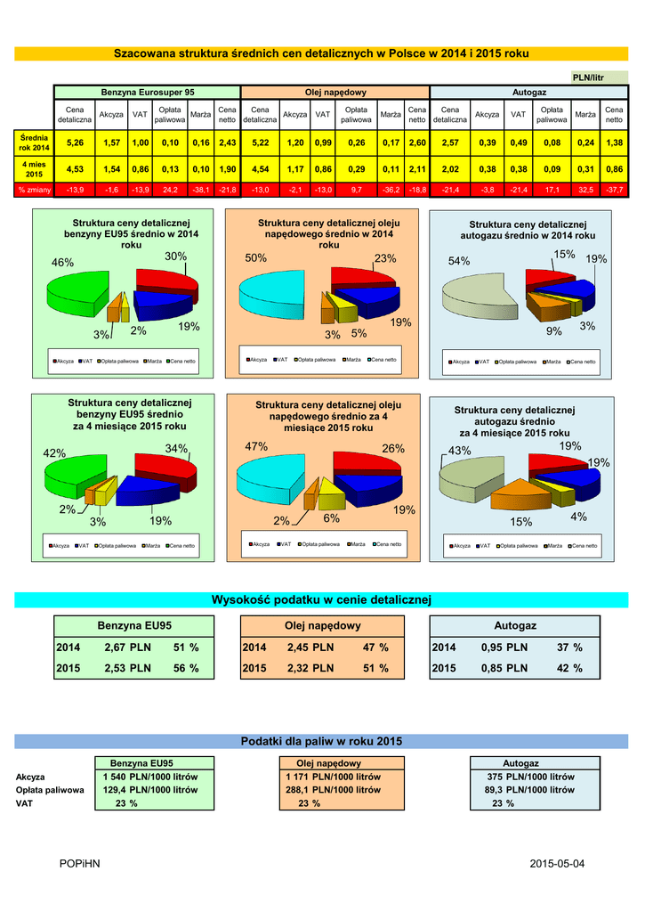 Szacowana struktura średnich cen detalicznych w Polsce w 2014 i 2015 roku PLN/litr Benzyna Eurosuper 95 Olej napędowy Opłata Cena Cena Marża Akcyza paliwowa netto detaliczna VAT Opłata paliwowa Marża Cena Cena netto detaliczna 1,20 0,99 0,26 0,17 2,60 4,54 1,17 0,86 0,29 0,11 -13,0 -2,1 -13,0 9,7 -36,2 Cena detaliczna Akcyza VAT Średnia rok 2014 5,26 1,57 1,00 0,10 0,16 2,43 5,22 4 mies 2015 4,53 1,54 0,86 0,13 0,10 1,90 % zmiany -13,9 -1,6 -13,9 24,2 -38,1 -21,8 Struktura ceny detalicznej benzyny EU95 średnio w 2014 roku 30% 46% 3% Akcyza Opłata paliwowa VAT Marża Cena netto Struktura ceny detalicznej benzyny EU95 średnio za 4 miesiące 2015 roku 34% 42% 50% VAT Opłata paliwowa Marża Cena netto 2,57 0,39 0,49 0,08 0,24 1,38 2,11 2,02 0,38 0,38 0,09 0,31 0,86 -18,8 -21,4 -3,8 -21,4 17,1 32,5 -37,7 23% Struktura ceny detalicznej autogazu średnio w 2014 roku 15% 19% 54% 19% Akcyza VAT Opłata paliwowa Marża Cena netto Struktura ceny detalicznej oleju napędowego średnio za 4 miesiące 2015 roku 47% 26% 3% 9% 3% 5% Akcyza VAT Opłata paliwowa Marża Cena netto Struktura ceny detalicznej autogazu średnio za 4 miesiące 2015 roku 19% 43% 19% 2% 3% Akcyza Akcyza Struktura ceny detalicznej oleju napędowego średnio w 2014 roku 19% 2% Autogaz VAT Opłata paliwowa 19% Marża Cena netto Akcyza 2% 6% VAT Opłata paliwowa 19% 4% 15% Marża Cena netto Akcyza VAT Opłata paliwowa Marża Cena netto Wysokość podatku w cenie detalicznej Olej napędowy Benzyna EU95 Autogaz 2014 2,67 PLN 51 % 2014 2,45 PLN 47 % 2014 0,95 PLN 37 % 2015 2,53 PLN 56 % 2015 2,32 PLN 51 % 2015 0,85 PLN 42 % Podatki dla paliw w roku 2015 Akcyza Opłata paliwowa VAT POPiHN Benzyna EU95 1 540 PLN/1000 litrów 129,4 PLN/1000 litrów 23 % Olej napędowy 1 171 PLN/1000 litrów 288,1 PLN/1000 litrów 23 % Autogaz 375 PLN/1000 litrów 89,3 PLN/1000 litrów 23 % 2015-05-04