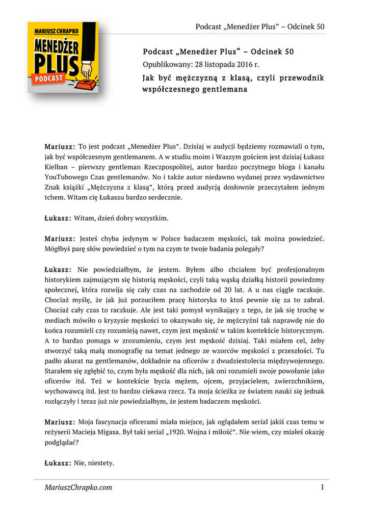 Podcast „Menedżer Plus” – Odcinek 50 Podcast „Menedżer Plus“ – Odcinek 50 Opublikowany: 28 listopada 2016 r. Jak być mężczyzną z klasą, czyli przewodnik współczesnego gentlemana M ariusz: To jest podcast „Menedżer Plus”. Dzisiaj w audycji będziemy rozmawiali o tym, jak być współczesnym gentlemanem. A w studiu moim i Waszym gościem jest dzisiaj Łukasz Kielban – pierwszy gentleman Rzeczpospolitej, autor bardzo poczytnego bloga i kanału YouTubowego Czas gentlemanów. No i także autor niedawno wydanej przez wydawnictwo Znak książki „Mężczyzna z klasą”, którą przed audycją dosłownie przeczytałem jednym tchem. Witam cię Łukaszu bardzo serdecznie. Łukasz: Witam, dzień dobry wszystkim. M ariusz: Jesteś chyba jedynym w Polsce badaczem męskości, tak można powiedzieć. Mógłbyś parę słów powiedzieć o tym na czym te twoje badania polegały? Łukasz: Nie powiedziałbym, że jestem. Byłem albo chciałem być profesjonalnym historykiem zajmującym się historią męskości, czyli taką wąską działką historii powiedzmy społecznej, która rozwija się cały czas na zachodzie od 20 lat. A u nas ciągle raczkuje. Chociaż myślę, że jak już porzuciłem pracę historyka to ktoś pewnie się za to zabrał. Chociaż cały czas to raczkuje. Ale jest taki pomysł wynikający z tego, że jak się trochę w mediach mówiło o kryzysie męskości to okazywało się, że mężczyźni tak naprawdę nie do końca rozumieli czy rozumieją nawet, czym jest męskość w takim kontekście historycznym. A to bardzo pomaga w zrozumieniu, czym jest męskość dzisiaj. Taki miałem cel, żeby stworzyć taką małą monografię na temat jednego ze wzorców męskości z przeszłości. Tu padło akurat na gentlemanów, dokładnie na oficerów z dwudziestolecia międzywojennego. Starałem się zgłębić to, czym była męskość dla nich, jak oni rozumieli swoje powołanie jako oficerów itd. Też w kontekście bycia mężem, ojcem, przyjacielem, zwierzchnikiem, wychowawcą itd. Jest to bardzo ciekawa rzecz. Ta moja ścieżka ze światem nauki się jednak rozłączyły i teraz już nie powiedziałbym, że jestem badaczem męskości. M ariusz: Moja fascynacja oficerami miała miejsce, jak oglądałem serial jakiś czas temu w reżyserii Macieja Migasa. Był taki serial „1920. Wojna i miłość”. Nie wiem, czy miałeś okazję podglądać? Łukasz: Nie, niestety. MariuszChrapko.com 1 Podcast „Menedżer Plus” Odcinek 50 M ariusz: Tam byli tacy właśnie bardzo na poziomie oficerowie – Władek Jarociński czy Józek Szymański. Tacy właśnie gentlemani, jak opowiadasz. [śmiech] Łukasz: Tak, jeśli się wejdzie w taką historię codzienną tych oficerów to tam jest mnóstwo takich przeciekawych historii, które wciągają i zachęcają do tego, żeby zgłębiać ten świat dalej i dalej. Mnie to wciągnęło akurat. M ariusz: Ja pamiętam, że też bardzo mi imponowało to, jak oni dbali o mundury, jak się ubierali. Były też pokazane sceny, jak się golili na przykład. To wszystko miało taką właściwą sobie estymę. [śmiech] Łukasz: Chodziło o to, że oni dbali po prostu o swój wizerunek, który nie był tylko ich prywatną rzeczą. A ten wizerunek był też taki wspólny dla całego korpusu oficerskiego. To zachęcało do tego, żeby z jednej strony dbać o niego, a z drugiej strony, żeby kontrolować to, co robią też koledzy po fachu. M ariusz: A skąd się wziął pomysł na to, żeby właśnie prowadzić takiego bloga, który się nazywa Czas gentlemanów? Łukasz: No właśnie stąd, że świat nauki jest daleki od rzeczywistości. To, co robią historycy czy też inni naukowcy, zwłaszcza humaniści to często są fascynujące rzeczy, ale rzadko one się przedzierają do szerokiej publiczności. Ja miałem takie wrażenie, że wiele rzeczy na które trafiam, wiele takich ciekawostek, które gdzieś tam znajduję w archiwach jest wartych tego, żeby przedstawić je komuś, żeby uratować je od zapomnienia. A jednak sama praca naukowa nie bardzo dawała mi taką możliwość. Też byłem niezadowolony z tego, jakie są efekty dotarcia do odbiorców poprzez konferencje naukowe, pisanie artykułów itd. W końcu postanowiłem, że założę bloga, żeby mieć taki wentyl do puszczania tych wszystkich ciekawostek, które gdzieś tam w głowie mi pobrzmiewały. M ariusz: Ale nazwa bloga sugeruje trochę, że to teraz jest ten moment dla gentlemanów, to teraz jest ten czas właśnie. [śmiech] Łukasz: To jest taka interpretacja już po czasie, bo blog odniósł sukces i zmienił się mocno przez prawie 6 lat. Natomiast początkowo to było tak, że myślałem tylko i wyłącznie o tych gentlemanach z dwudziestolecia międzywojennego. Tak sobie myślałem, że to był czas gentlemanów. Dlatego taka nazwa tam powstała. Przez pierwszy rok albo dwa pisałem prawie tylko o tych oficerach i gentlemanach czy też damach czasami z dwudziestolecia międzywojennego, może czasami starszych – ich wzorcach, źródłach itd. Dopiero z czasem to zaczęło się przeradzać w takie rozważania, ile z tych gentlemanów dawnych można by przenieść do dzisiejszych czasów, jakby wyglądał taki współczesny gentleman, żeby to faktycznie miało ręce i nogi, żeby był dostosowany do przemian społecznych, które MariuszChrapko.com 2 Podcast „Menedżer Plus” Odcinek 50 nastąpiły przez ostatnie 100 lat. Dzisiaj jak się wejdzie na czas gentlemanów to pobrzmiewa gdzieś ta historia w tle, ale ona już zdecydowanie nie jest na pierwszym planie. Stąd podejrzewam, że można interpretować ten tytuł, tę nazwę jako takie nawoływanie do tego może, żeby wrócił ten czas gentlemanów. M ariusz: A kto jest twoim docelowym czytelnikiem? Dla kogo piszesz tego bloga? Dla ludzi, którzy chcą nabrać trochę klasy, ogłady towarzyskiej? Łukasz: Myślę, że w znacznej mierze piszę go dla siebie, bo on jest dla mnie takim motorem dla samoro