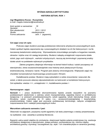 WYŻSZA SZKOŁA ARTYSTYCZNA HISTORIA SZTUKI, ROK I mgr Magdalena Kucza - Kuczyńska e-mail: magda.meissner@neostrada,pl Ilość godzin w semestrze: 18 Semestr: I Rok akademicki: 2011 / 2012 Studia: niestacjonarne Forma zaliczenia: sem. I (egzamin), Cel zajęć oraz ich opis: Podczas zajęć studenci poznają podstawowe dokonania artystyczne poszczególnych epok. Celem spotkań będzie zapoznanie się z poszczególnymi dziełami na ich tle historycznym i na tle ówczesnej świadomości estetycznej. Wprowadzenie zrozumiałego porządku w bogactwo nazwisk, okresów i stylów oraz ich zasięg terytorialny. Studenci nabędą umiejętność rozpoznania dzieła sztuki, jego cech stylowych , wartości artystycznych, nauczą się terminologii i poprawnej analizy działa sztuki na podstawie wybranych przykładów. Zakres programu obejmuje informacje na temat historii kultury i sztuki począwszy od starożytności, okres wczesnochrześcijański oraz historię sztuk plastycznych Europy średniowiecznej, renesans i barok. Program jest ułożony chronologicznie. Większość zajęć ma charakter konwersatorium ilustrowanego przeźroczami i filmami. Kształtowanie postaw: Studenci mają wykształcić w sobie zrozumienie i szacunek dla sztuki, a także poczucie własnej odpowiedzialności za twórczość w kontekście historycznym. Cel wykładów: wiedza +++, umiejętności ++, kształtowanie postaw + Harmonogram zajęć: Semestr I – praca studentów skoncentrowana będzie przede wszystkim na poznaniu podstawowych wiadomości z zakresu sztuki mezopotamskiej, egipskiej (kanon w architekturze świątynnej i w sztukach przedstawieniowych), sztuki egejskiej, sztuki starożytnej Grecji, sztuki Etrusków, sztuki rzymskiej do IV wieku n.e., wczesnochrześcijańskiej i bizantyńskiej, przedromańskiej. Celem zajęć jest poznanie podstawowej terminologii, nabycie umiejętności rozpoznawania form i estetyki poszczególnych kultur. Warunkiem zaliczenia semestru I jest: Obecność na zajęciach, pozytywny wynik egzaminu lub testu pisemnego z wiedzy prezentowanej na wykładzie oraz zawartej w podanej literaturze. Egzamin ustny-sześć slajdów do omówienia- obejmować będzie pytania przekrojowe (np. ewolucja architektury świątynnej w starożytności, dzieje portretu), porównawcze (np. różnice między architekturą grecką i rzymską) i szczegółowe (np. style i ich charakterystyka w ceramice greckiej). Egzamin przeprowadzany jest w formie ustnej i składa się z dwóch części: krótkiej analizy ikonograficznej i stylistycznej dzieł prezentowanych na 6 przeźroczach oraz obszerniejszego omówienia jednego z zagadnień historii sztuki z uwzględnieniem wiadomości z wykładów oraz podstawowej literatury na ten temat. Nieobecności –podczas zajęć w ciągu semestru można mieć 2 nieobecności; większa liczba nieobecności wymaga ważnych zwolnień lekarskich itp. Spóźnienia :(w ciągu pierwszych 15 minut od terminowego rozpoczęcia zajęć) można mieć dwa spóźnienia bez konsekwencji; kolejne traktowane są jak nieobecności. HARMONOGRAM ZAJĘĆ: Rok I semestr I [niestacjonarne] 1.Sprawy organizacyjne – zasady prowadzenia wykładu, formy zaliczeń, nieobecności, wymogi na egzaminie, omówienie bibliografii Wstęp do wykładów z historii sztuki: pierwsze zachowane dzieła sztuki, postrzeganie artysty, jego statusu w hierarchii społecznej na przestrzeni wieków, najważniejsze muzea świata, największe autorytety w dziedzinie historii sztuki Kultura i sztuka Mezopotamii Przedstawienie najstarszej cywilizacji: rozkwit miast, architektury sakralnej, rzeźby, płaskorzeźby, pismo klinowe, podstawowe materiały budowlane, wierzenia, najważniejsze zachowane dzieła. 2. Egipt – sztuka na wieczność Wykład obejmuje: hierarchiczny ustrój państwa i religia politeistyczna oraz ich bezpośredni wpływ na sztukę Egipcjan, główne zadania sztuki, prezentację i omówienie najważniejszych zabytków sztuki egipskiej w tym genezę i rozkwit architektury grobowej (mastaby, piramidy, świątynie grobowe), rzeźby sepulkralnej i oficjalnej, malowideł i reliefów. Omówione będą także osiągnięcia cywilizacyjne Egipcjan i ich wpływ na inne kultury. Sztuka Etruska Podstawowe informacje o życiu i sztuce Etrusków [ tumulusy, realizm w malarstwie] oraz ich wpływie na sztukę rzymską. Kultury Morza Egejskiego. Wykład dotyczy kultury kreteńskiej lub minojskiej na Krecie w tym przede wszystkim architektury pałacowej ( Knossos, Fajstos) a także rzeźby i malarstwa ściennego. W drugiej części wykładu: kultura mykeńska [Mykeny] a w szczególności architektura obronna. Wykład stanowi wprowadzenie do sztuki greckiej 3. O dążeniu Greków do doskonałości. Ustrój państwa [państwa – miasta], religia politeistyczna. Omówienie podziału sztuki greckiej na trzy podstawowe okresy [archaiczny, klasyczny i hellenistyczny]. Style w ceramice [geometryczny, orientalizujący, czarnofigurowy i czerwonofigurowy] i ich charakterystyka. Porządki architektoniczne [dorycki, joński i koryncki] a także pojęcia związane ze sztuką starożytnej Grecji. 4. Sztuka starożytnej Grecji Szczegółowe omówienie trzech okresów sztuki greckiej na konkretnych przykładach. Charakterystyka rzeźby na podstawie twórczości wielkich mistrzów [Praksyteles, Poliklet, Myron, Fidiasz, Lizyp]. Powstanie Akropolu i poznanie najważniejszych zabytków architektury greckiej. Początki teatru greckiego i jego rozwój. Rozwój budownictwa publicznego. Podstawowe pojęcia związane ze sztuką grecką [np. tektonika, kanon, kompozycja klasyczna]. 5. Zdobywcy świata – czyli o tym jak Rzymianie podbili świat i założyli własne imperium na ruinach królestw hellenistycznych. Założenie Rzymu, rozwiązania urbanistyczne - znaczenie struktury urbanistycznej i budowli rzymskich jako wzorca dla nowożytnych miast europejskich. główne zadania sztuki i podział na trzy główne okresy. Wykład poświęcony jest najwi