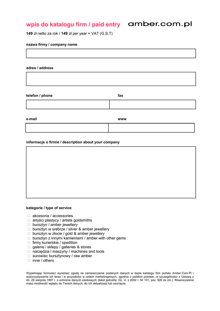 wpis do katalogu firm / paid entry 149 zł netto za rok / 149 zł per year + VAT (G.S.T) nazwa firmy / company name adres / address telefon / phone fax e-mail www informacje o firmie / description about your company kategorie / type of service akcesoria / accessories artyści plastycy / artists goldsmiths bursztyn / amber jewellery bursztyn w srebrze / silver & amber jewellery bursztyn w złocie / gold & amber jewellery bursztyn z innymi kamieniami / amber with other gems firmy kurierskie / spedition galerie i sklepy / galleries & stores narzędzia i maszyny / machines and tools surowiec bursztynowy / raw amber inne / others Wypełniając formularz wyrażasz zgodę na zamieszczenie podanych danych w bazie katalogu firm portalu Amber.Com.Pl i wykorzystywanie ich teraz i w przyszłości w celach marketingowych, zgodnie z polskim prawem, w szczególności z Ustawą z dn. 29 sierpnia 1997 r. o ochronie danych osobowych (tekst jednolity: Dz. U. z 2002 r. Nr 101, poz. 926 ze zm.). Równocześnie masz możliwość wglądu do Twoich danych, do ich aktualizacji lub usunięcia. przykład / example Galerie Boruni Boruni zaprasza do odkrycia magii bursztynu i do sprawienia sobie i bliskim prezentu w postaci precyzyjnie wykonanej biżuterii oraz przedmiotów codziennego użytku. adres: Rynek Główny 1/3 31-042 Kraków tel: +48 12 423 10 81 fax: +48 12 423 10 81 email: [email protected] website: www.boruni.pl Galerie BORUNI należące do Grupy Mikołajczyki Amber od wielu lat specjalizują się w sprzedaży biżuterii bursztynowej. Dzięki współpracy z wiodącymi w Polsce producentami biżuterii oraz znanymi artystami - plastykami oferują klientom najpiękniejsze wyroby z bursztynu oprawione w srebro Ag 925, jak również 14 i 18-karatowe złoto. Oprócz biżuterii damskiej i męskiej w galeriach BORUNI znajdziesz unikatowe wyroby użytku codziennego tj. noże do otwierania korespondencji, ozdobne łyżeczki, cukiernice, szkło oprawiane w srebro i bursztyn, perfumetki, wizytowniki, jak również piękne rzeźby bursztynowe oraz ręcznie wykonane szachy. Wyroby cechuje niepowtarzalność, autentyczność, a sposób oprawy bursztynu - "perły Bałtyku" podkreśla szlachetność jego natury. KRAKÓW Rynek Główny 1/3 - Sukiennice ul. Grodzka 60 (NEW!) ul. Floriańska 42 ul. Kanonicza 22 - nr 1 ul. Kanonicza 22 - nr 2 Sukiennice Kram: 23, 29, 36 Radisson SAS Hotel Crown Piast Hotel & Park WARSZAWA Marriott Hotel Hotel Hilton Uwaga / Attention Razem z danymi prosimy o przesłanie logo firmy. / Along with data attache logo of the company. Format: jpg lub gif / Format: jpg or gif Rozmiar logo: 250x250 pix, 72 dpi / Logo size: 250x250 pix, 72 dpi Rozmiar zdjęcia: 600x450 pix, 72 dpi / Picture's size: 600x450 pix, 72 dpi