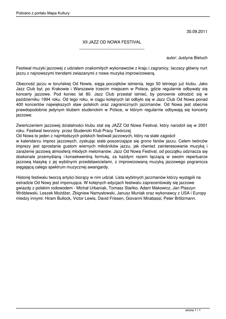 Pobrano z portalu Mapa Kultury 30.09.2011 XII JAZZ OD NOWA FESTIVAL ____________________________ autor: Justyna Bieluch Festiwal muzyki jazzowej z udziałem znakomitych wykonawców z kraju i zagranicy, laczacy główny nurt jazzu z najnowszymi trendami zwiazanymi z nowa muzyka improwizowaną. Obecność jazzu w toruńskiej Od Nowie, sięga początków istnienia, tego 50 letniego już klubu. Jako Jazz Club był, po Krakowie i Warszawie trzecim miejscem w Polsce, gdzie regularnie odbywały się koncerty jazzowe. Pod koniec lat 80. Jazz Club przestał istnieć, by ponownie odrodzić się w październiku 1994 roku. Od tego roku, w ciągu kolejnych lat odbyło się w Jazz Club Od Nowa ponad 400 koncertów największych sław polskich oraz zagranicznych jazzmanów. Od Nowa jest obecnie prawdopodobnie jedynym klubem studenckim w Polsce, w którym regularnie odbywają się koncerty jazzowe. Zwieńczeniem jazzowej działalności klubu stał się JAZZ Od Nowa Festival, który narodził się w 2001 roku. Festiwal tworzony przez Studencki Klub Pracy Twórczej Od Nowa to jeden z najmłodszych polskich festiwali jazzowych, który na stałe zagościł w kalendarzu imprez jazzowych, zyskując stale poszerzające się grono fanów jazzu. Celem twórców imprezy jest sprostanie gustom wiernych miłośników jazzu, jak również zainteresowanie muzyką i zarażenie jazzową atmosferą młodych melomanów. Jazz Od Nowa Festival, od początku odznacza się doskonale przemyślaną i konsekwentną formułą, za każdym razem łączącą w swoim repertuarze jazzową klasykę z jej wybitnymi przedstawicielami, z improwizowaną muzyką jazzowego pogranicza sięgającą całego spektrum muzycznej awangardy. Historię festiwalu tworzą artyści biorący w nim udział. Lista wybitnych jazzmanów którzy wystąpili na estradzie Od Nowy jest imponująca. W kolejnych edycjach festiwalu zaprezentowały się jazzowe gwiazdy z polskim rodowodem - Michał Urbaniak, Tomasz Stańko, Adam Makowicz, Jan Ptaszyn Wróblewski, Leszek Możdżer, Zbigniew Namysłowski, Janusz Muniak oraz wykonawcy z USA i Europy miedzy innymi: Hiram Bullock, Victor Lewis, David Friesen, Giovanni Mirabassi, Peter Brötzmann. strona 1 / 1